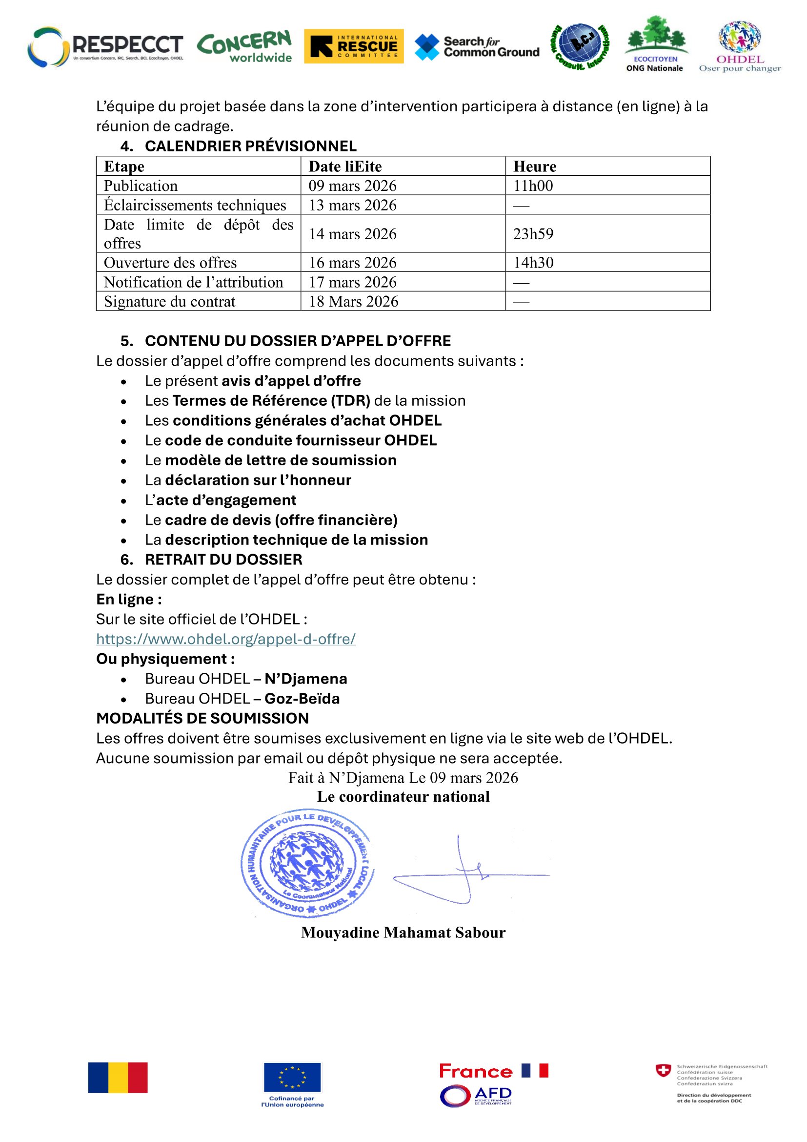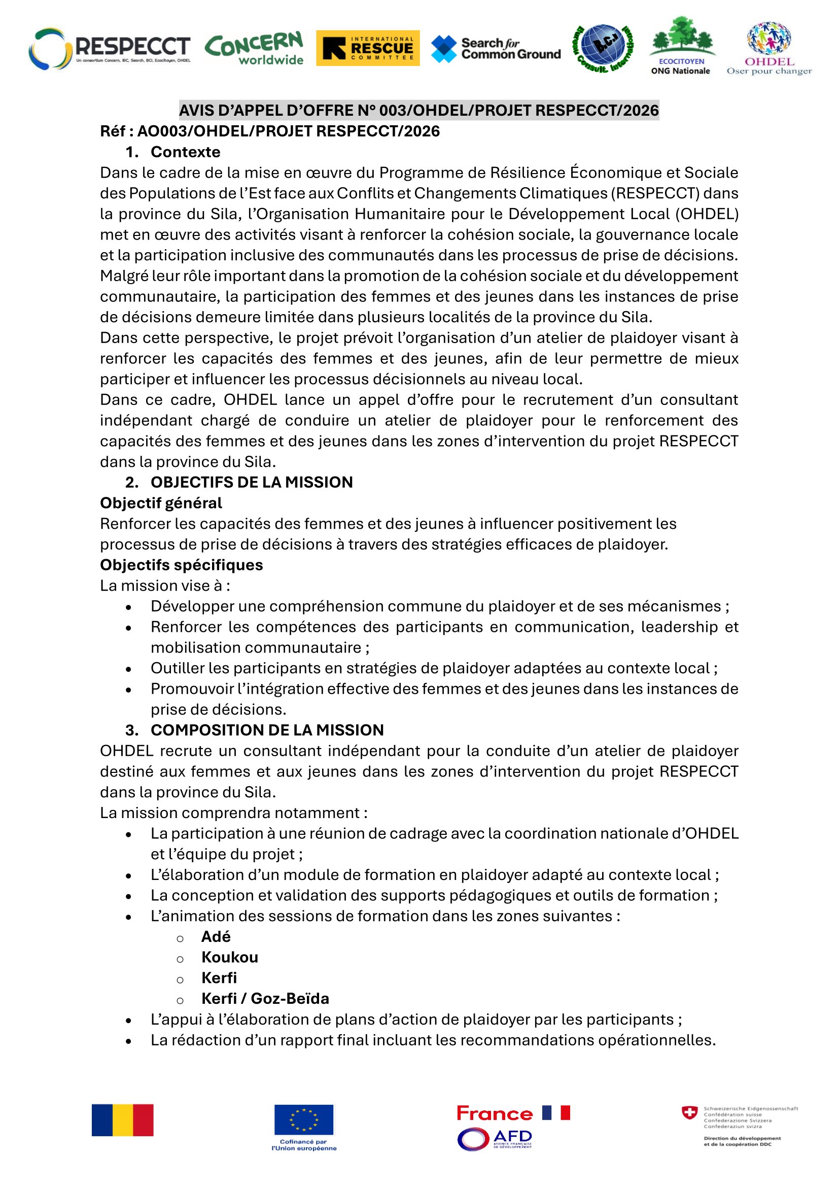 L’Organisation Humanitaire pour le Développement (OHDL) lance un appel d’offre pour le recrutement d’un consultant indépendant chargé de conduire un atelier de plaidoyer pour le renforcement des capacités des femmes et des jeunes dans les zones d’intervention du projet RESPECCT dans la province du Sila.
