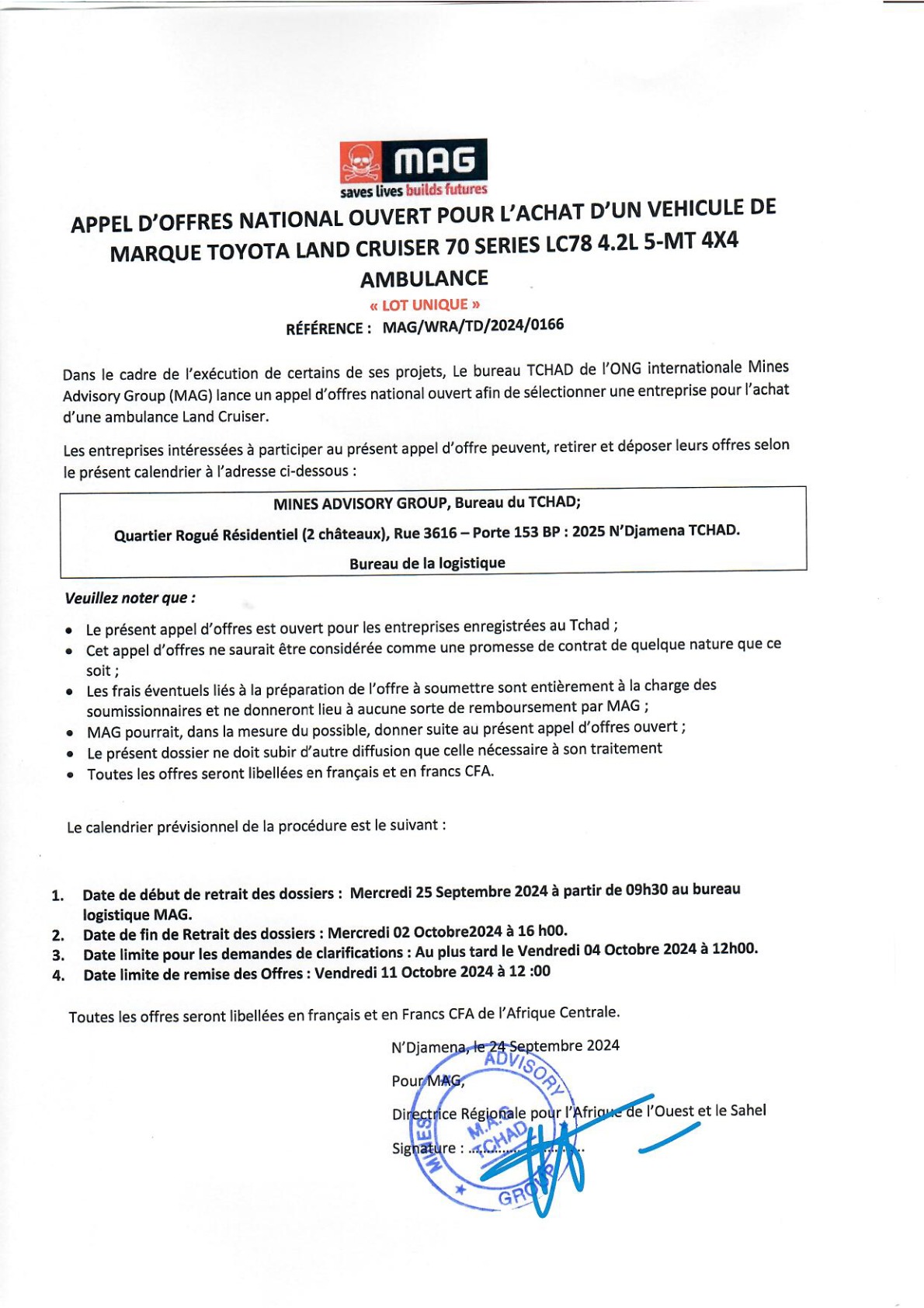 Mines Advisory Group International lance un avis d’appel d’offre pour l’achat d’un véhicule, Tchad Sep 24, 2024 Mines Advisory Group International lance un avis d’appel d’offre pour l’achat d’un véhicule, Tchad Share on FacebookTweetFollow usSaveInstitut mondial de la croissance verte (GGGI) recherche un(e) stagiaire en communication et partage des connaissances, Corée du SudAppel à candidature pour le programme de bourses ROK-KAU 2025 (entièrement financé), Corée du SudLe conseil norvégien pour les réfugiés recrute un(e) coordonnateur(trice) grants, N’Djamena, TchadThe Lutheran World Federation (LWF) is hiring Project Assistant, Fouli, Lac, Tchad