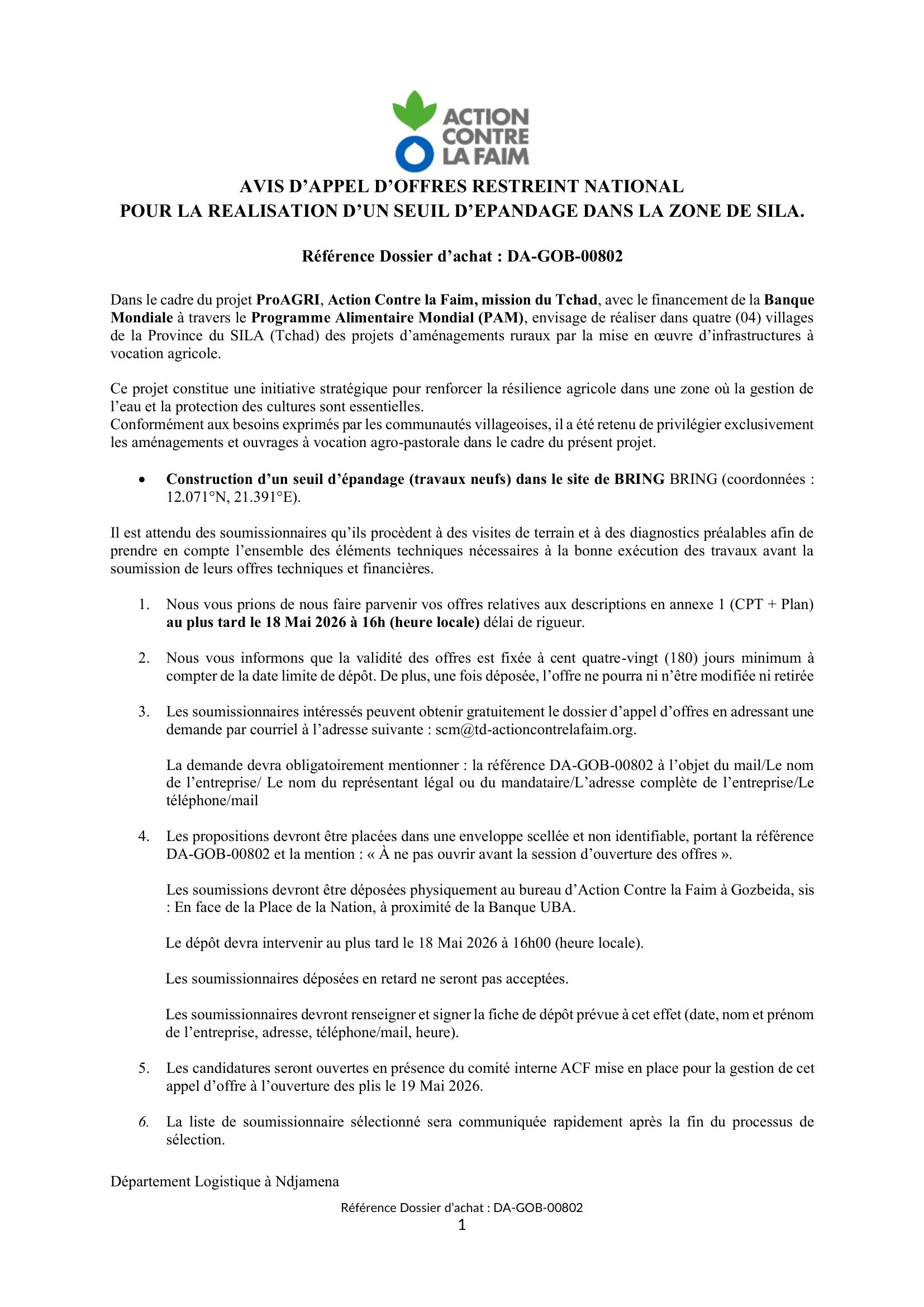 OXFAM lance un avis d’appel d’offre restreint pour la réalisation d’épandage dans la zone de Sila, Tchad Avr 28, 2026 OXFAM lance un avis d’appel d’offre restreint pour la réalisation d’épandage dans la zone de Sila, Tchad Share on FacebookTweetFollow usSaveAppel à candidatures pour les bourses internationales de la Fondation Hans Bockler, Allemagne World Relief recrute un coordinateur de santé nutrition, Guereda, TchadAppel à candidatures pour les bourses professionnelles mondiales du gouvernement SI, SuèdeAppel à candidatures pour la bourse Global Impact pour les étudiants internationaux, Royaume-Uni
