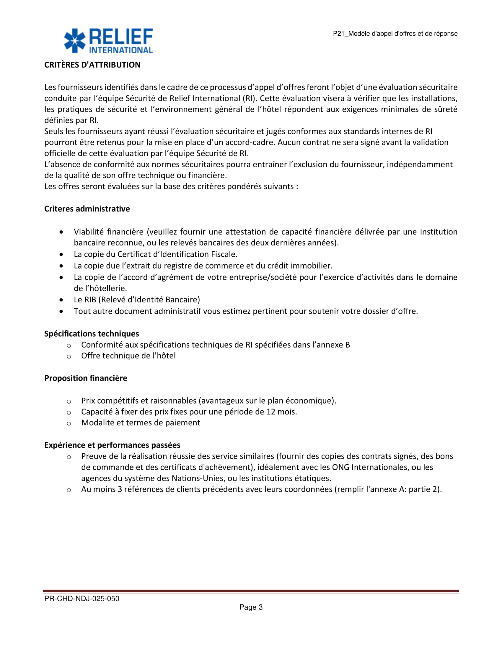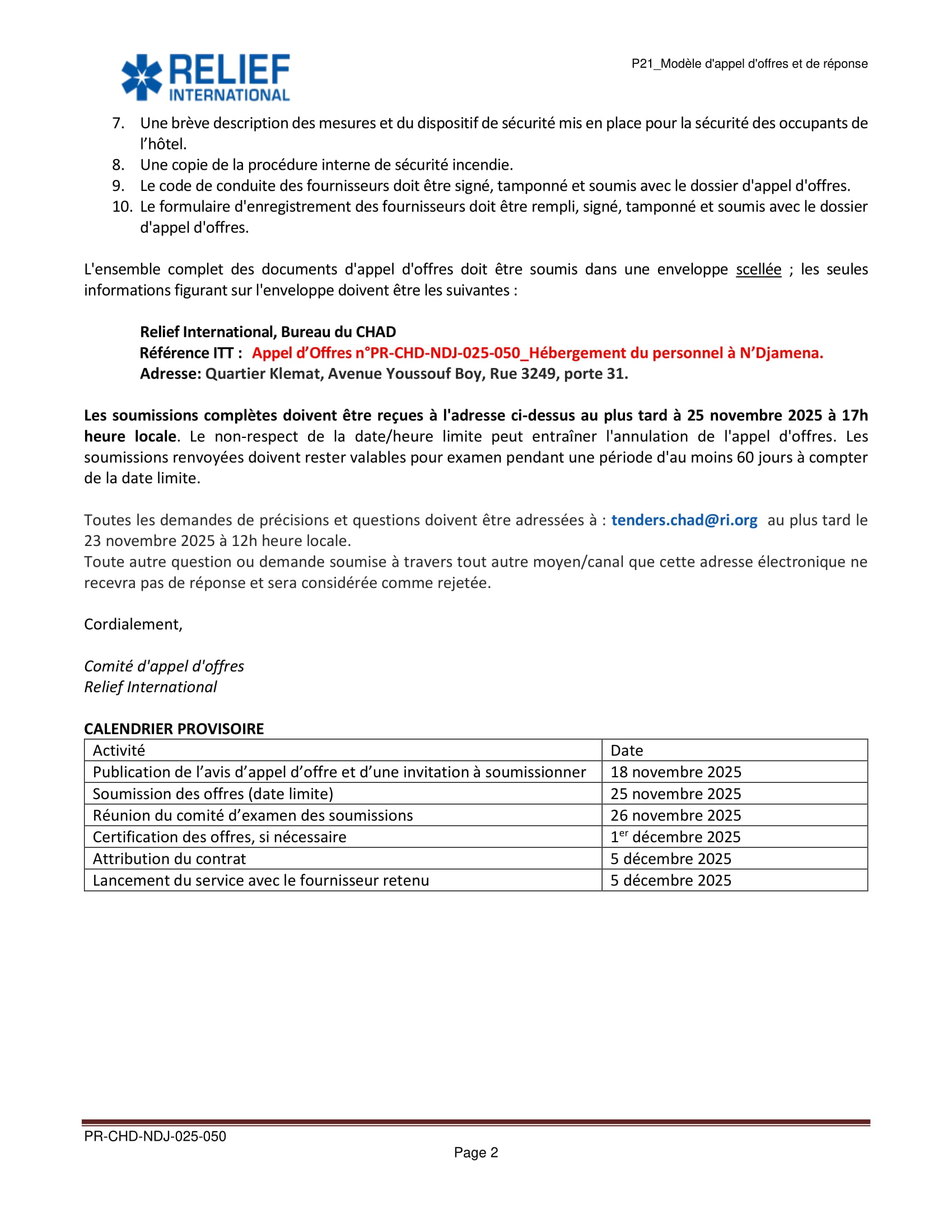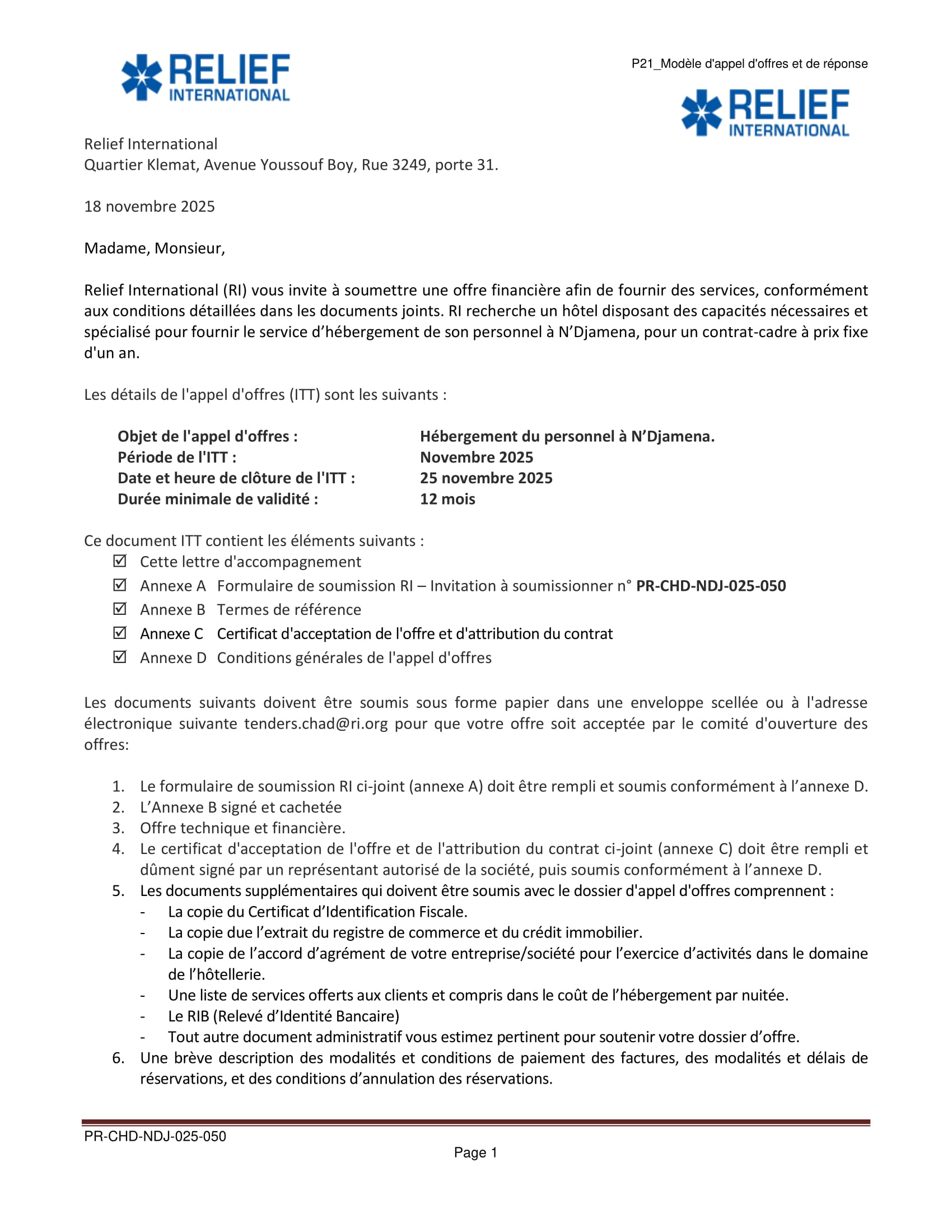 Relief International lance un avis d’appel d’offre pour l’hébergement du personnel, N’Djamena, Tchad Nov 18, 2025 Relief International lance un avis d’appel d’offre pour l’hébergement du personnel, N’Djamena, Tchad Télécharger l’offre complète ici Share on FacebookTweetFollow usSaveLa Wildlife Conservation Society (WCS) lance un avis d’appel d’offres pour le recrutement d’un Consultant pour la réalisation d’une étude sur la taxation des éleveurs transhumants dans la zone de mise en œuvre du PAIRIAC, TchadAfrican Parks recrute pour le poste de responsable du développement communautaire, Parc National de Siniaka Minia, TchadCare recrute un stagiaire assistant projet feministes en action (H/F), Paris, FranceLe Conseil norvégien pour les réfugiés (NRC) recrute les Stagiaires au siège social, Norvège