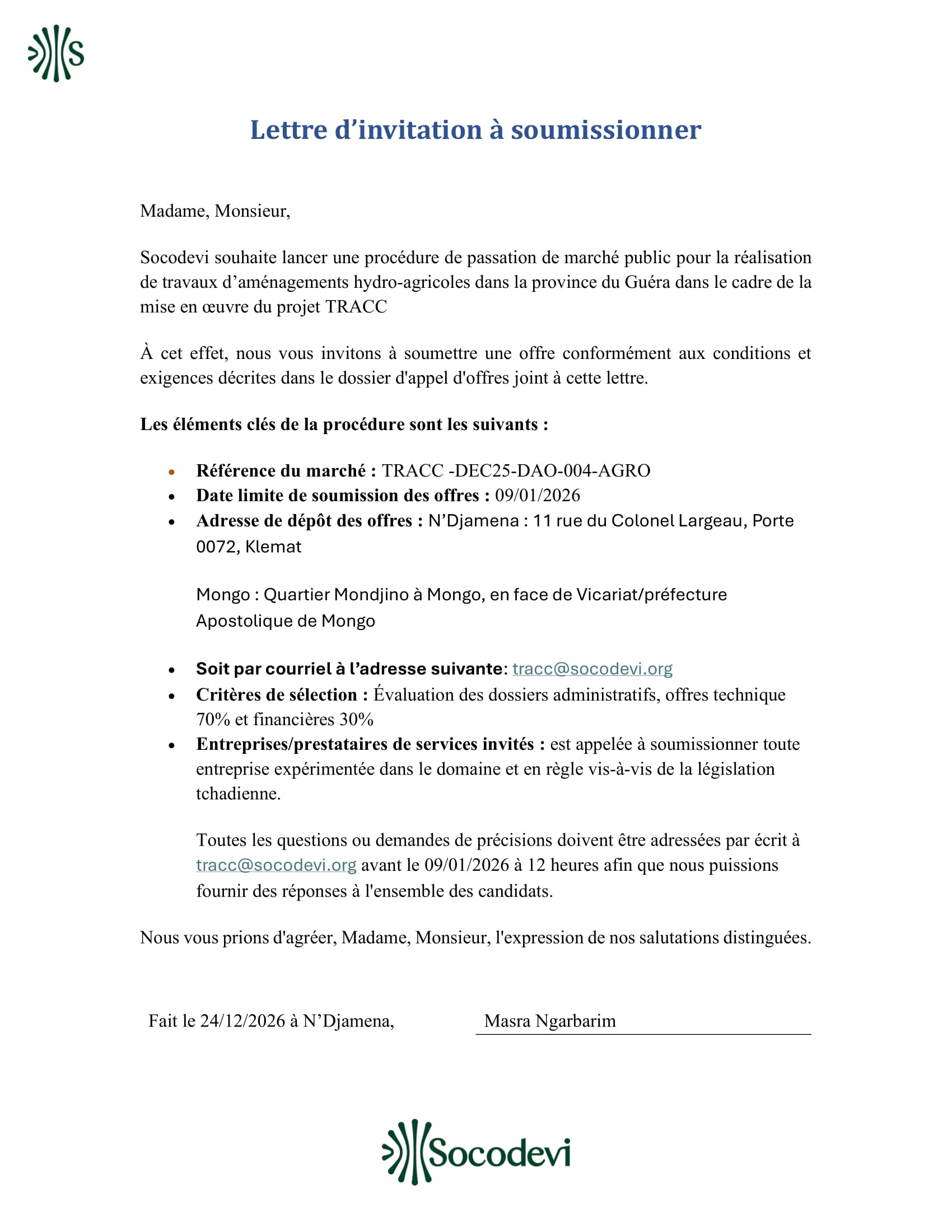 SOCODEVI lance un avis d’appel d’offre pour le recrutement d’entreprises pour la réalisation de travaux d’aménagements hydro-agricoles dans la province du Guéra, Tchad