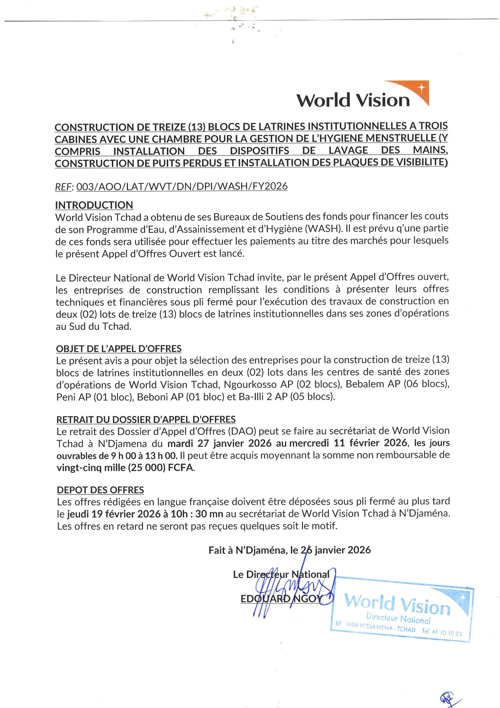 World Vision lance un avis d’appel d’offres pour la construction de treize (13) blocs de latrines institutionnelles en deux lots dans les centres de santé de Ngourkosso, Bebalem, Péni, Beboni, Ba-illi, Tchad