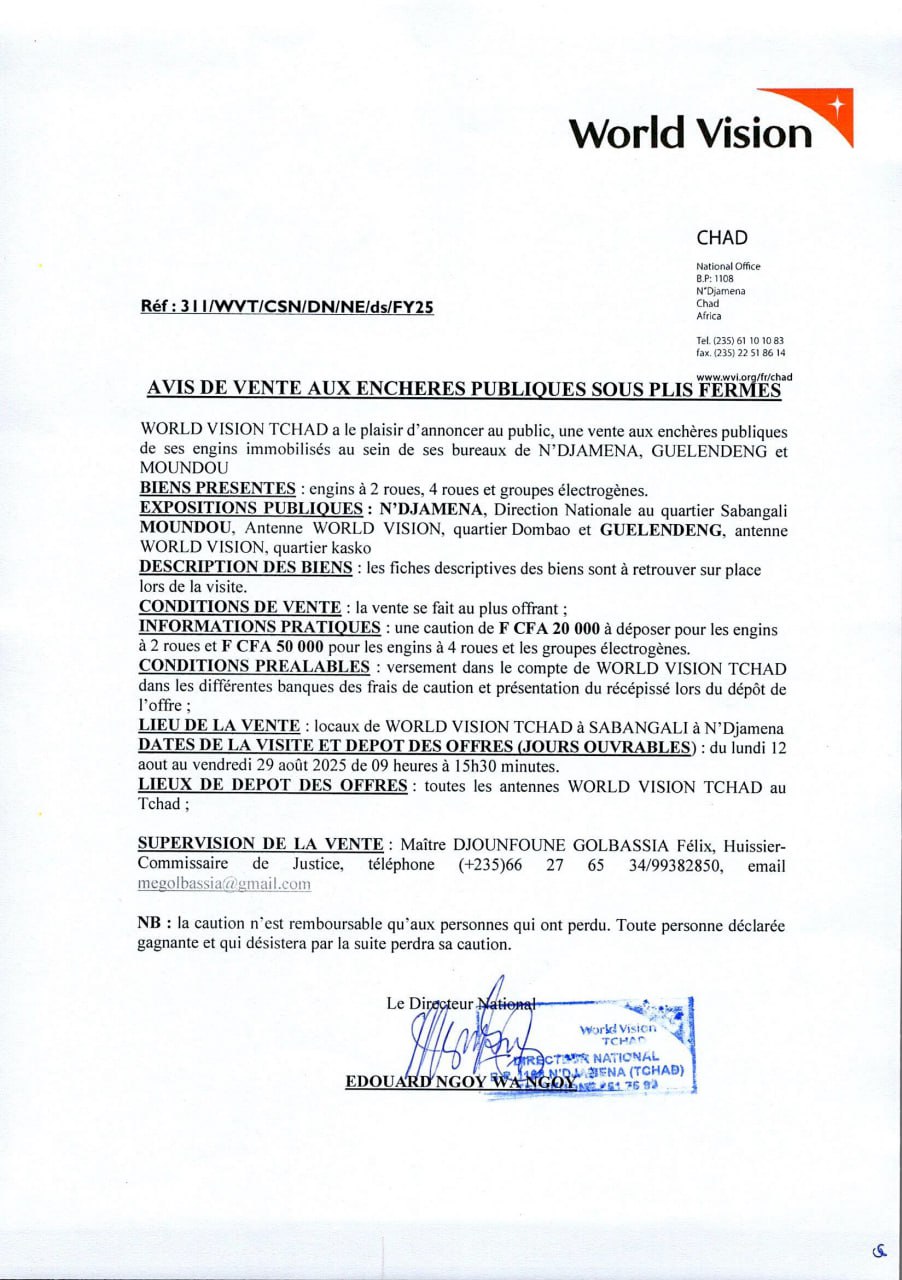 World Vision lance un avis de vente aux enchères publiques sous plis fermés, Tchad Août 5, 2025 World Vision lance un avis de vente aux enchères publiques sous plis fermés, Tchad Share on FacebookTweetFollow usSaveLe conseil norvégien pour les réfugiés recrute un(e) coordonnateur(trice) grants, N’Djamena, TchadGIZ recrute un expert en crise, conflits et catastrophes (H/F), N’Djamena, TchadWorld Vision lance un avis d’appel d’offres pour la conception et la mise en œuvre d’une structure et des services informatiques pour le Bureau World Vision International N’Djamena, TchadLutheran World Federation lance un avis de recrutement d’un coordinateur de programme pays, N’Djamena, Tchad