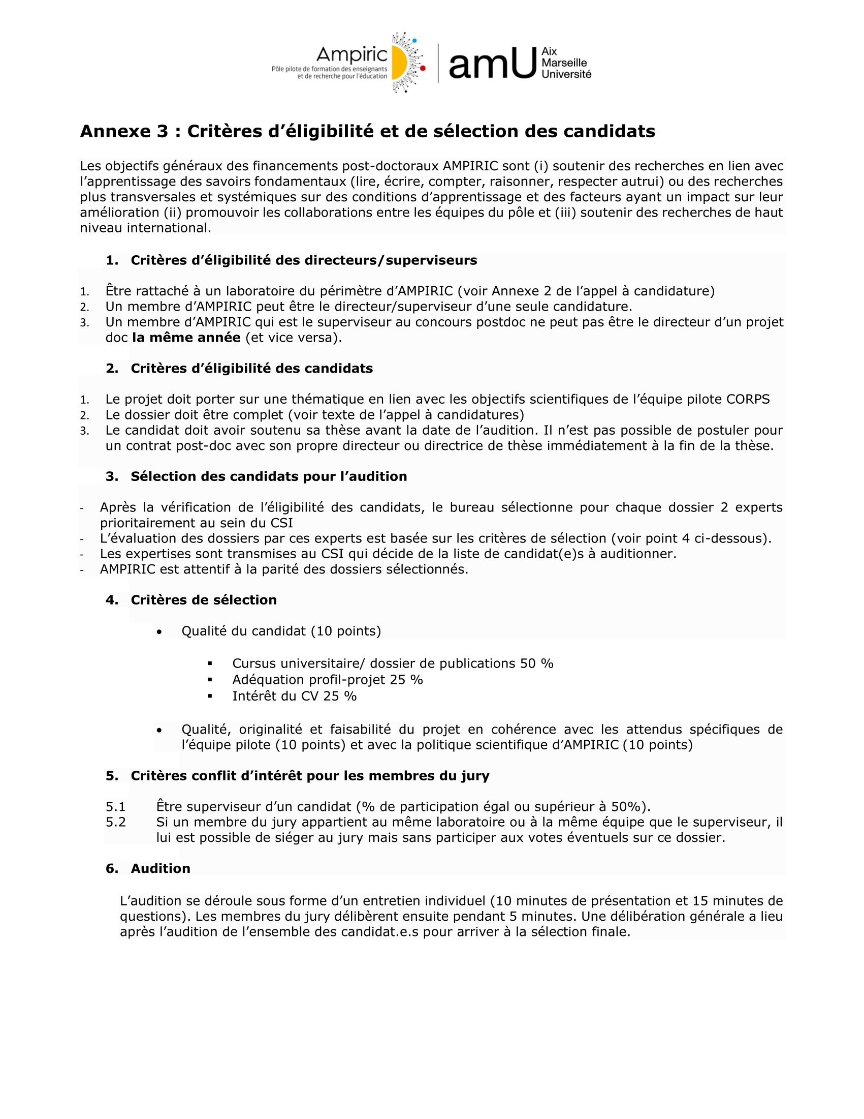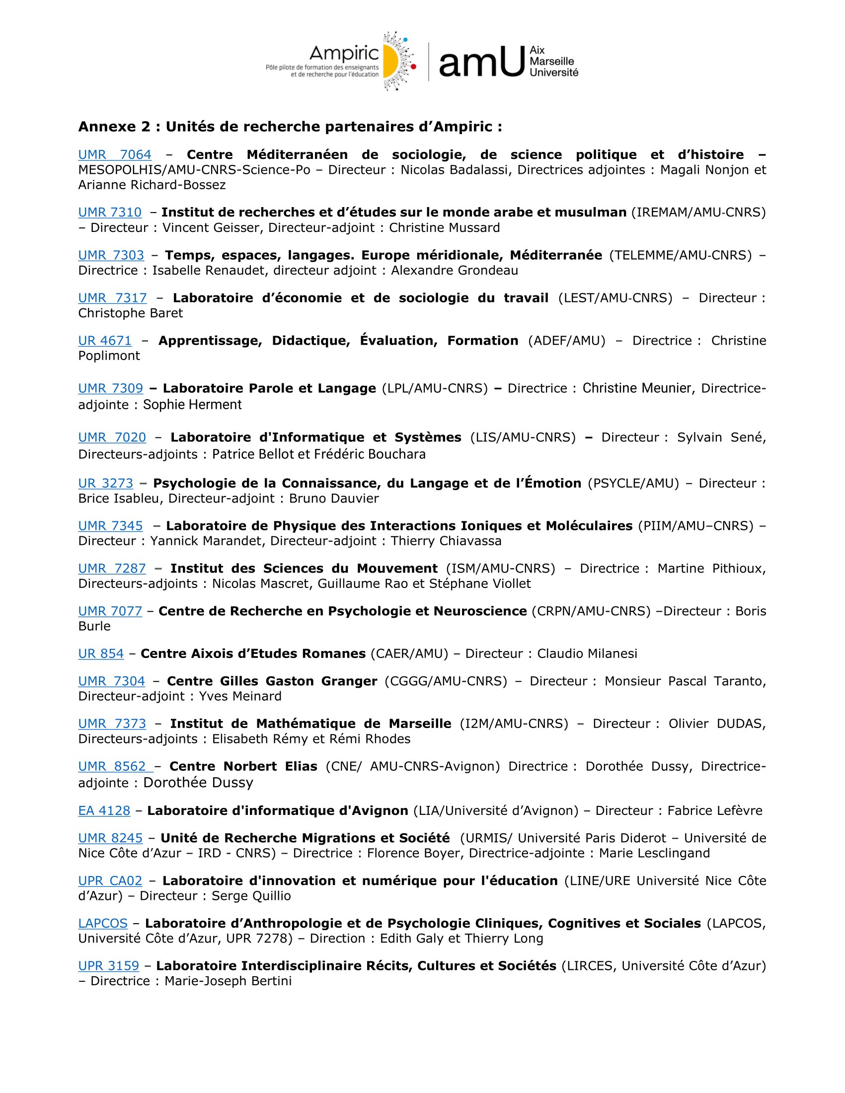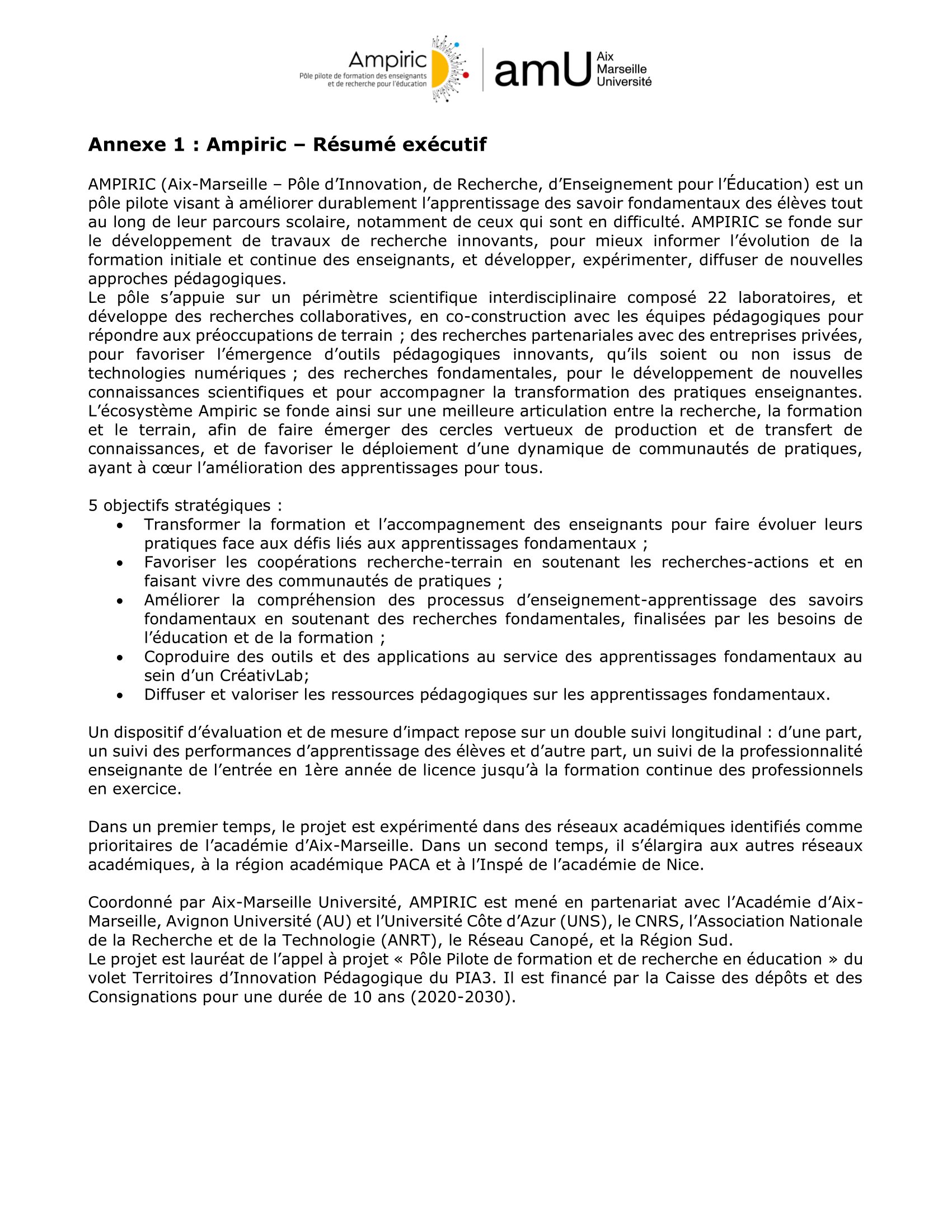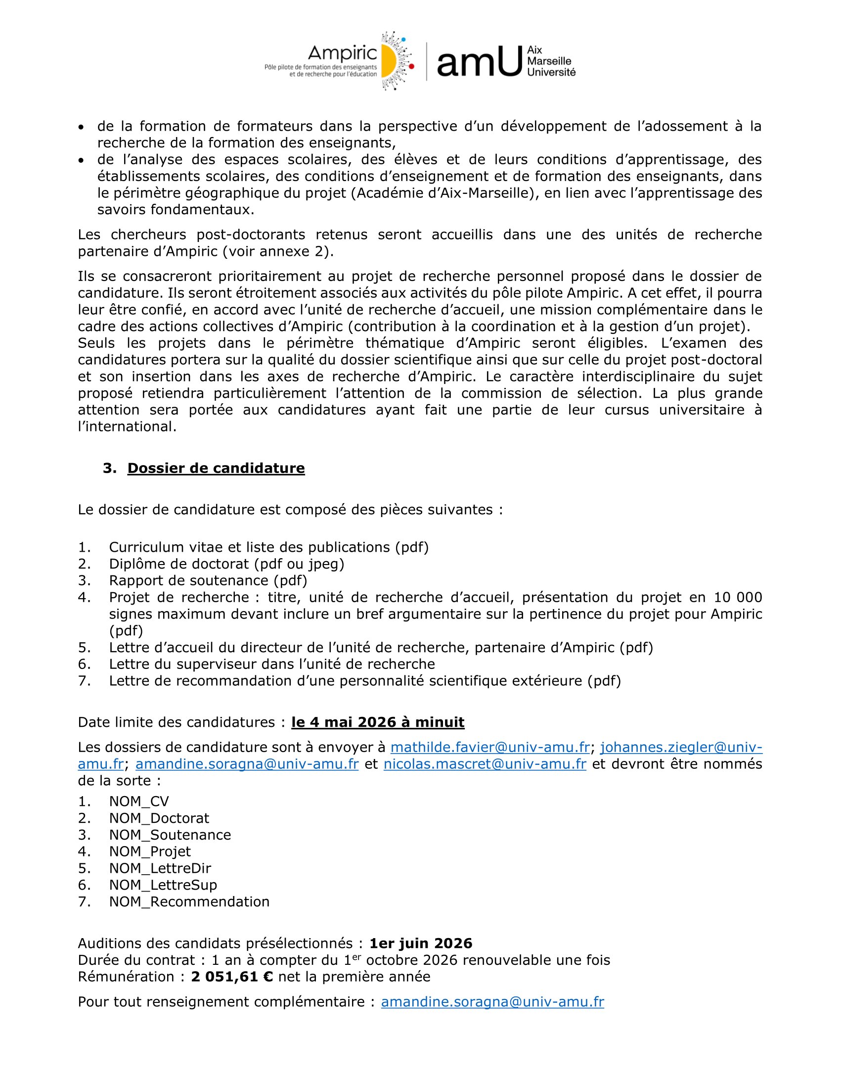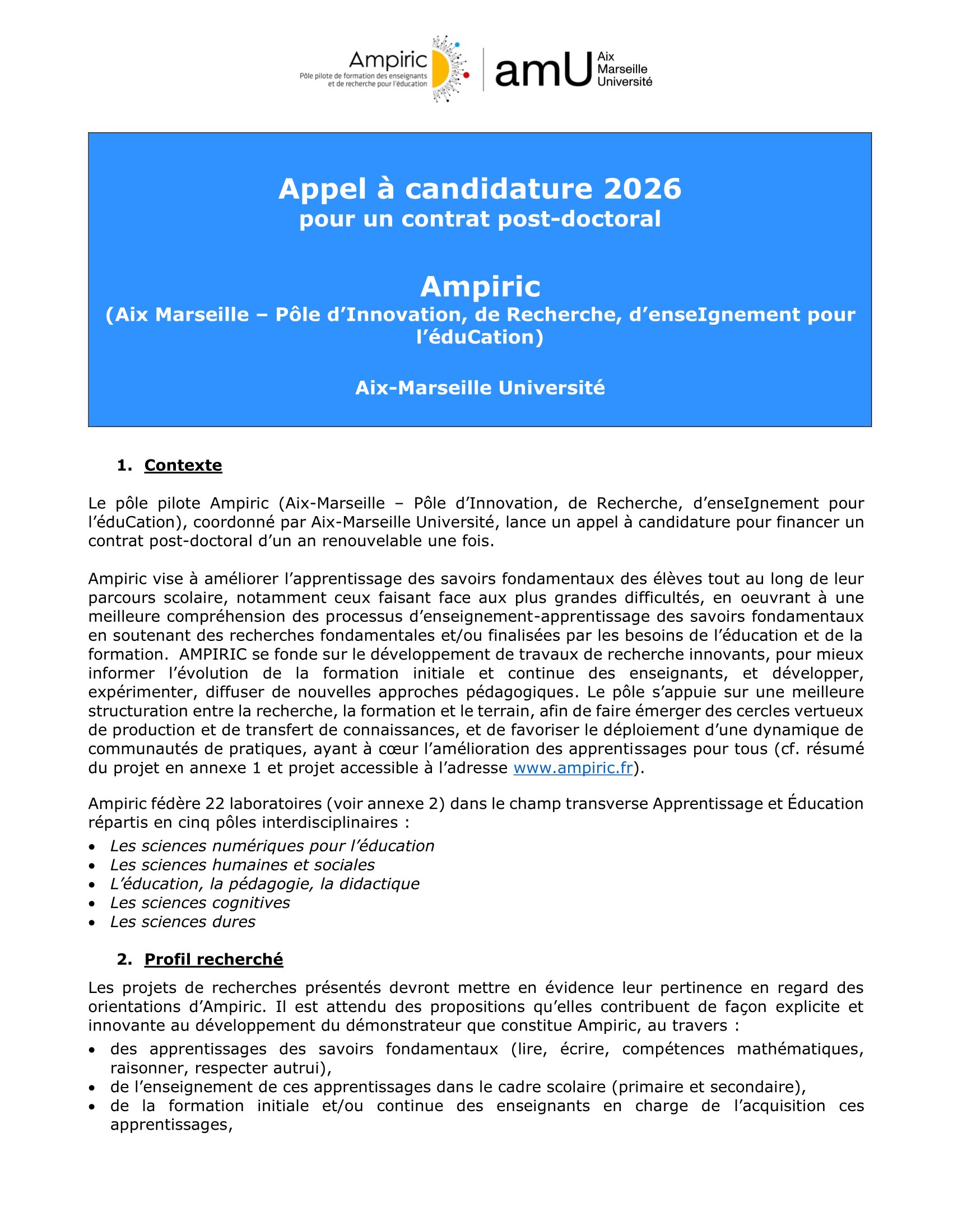 Le pôle pilote Ampiric (Aix-Marseille – Pôle d’Innovation, de Recherche, d’enseignement pour l’éducation), coordonné par Aix-Marseille Université, lance un appel à candidature pour financer un contrat post-doctoral d’un an renouvelable une fois