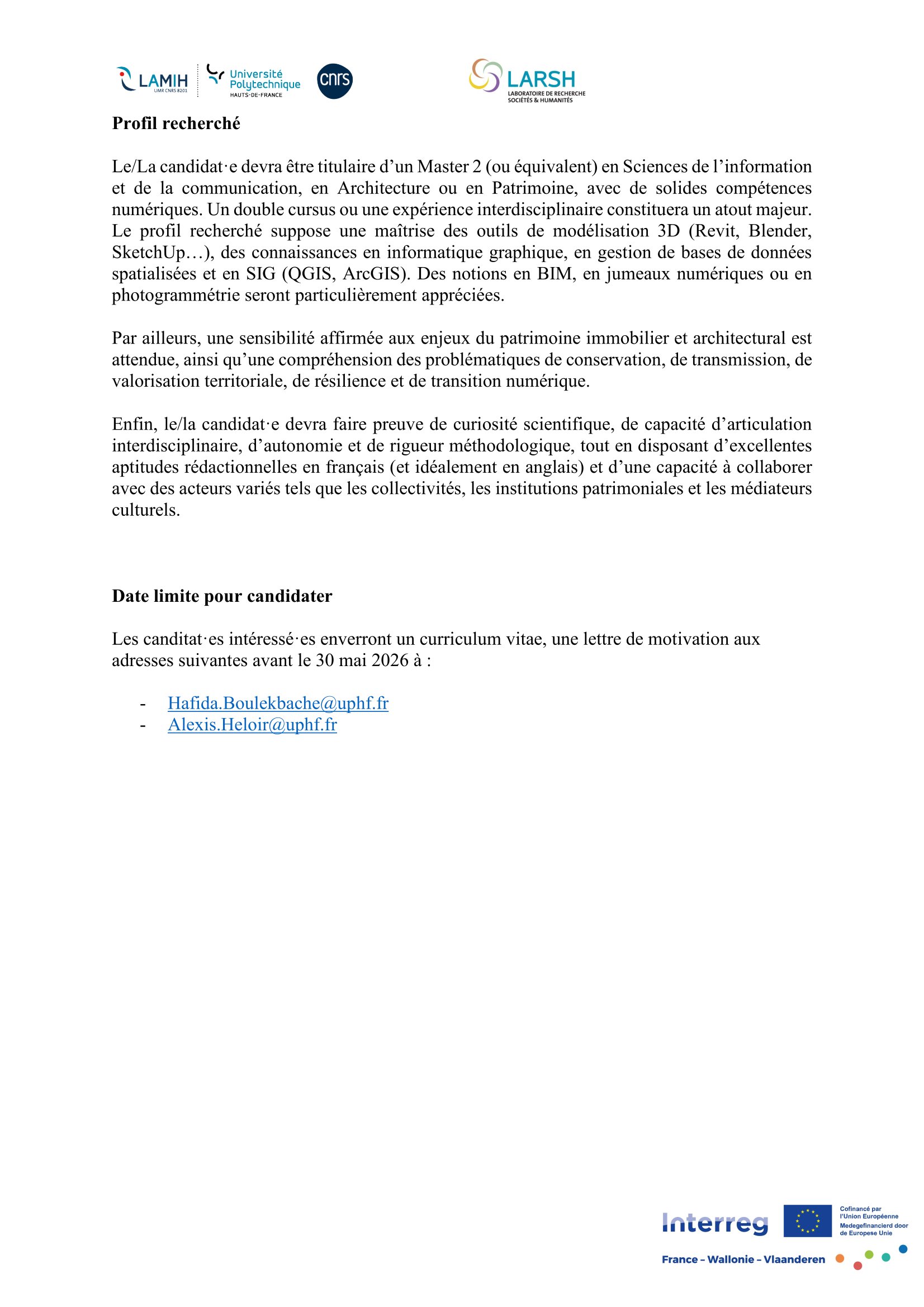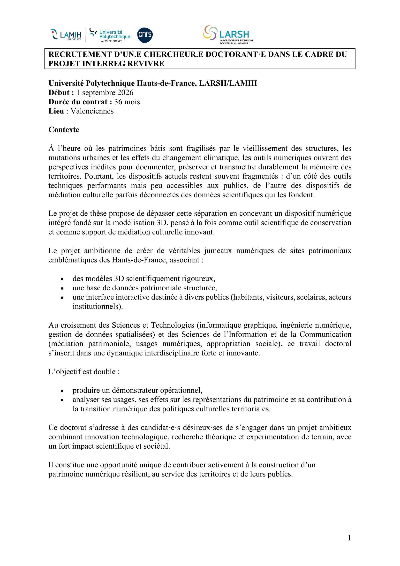 L’Université Polytechnique Hauts-de-France, en partenariat avec LARSH/LAMIH, lance un appel à candidature pour le recrutement d’un Chercheur Doctorant (H/F) dans le cadre du Projet INTERREG REVIVRE