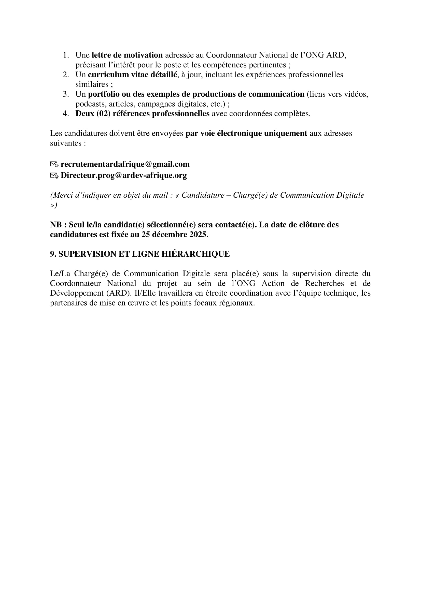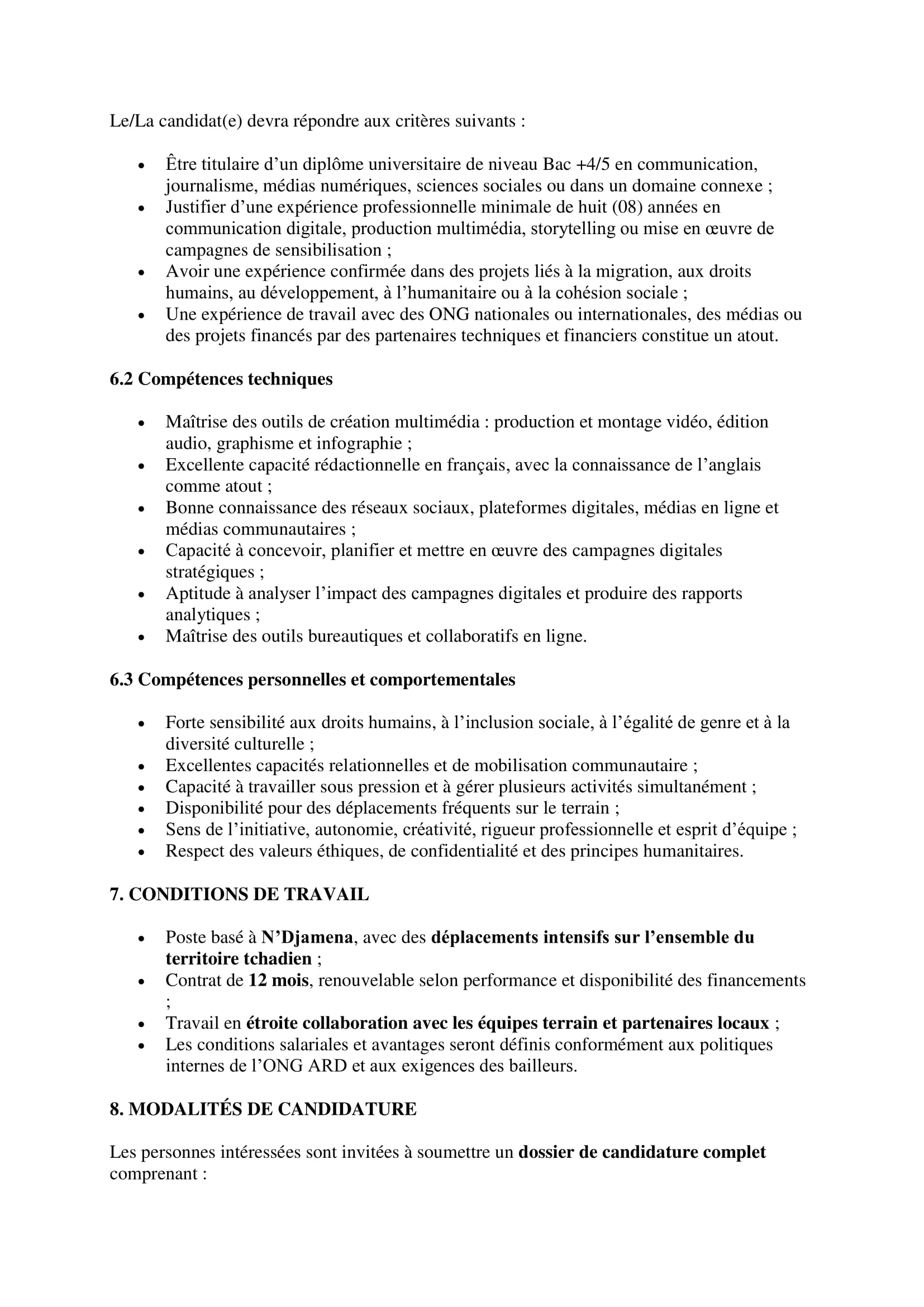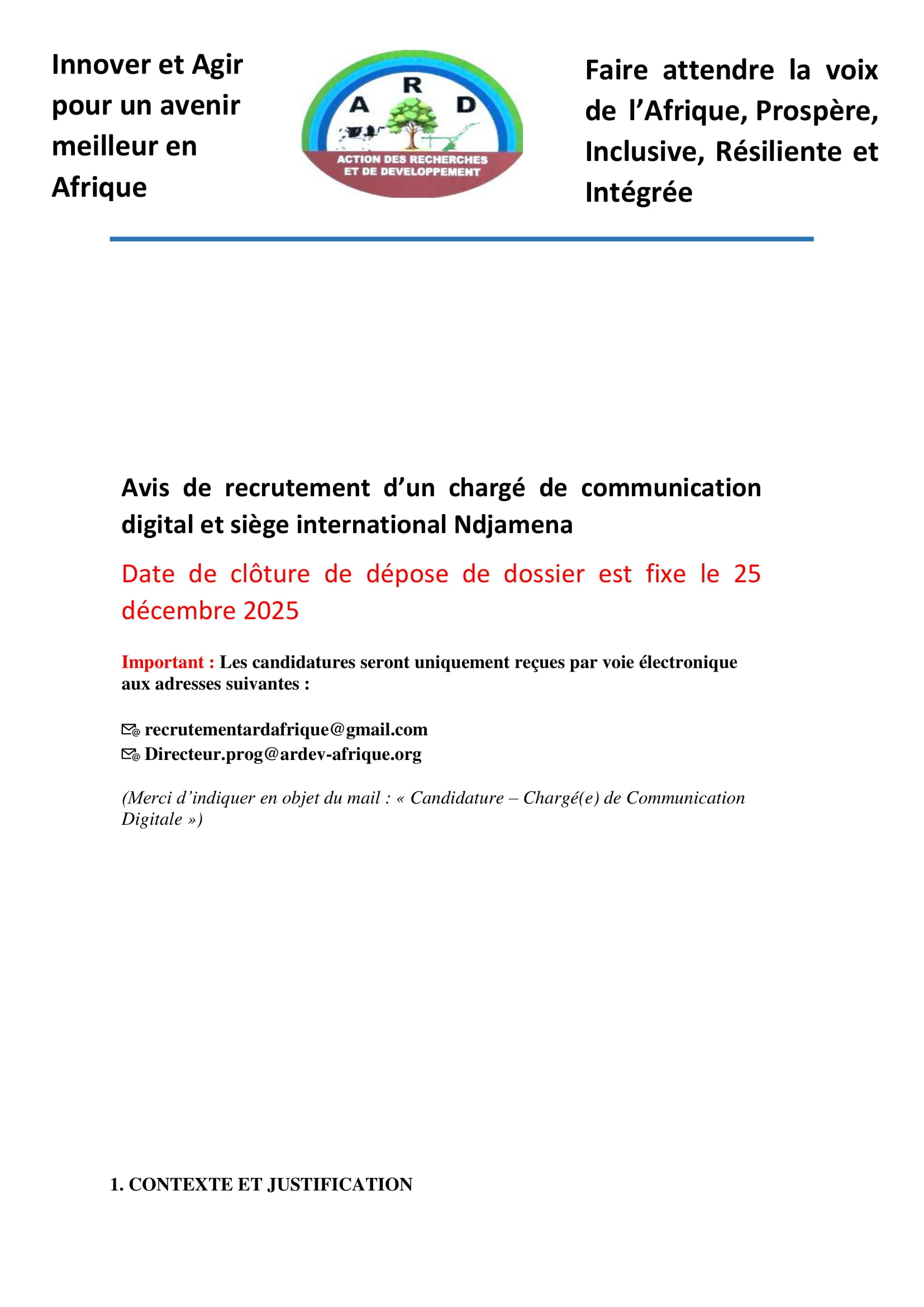 Action des Recherches et de Développement recrute un chargé de communication digital et siège international N’Djamena, Tchad Déc 18, 2025 Action des Recherches et de Développement recrute un chargé de communication digital et siège international N’Djamena, Tchad Share on FacebookTweetFollow usSaveCRS recrute un chargé de projet restauration des terres (H/F), Bol, TchadLe Réseau Accès aux Médicaments Essentiels (RAME) lance un appel à candidatures pour le recrutement d’un(e) stagiaire en Suivi-évaluation et gestion des données, Ouagadougou, Burkina FasoCEFOREP SARL organise une formation sur le suivi et évaluation des projets, Kobo collect et SPSS, N’Djamena, Tchad Acted recrute un stagiaire en contrôle de gestion, Paris, France