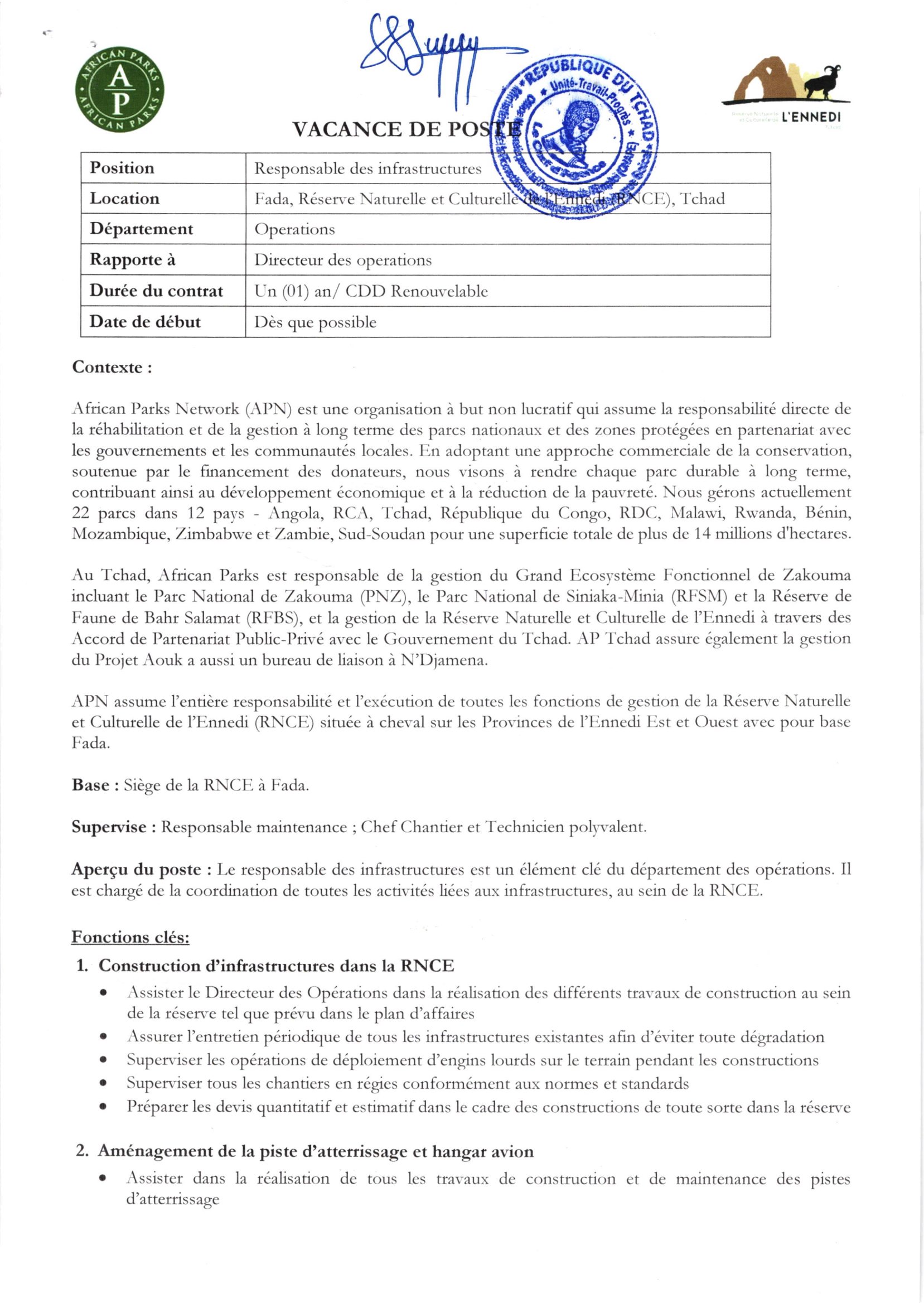African Parks Network (APN) recrute pour le poste de Responsable des Infrastructures, Fada, Tchad Fév 18, 2026 African Parks Network (APN) recrute pour le poste de Responsable des Infrastructures, Fada, Tchad Share on FacebookTweetFollow usSaveLe Cabinet Emas Tekor (CET) recrute un stagiaire informaticien (H/F), N’Djamena, TchadLe cabinet CEFOREP SARL lance une formation sur le logiciel Tompro la prise en main du logiciel Odoo, N’Djamena, TchadAppel à candidatures pour la bourse d’excellence 2026 du gouvernement du Canada et du Québec pour étudiants étrangers (PBEEE)Caritass Suisse lance un appel d’offre pour le recrutement d’un fournisseur pour la livraison de céréales dans 11 banques, Batha Est et Assinet , Tchad