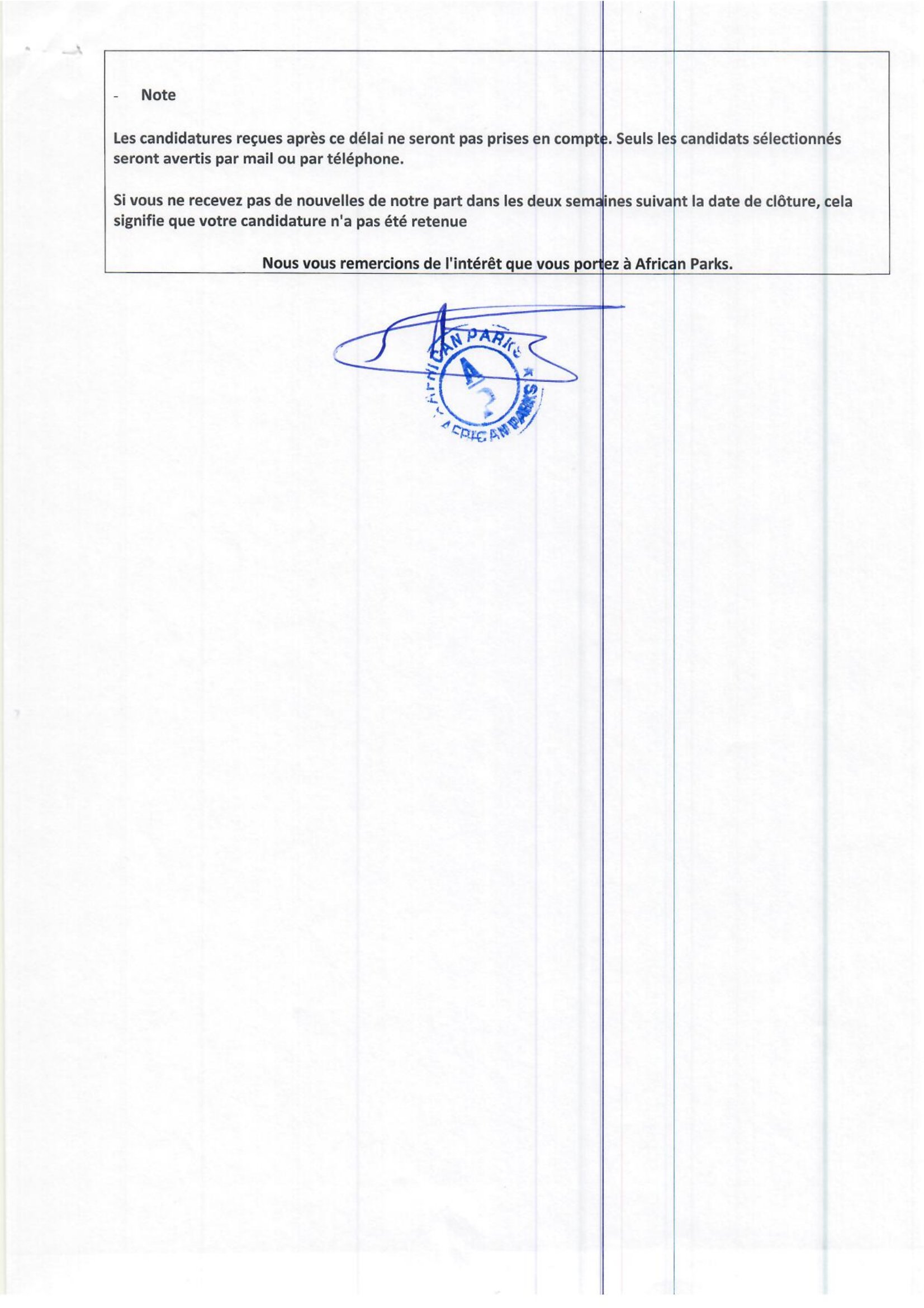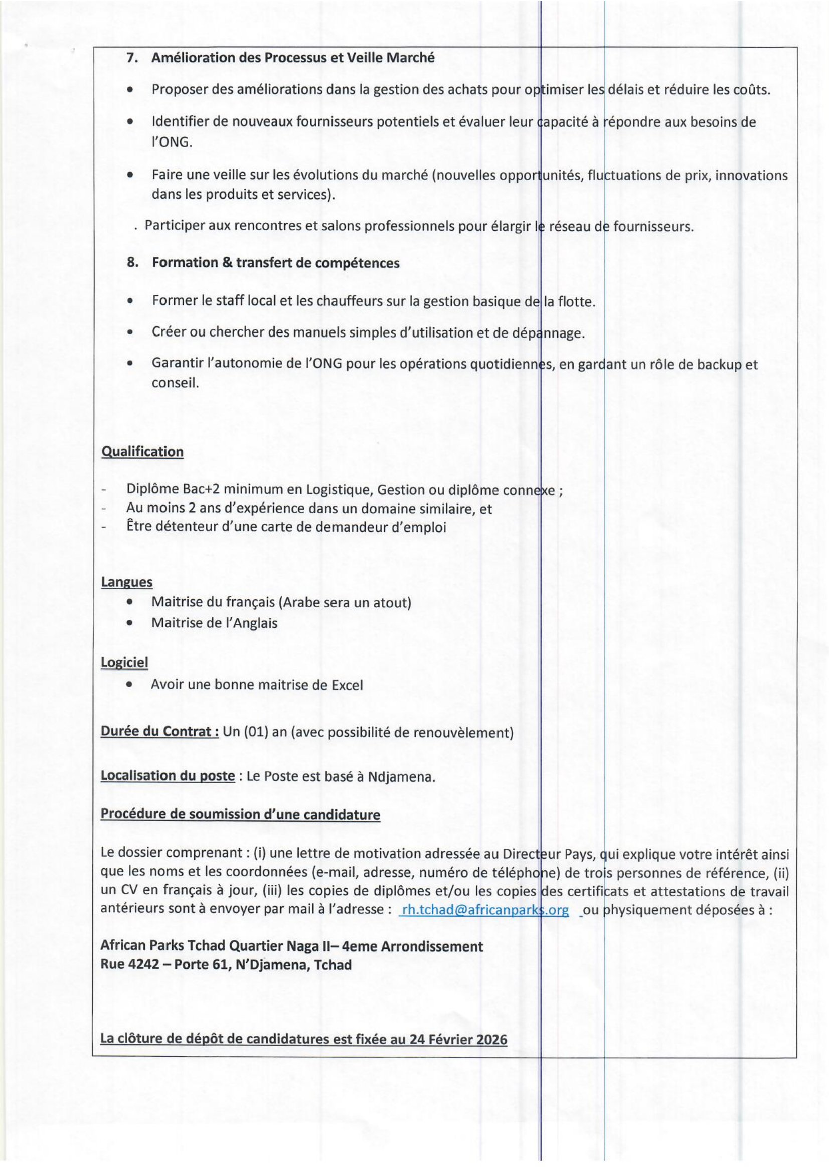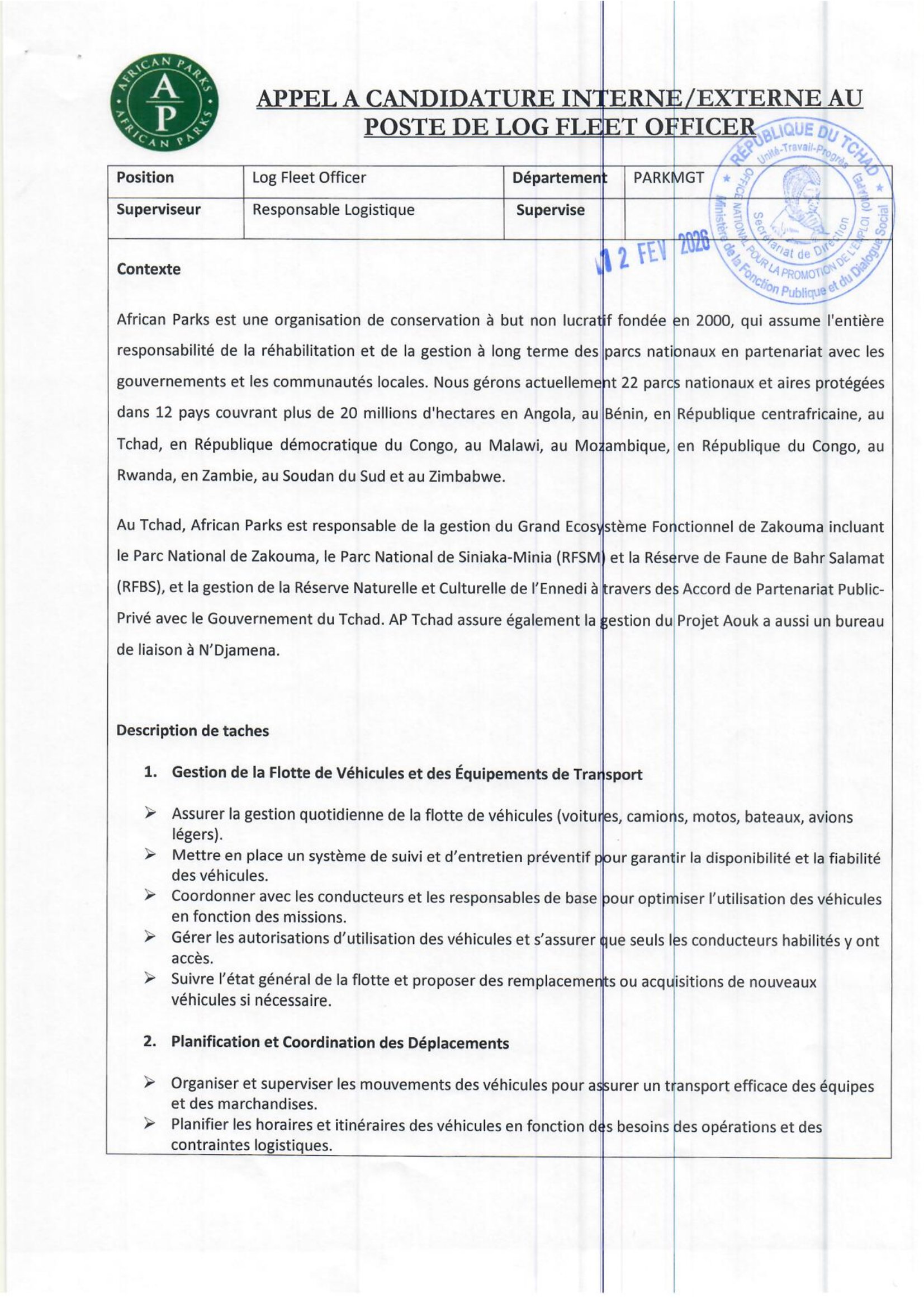 African Parks Network lance un avis d’appel à candidature interne/externe au poste de Log Fleet Officer, N’Djamena, Tchad