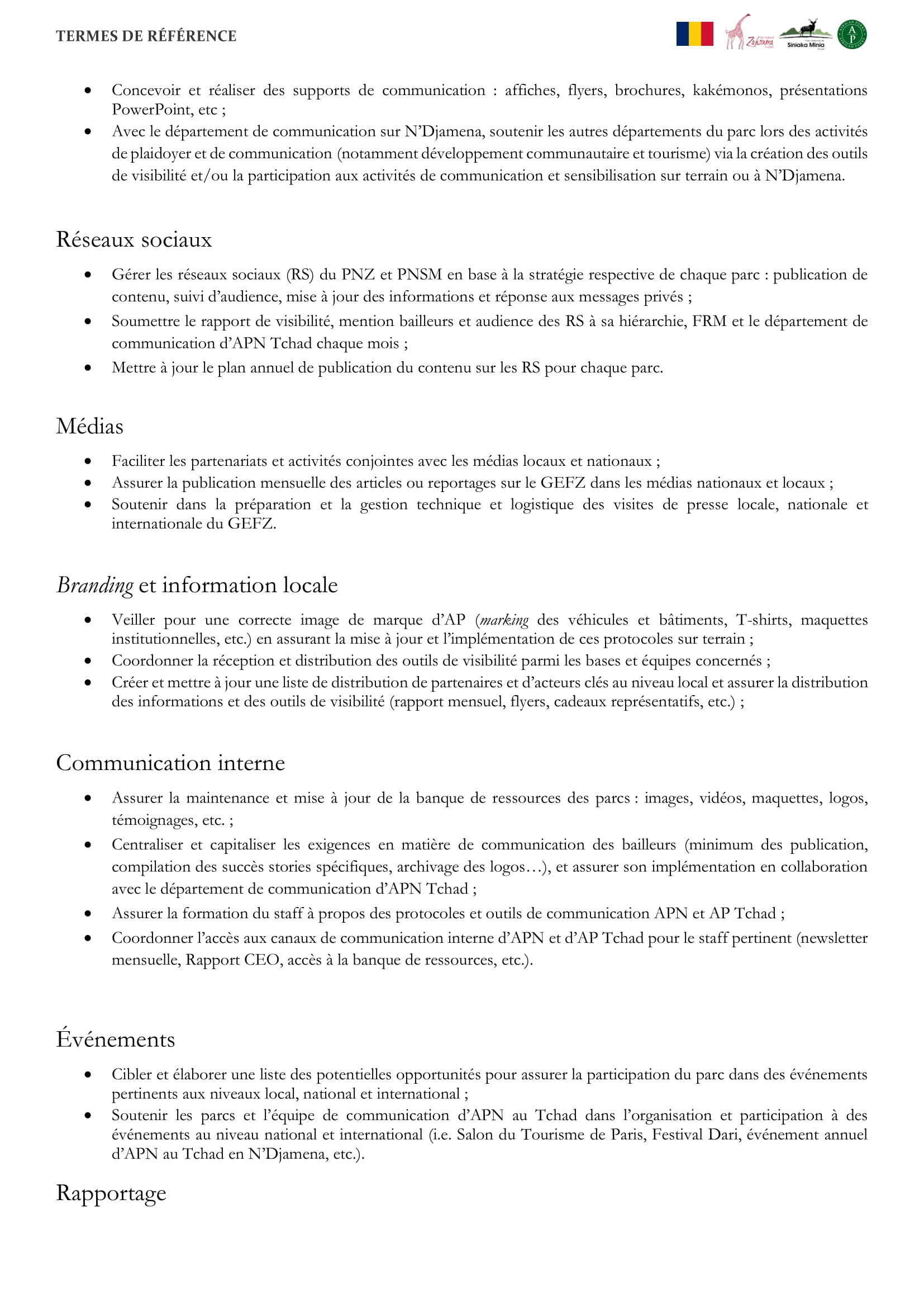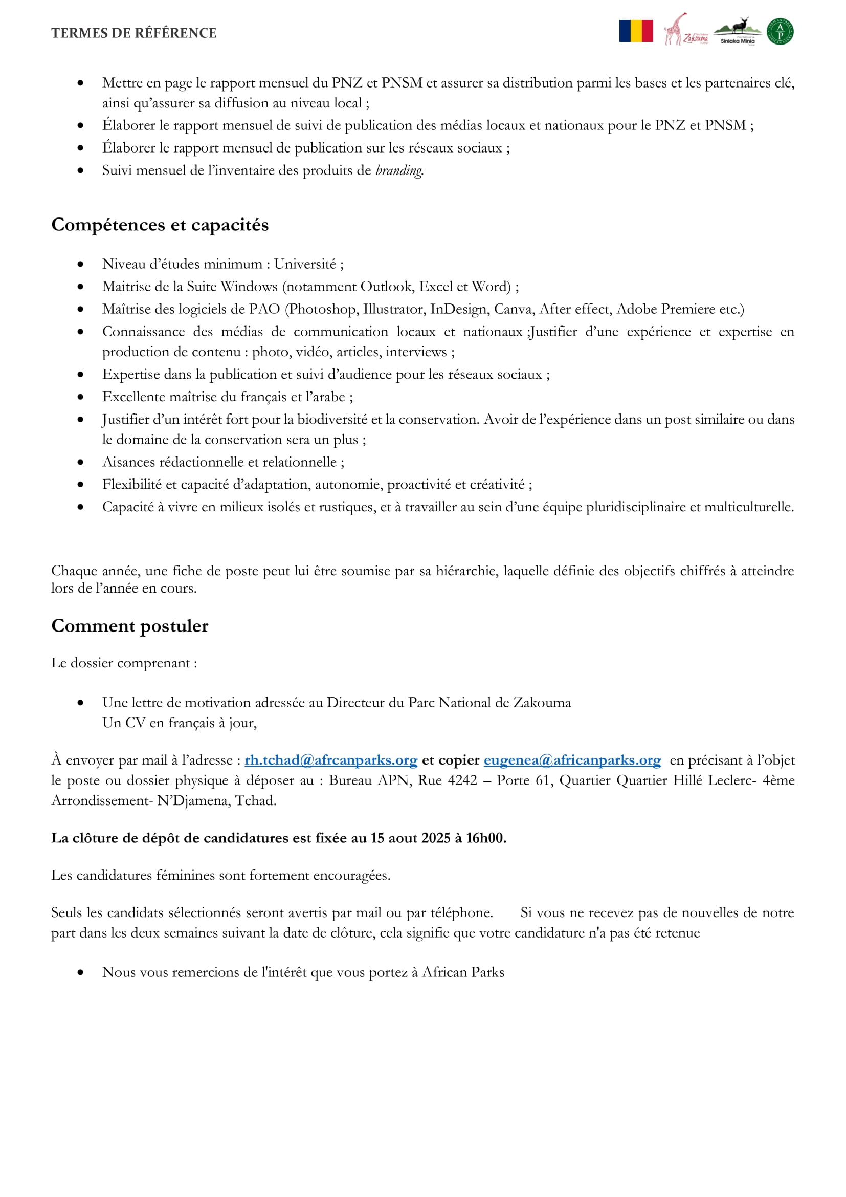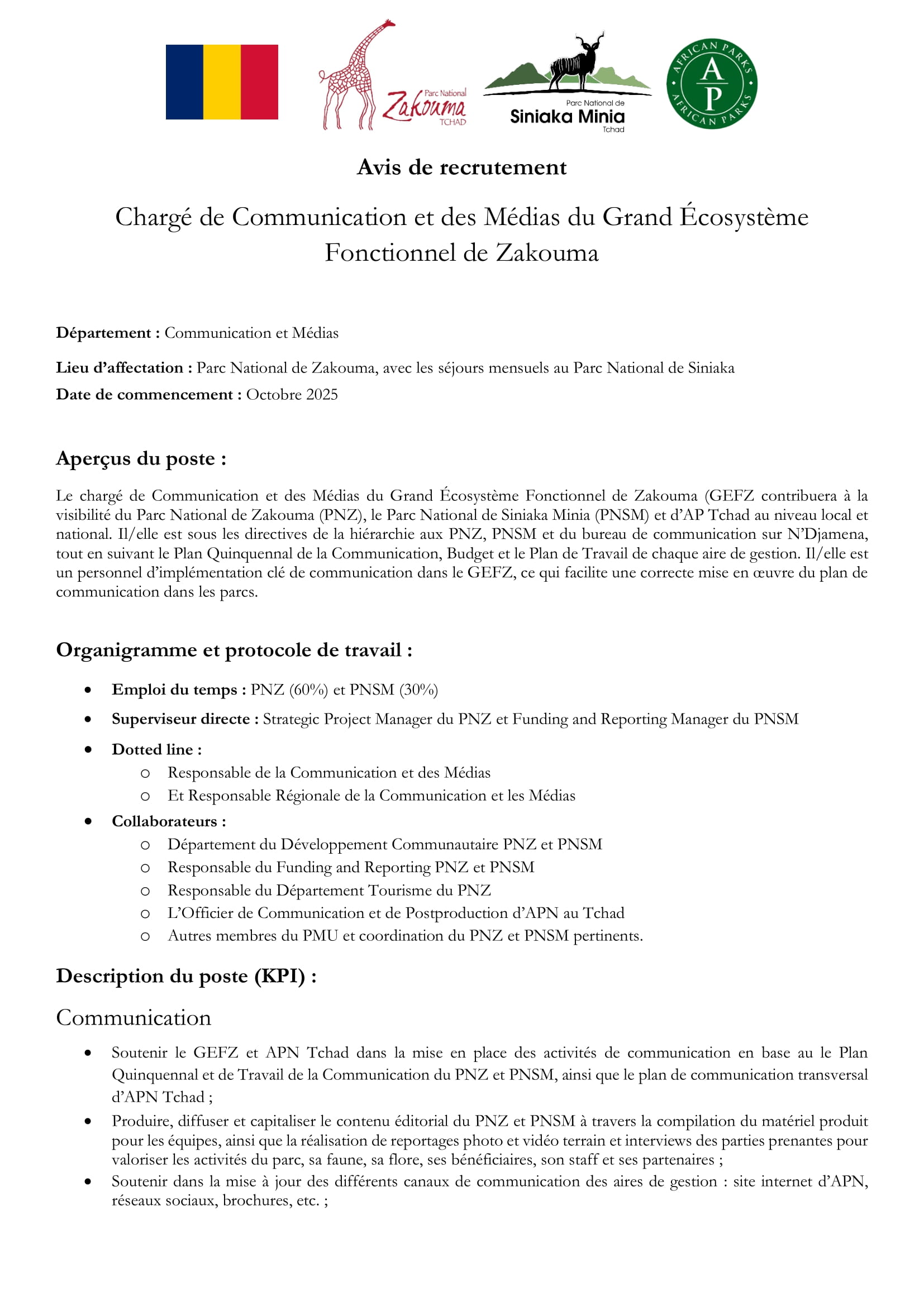African Parks Network recrute pour le poste de chargé de communication et des médias du grand écosystème fonctionnel de Zakouma, Tchad Juil 30, 2025 African Parks Network recrute pour le poste de chargé de communication et des médias du grand écosystème fonctionnel de Zakouma, Tchad Share on FacebookTweetFollow usSaveLa DRC recrute un responsable département Finance et administration, Adré, TchadAppel à candidatures pour les bourses d’études VLIR-UOS Belgium ICP ConnectLe Fonds International de Développement Agricole (FIDA) lance un avis d’appel à manifestation d’intérêt pour le recrutement d’un bureau/cabinet d’études chargé de conduire les études de faisabilité pour l’exploitation de la filière pêche et pisciculture, TchadAppel à candidatures pour le stage à l’agence des Nations Unies pour les technologies de l’information et de la communication (UIT)