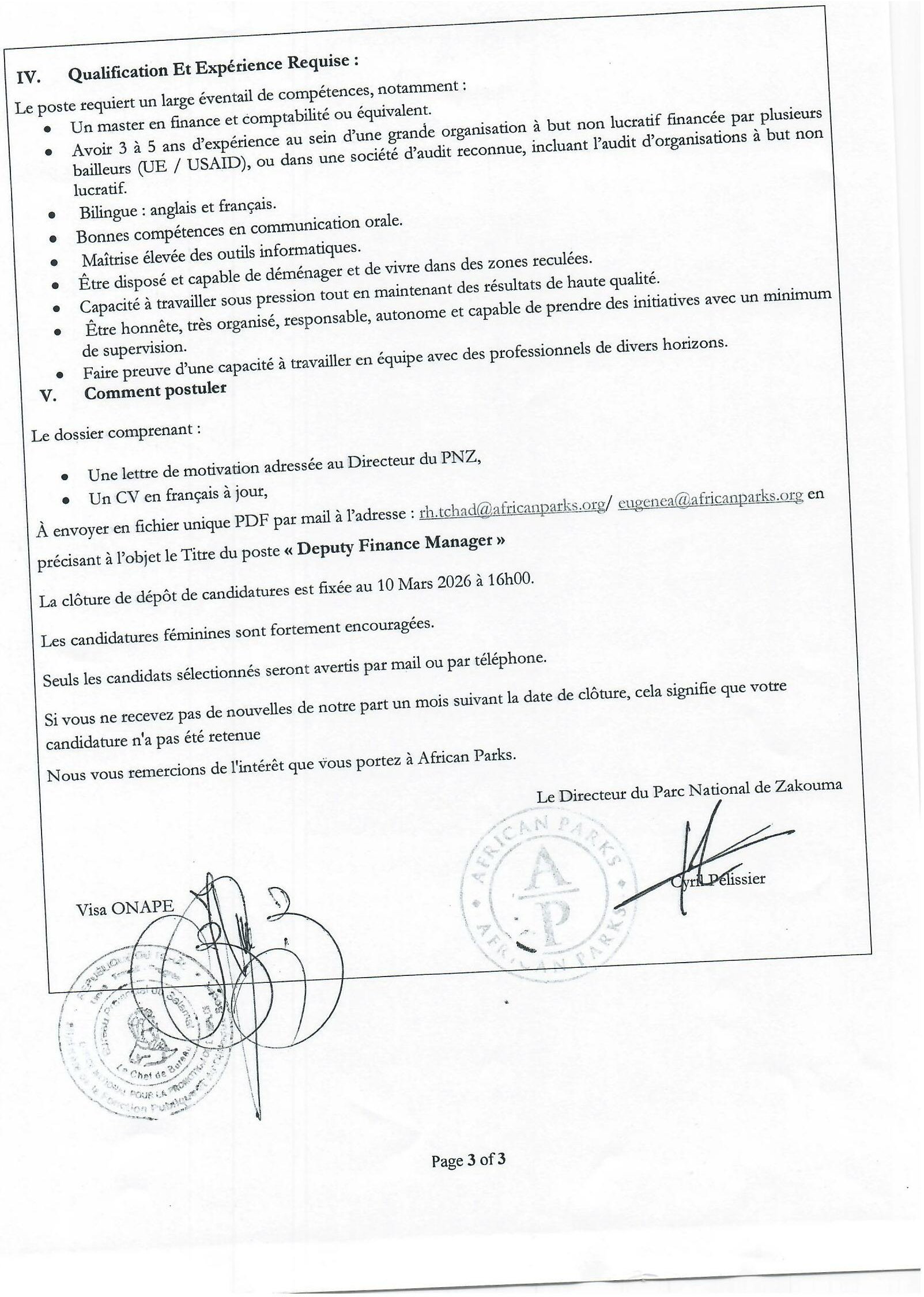 African Parks Network recrute pour le poste de Deputy Finance Manager, PNZ, Tchad Fév 4, 2026 African Parks Network recrute pour le poste de Deputy Finance Manager, PNZ, Tchad Share on FacebookTweetFollow usSaveAppel à candidatures pour la bourse de doctorat 2026 de l’Université internationale de Floride en ingénierie structurelle (entièrement financée), États-UnisAppel à candidatures pour les bourses d’études en masters et doctorats de l’université de Cambridge, Royaume-Uni Oxfam recrute un Assistant aux approvisionnements et logistique (H/F), Est, TchadFIDIS INVEST lance une formation certifiée en audit et comptabilité bancaire, google meet