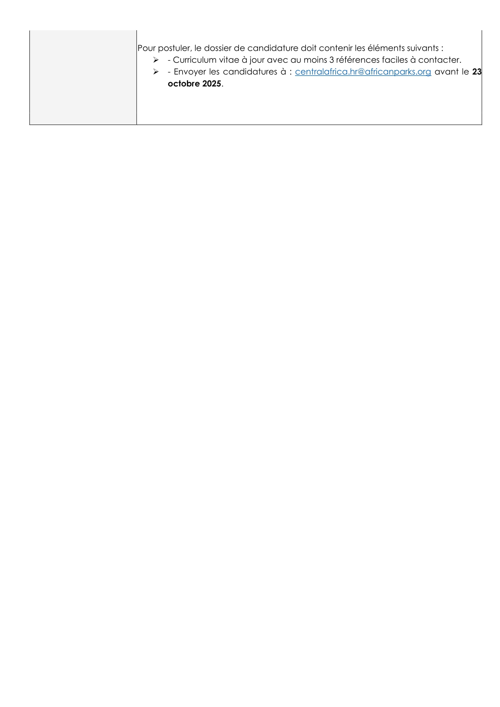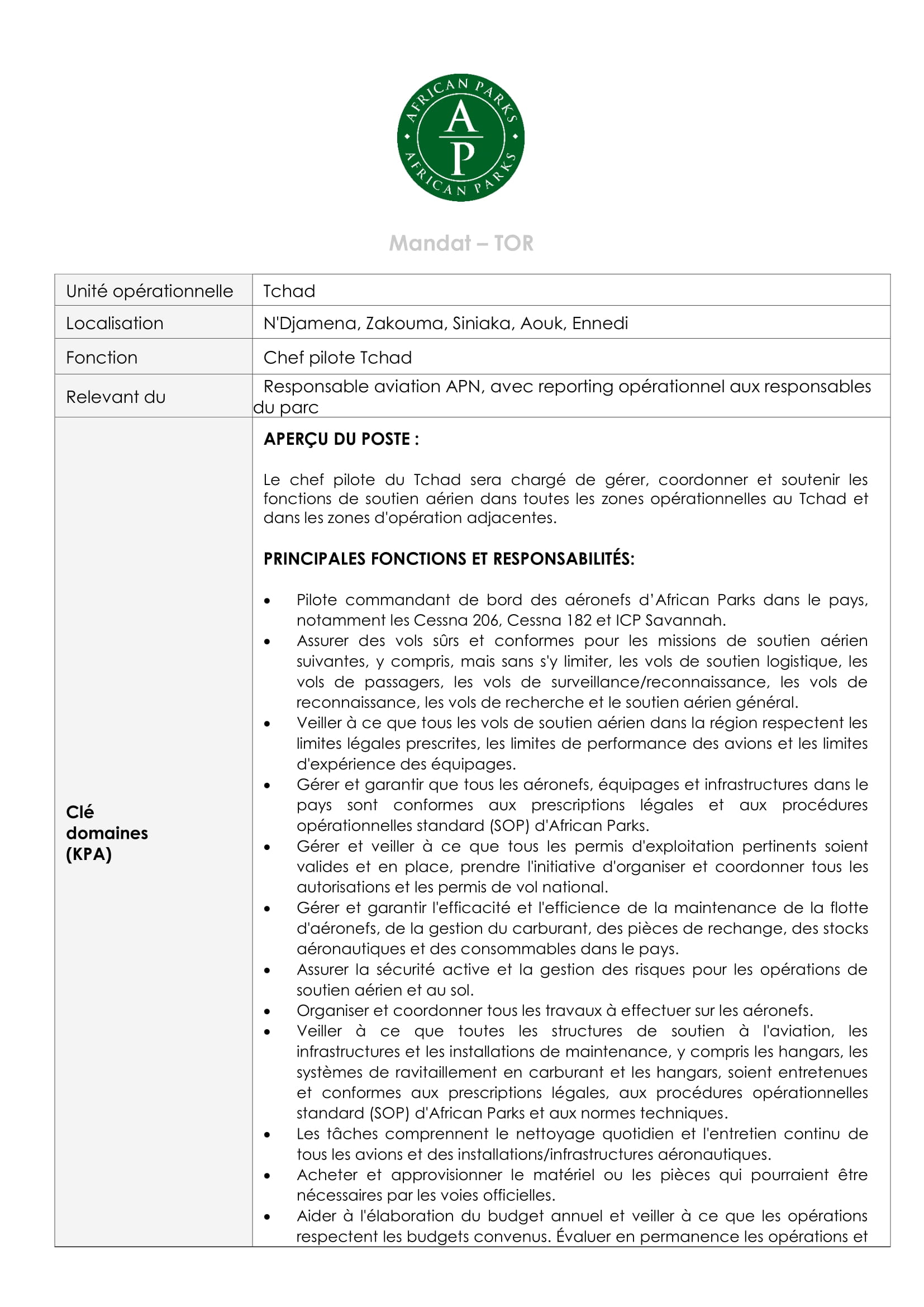 African Parks recherche un chef pilote, N’Djamena, Tchad Sep 15, 2025 African Parks recherche un chef pilote, N’Djamena, Tchad Share on FacebookTweetFollow usSaveGIZ recrute un expert en crise, conflits et catastrophes (H/F), N’Djamena, TchadMédecins Sans Frontières (MSF) recrute un stagiaire en communication digitale, Dakar, SénégalLe Centre de services régional des Nations Unies à Entebbe (RSCE) recrute un Stagiaire – Technologie de l’information, Entebbe, OugandaBourses d’études pour les leaders mondiaux émergents de l’American University.