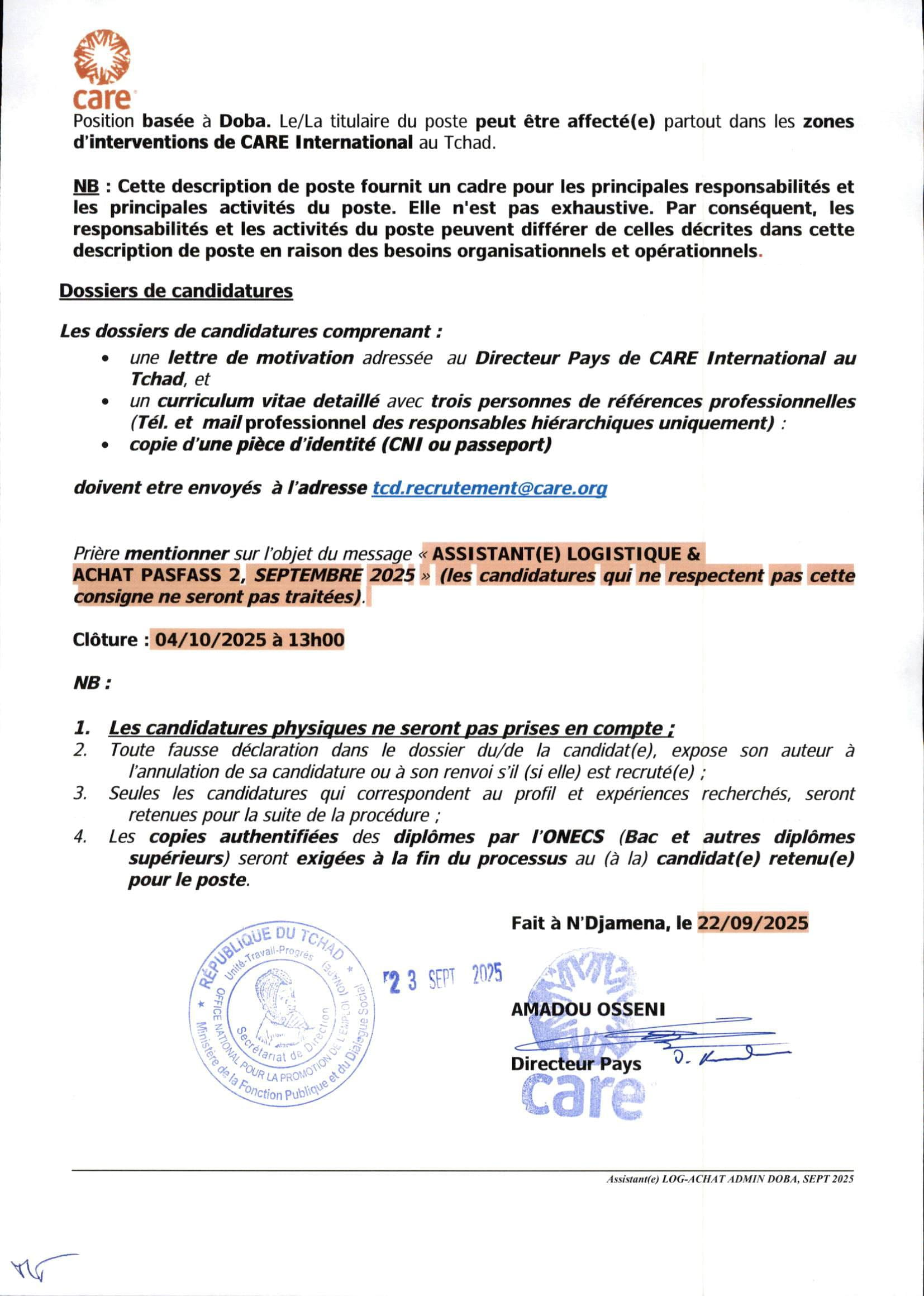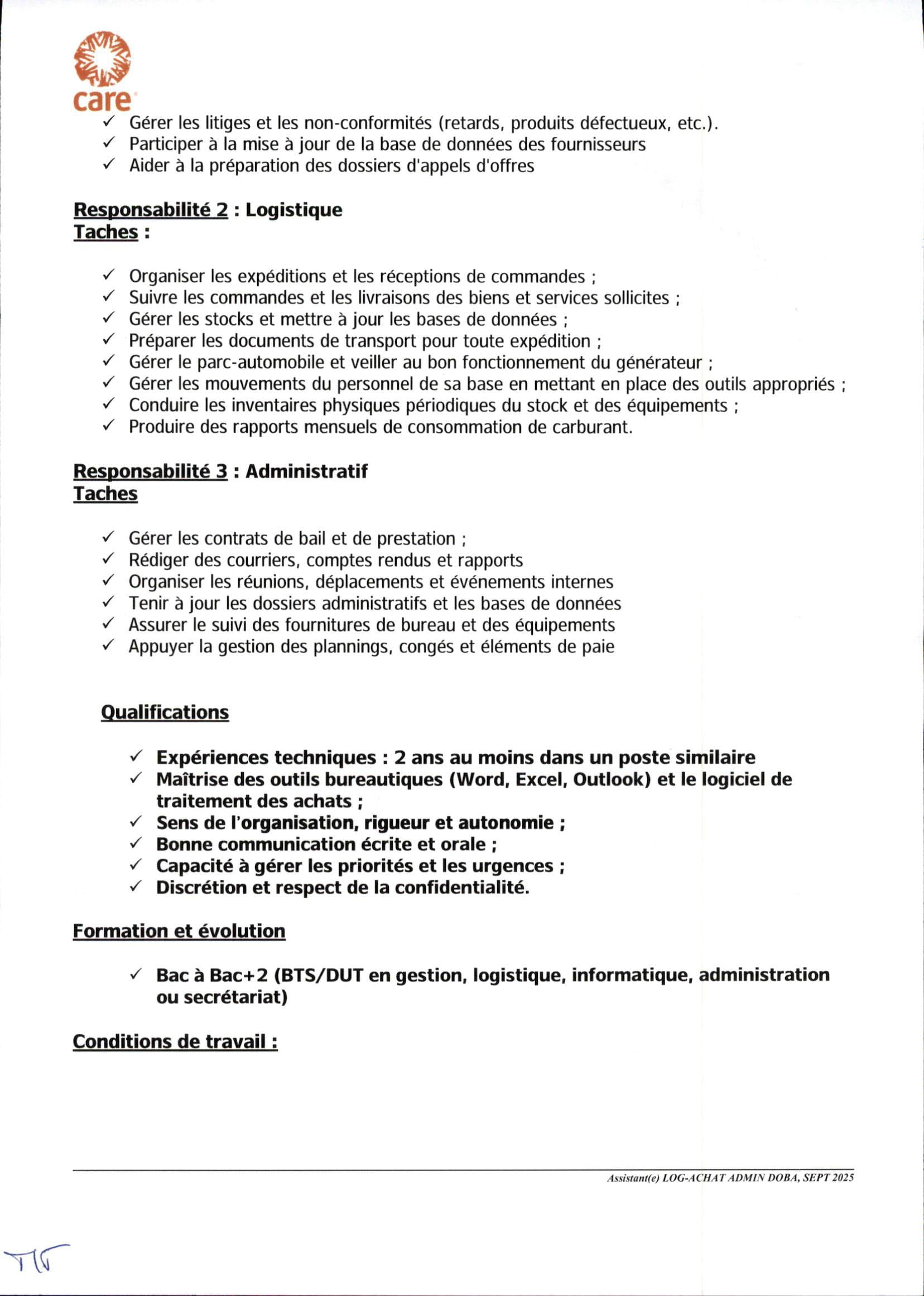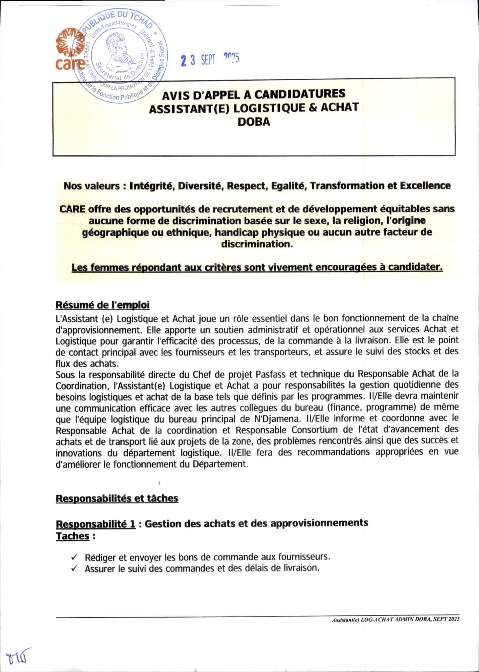 CARE recrute un assistant logistique & achat (H/F), Doba, Tchad Sep 23, 2025 CARE recrute un assistant logistique & achat (H/F), Doba, Tchad Share on FacebookTweetFollow usSaveHuman Ressource Solutions (HSD) recrute pour le poste de business development manager, N’Djamena, TchadLe cabinet CEFOREP SARL lance une formation avec certification en action humanitaireAppel à candidature pour les bourses de doctorat entièrement financées par l’Université Carlo Cattaneo, en Italie.Bourses de doctorat de l’Université de Varsovie, en Pologne.