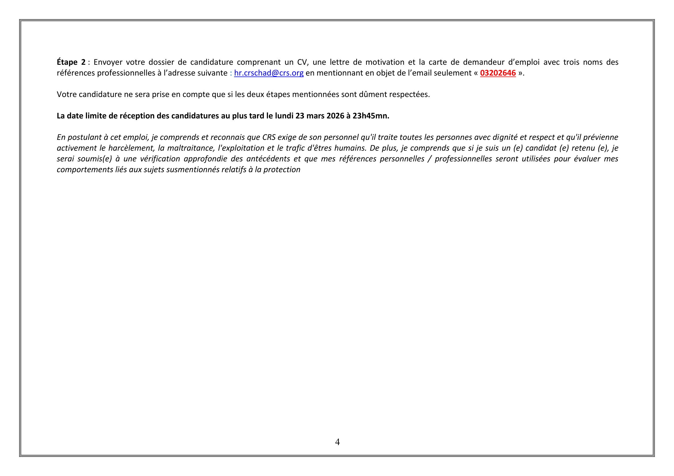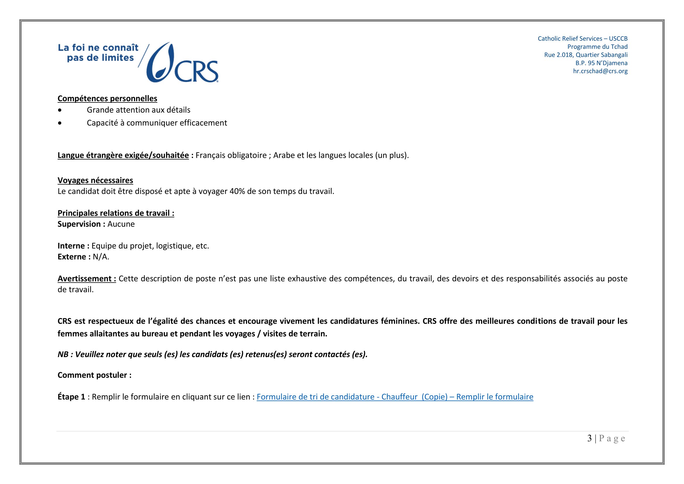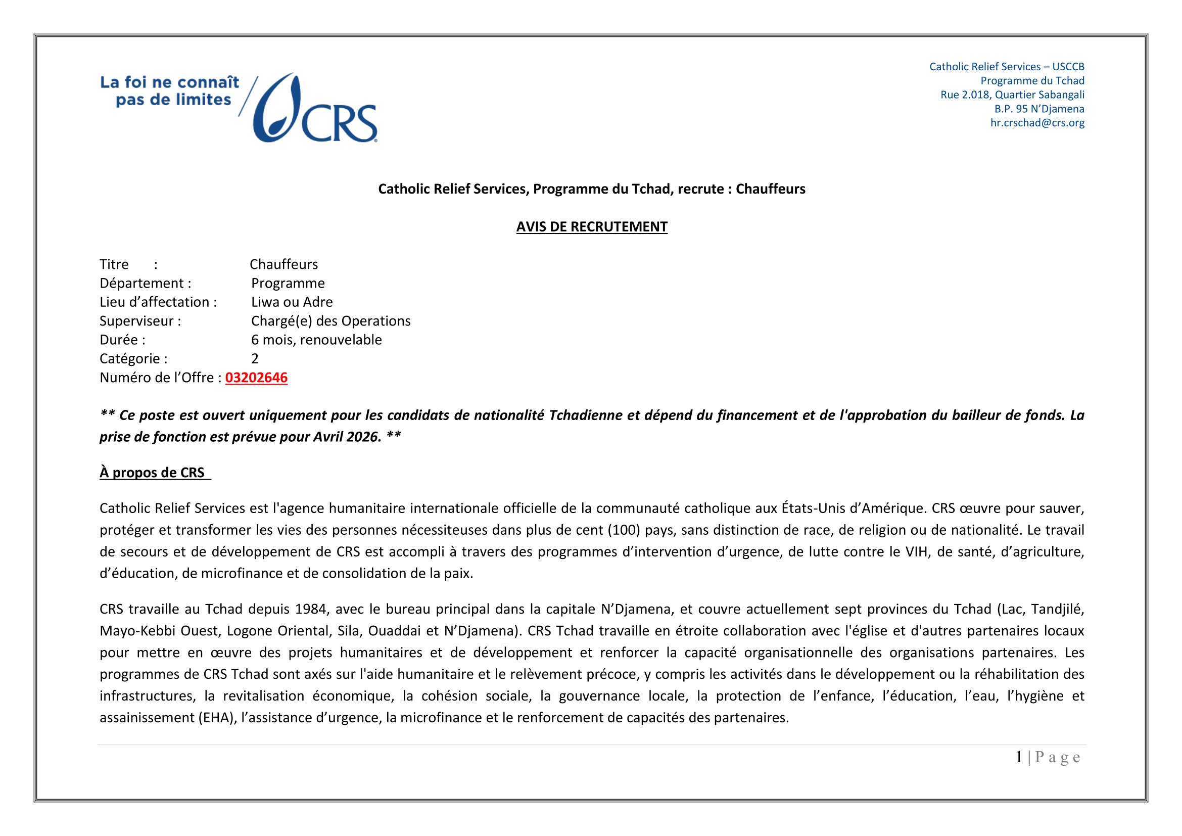 Catholic Relief Services (CRS) lance le recrutement d’un Chauffeur, Liwa ou Adré, Tchad Mar 18, 2026 Catholic Relief Services (CRS) lance le recrutement d’un Chauffeur, Liwa ou Adré, Tchad Formulaire de tri de candidature – Chauffeur (Copie) – Remplir le formulaire Share on FacebookTweetFollow usSaveAppel à candidatures pour les bourses d’études Banach NAWA, Pologne.Action Education recrute un(e) stagiaire appui à la gestion des connaissances, Paris 11, FranceCooperazione Internazionale (COOPI) recherche un assistant administrateur financier (H/F), Sarh, TchadMSF recrute un(e) Coordinateur(trice) Médical Support, N’Djamena, Tchad