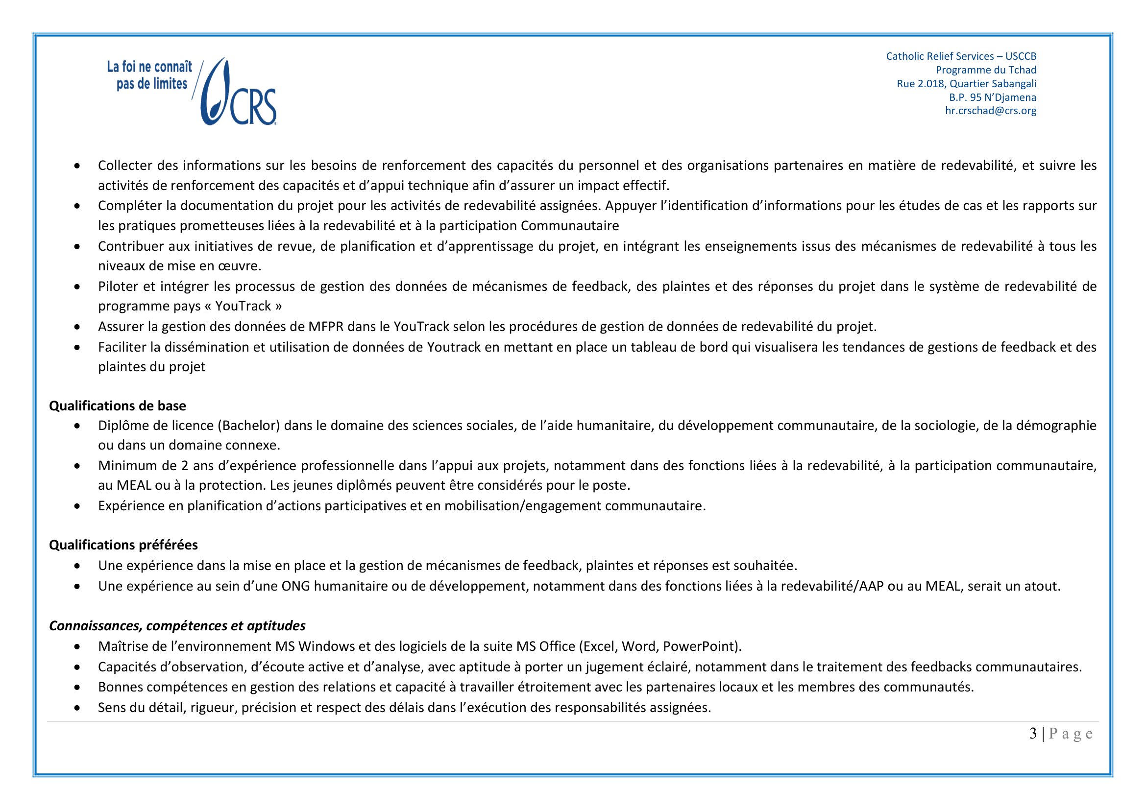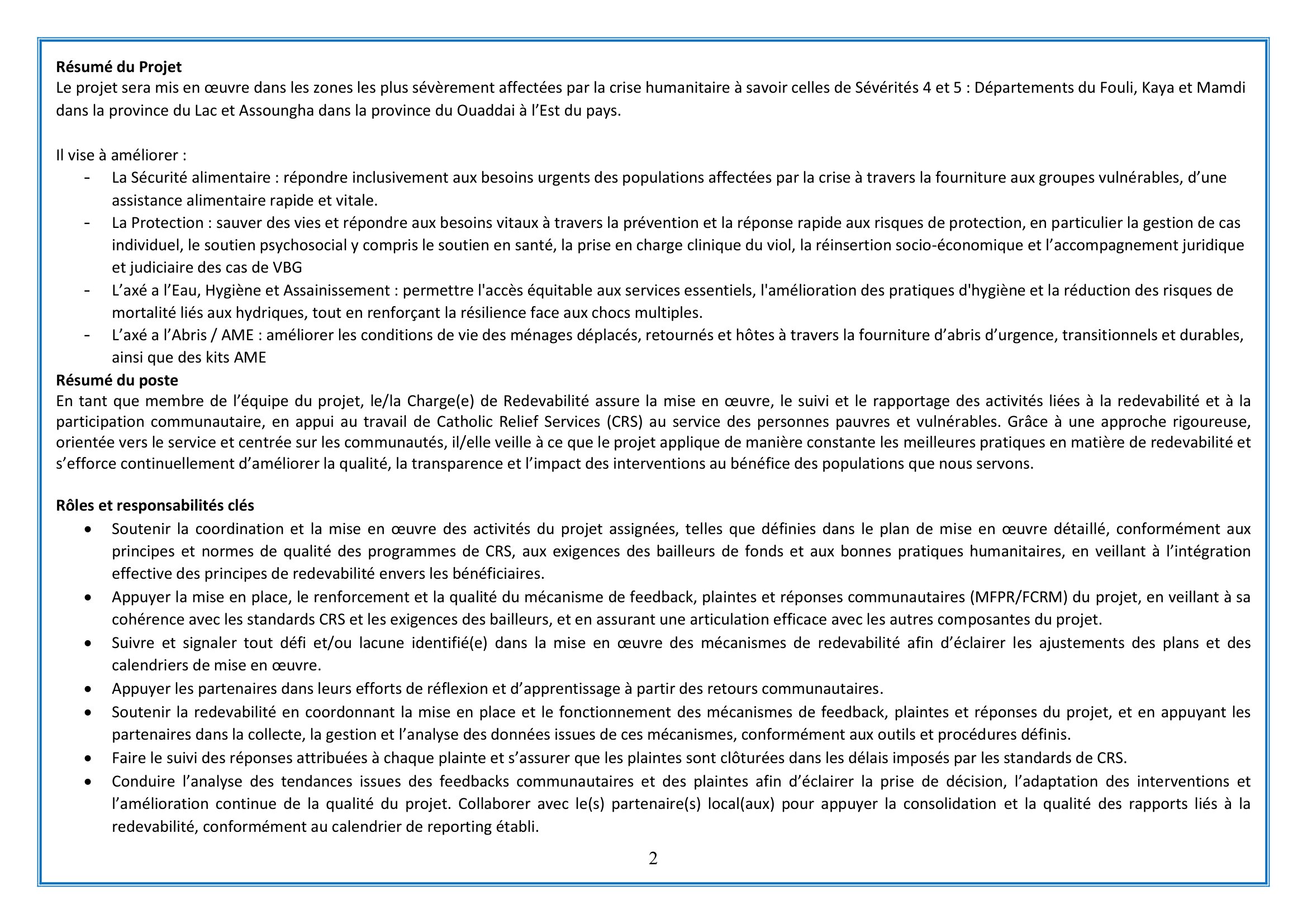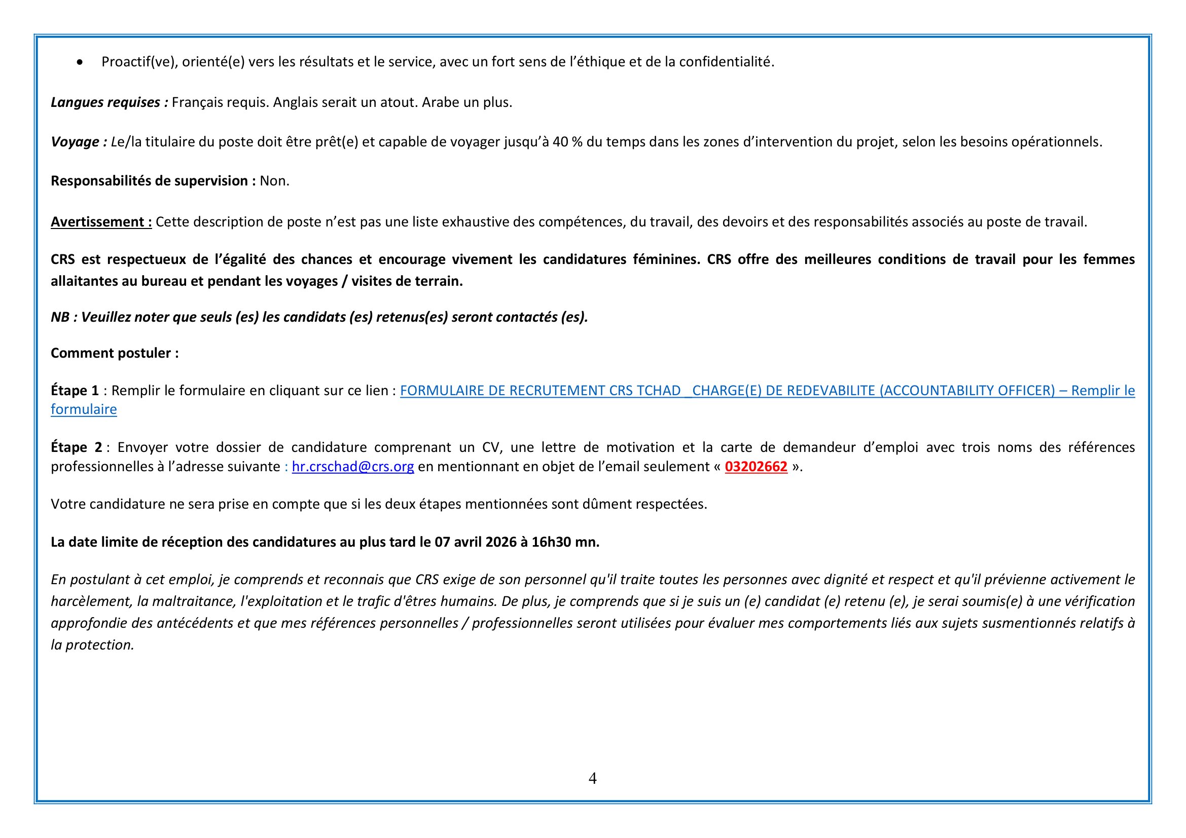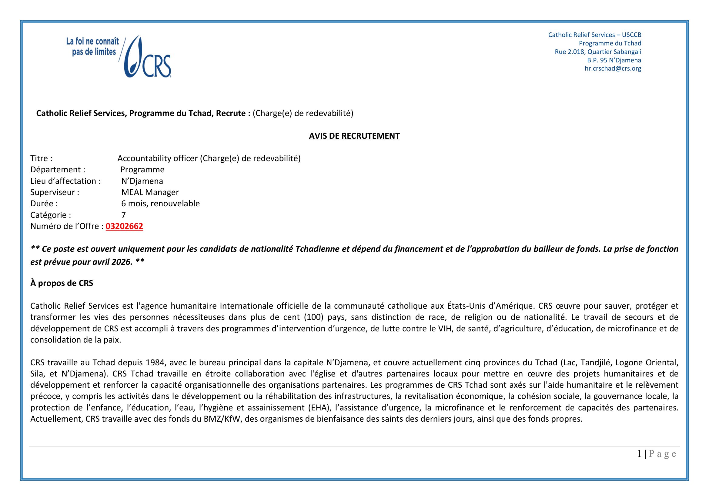 Catholic Relief Services (CRS) recrute un Chargé de redevabilité (H/F), N’Djamena, Tchad Avr 1, 2026 Catholic Relief Services (CRS) recrute un Chargé de redevabilité (H/F), N’Djamena, Tchad FORMULAIRE DE RECRUTEMENT CRS TCHAD _CHARGE(E) DE REDEVABILITE (ACCOUNTABILITY OFFICER) – Remplir le formulaire Share on FacebookTweetFollow usSaveLe consortium NIRAS-CARITAS lance un avis à manifestation d’intérêt pour le recrutement d’un prestataire en charge de la structuration et du renforcement des capacités des producteurs apicoles pour l’implantation d’une miellerieLe Centre de Support en Santé Internationale (CSSI) recrute un responsable administratif et financier (H/F), N’Djamena, TchadLe Bureau des Nations Unies pour les services d’appui aux projets (UNOPS) recherche un(e) Stagiaire en communication, Genève, SuisseBourses d’études de l’académie australienne des sciences technologiques et de l’ingénierie, Australie