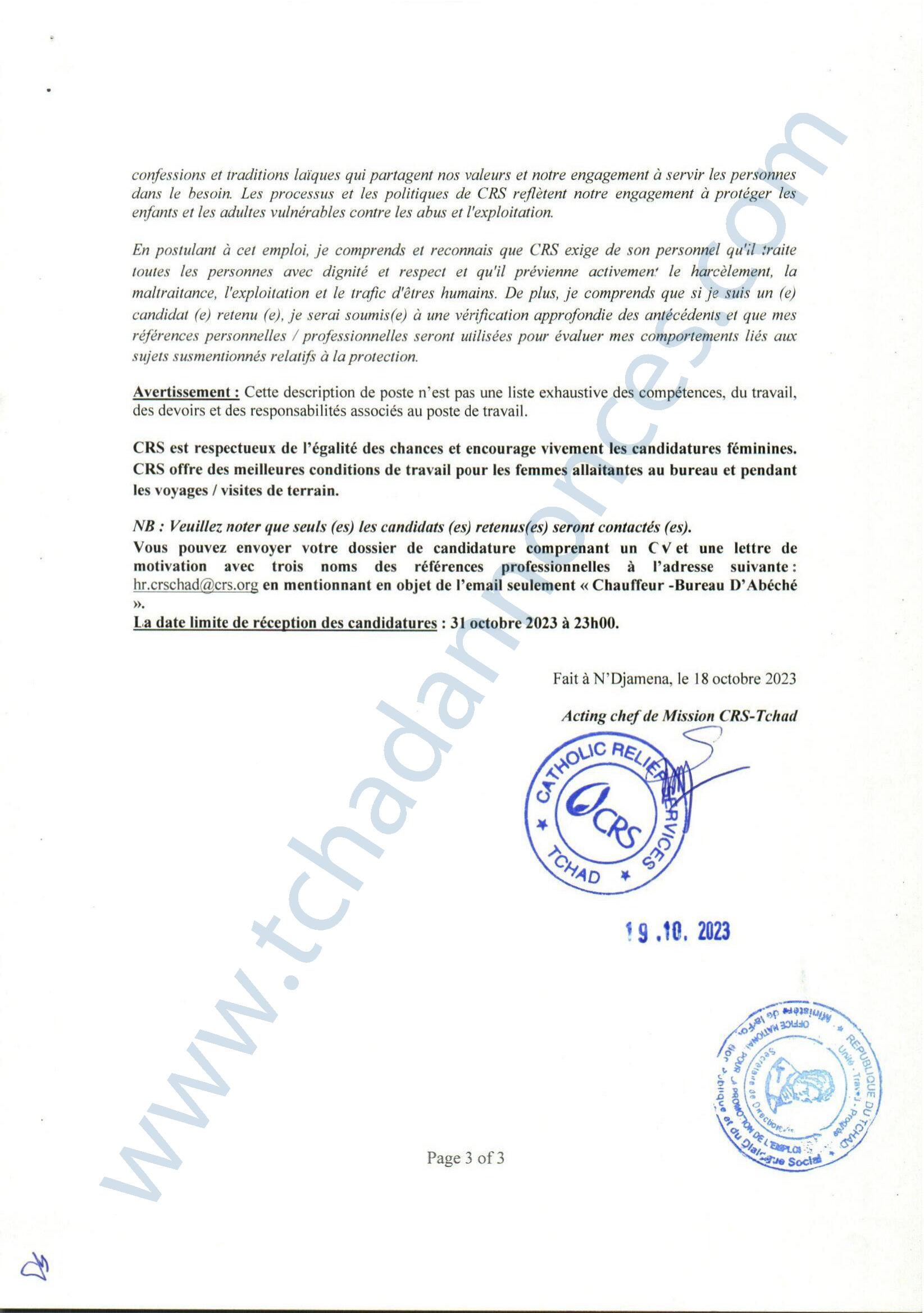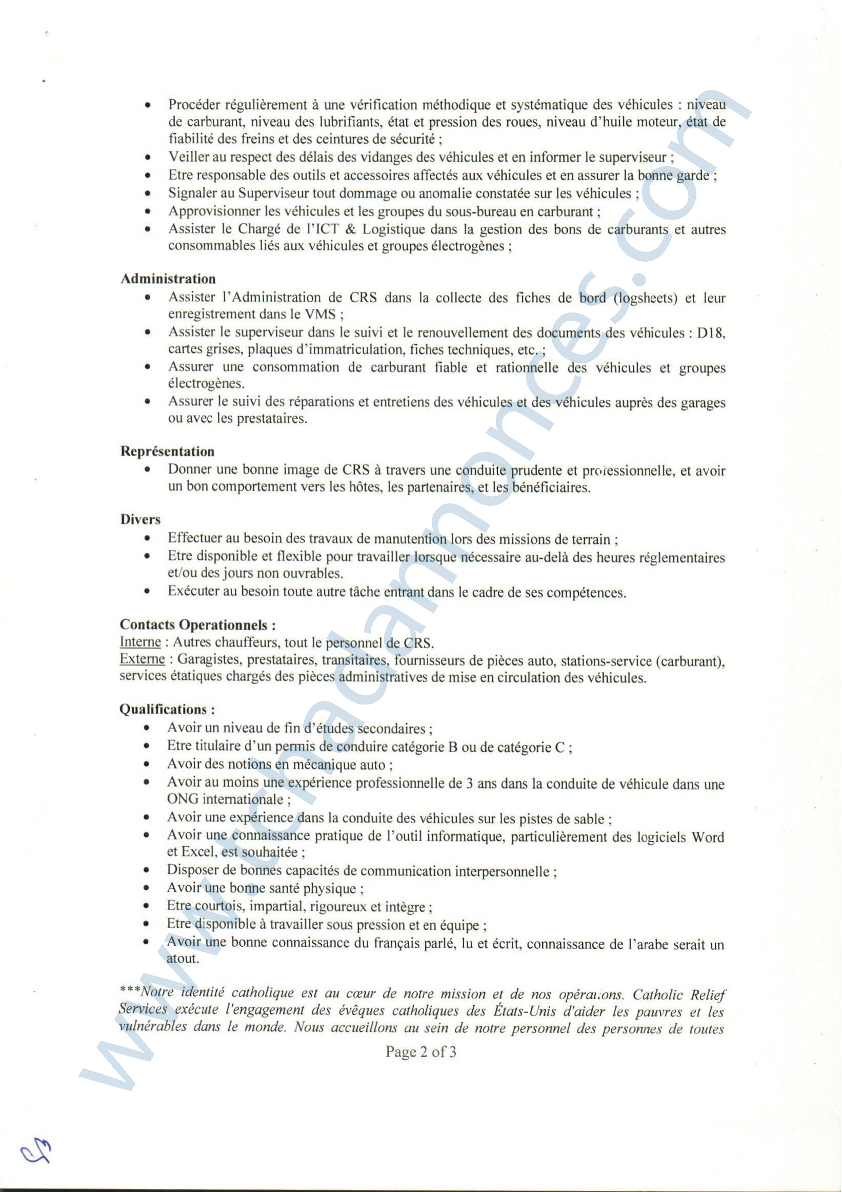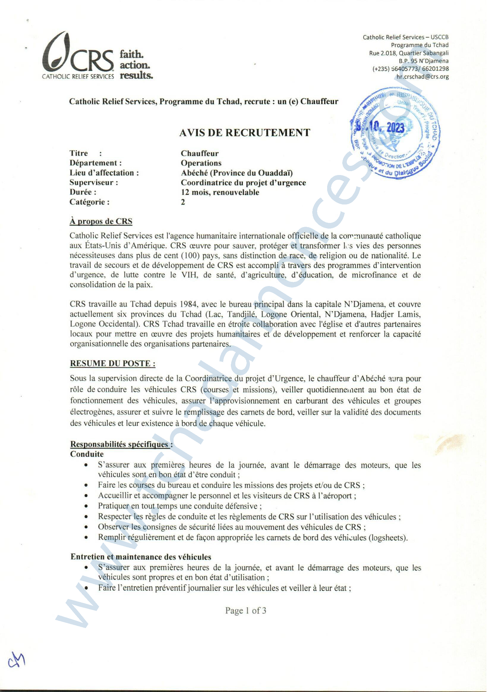 Catholic Relief Services (CRS) recrute un chauffeur (H/F), Abéché, Tchad Oct 20, 2023 Catholic Relief Services (CRS) recrute un chauffeur (H/F), Abéché, Tchad Share on FacebookTweetFollow usSaveLe Programme des Nations Unies pour l’environnement (PNUE) recherche un(e) stagiaire Assistant(e) Gouvernance Océanique, Nairobi, Kenya World Relief lance un avis de recrutement d’un responsable (H/F) Nutrition, Guéréda, Koursigué, TchadLe Bureau de l’OMS recrute un stagiaire pour le poste de gestion de projet, Congo-BrazzavilleLe cabinet CESERH organise une formation sur la planification des projets avec Ms Project, N’Djamena, Tchad