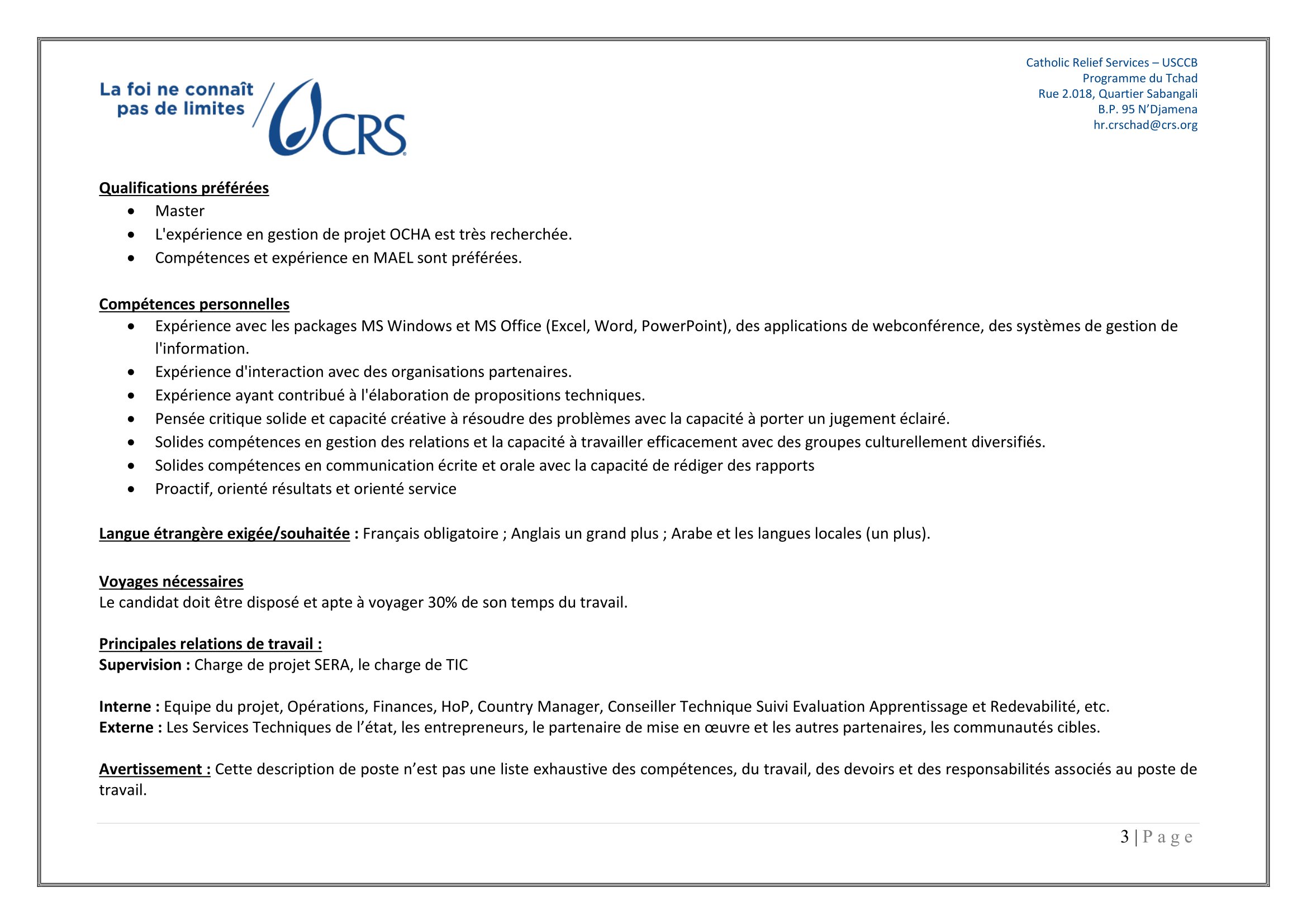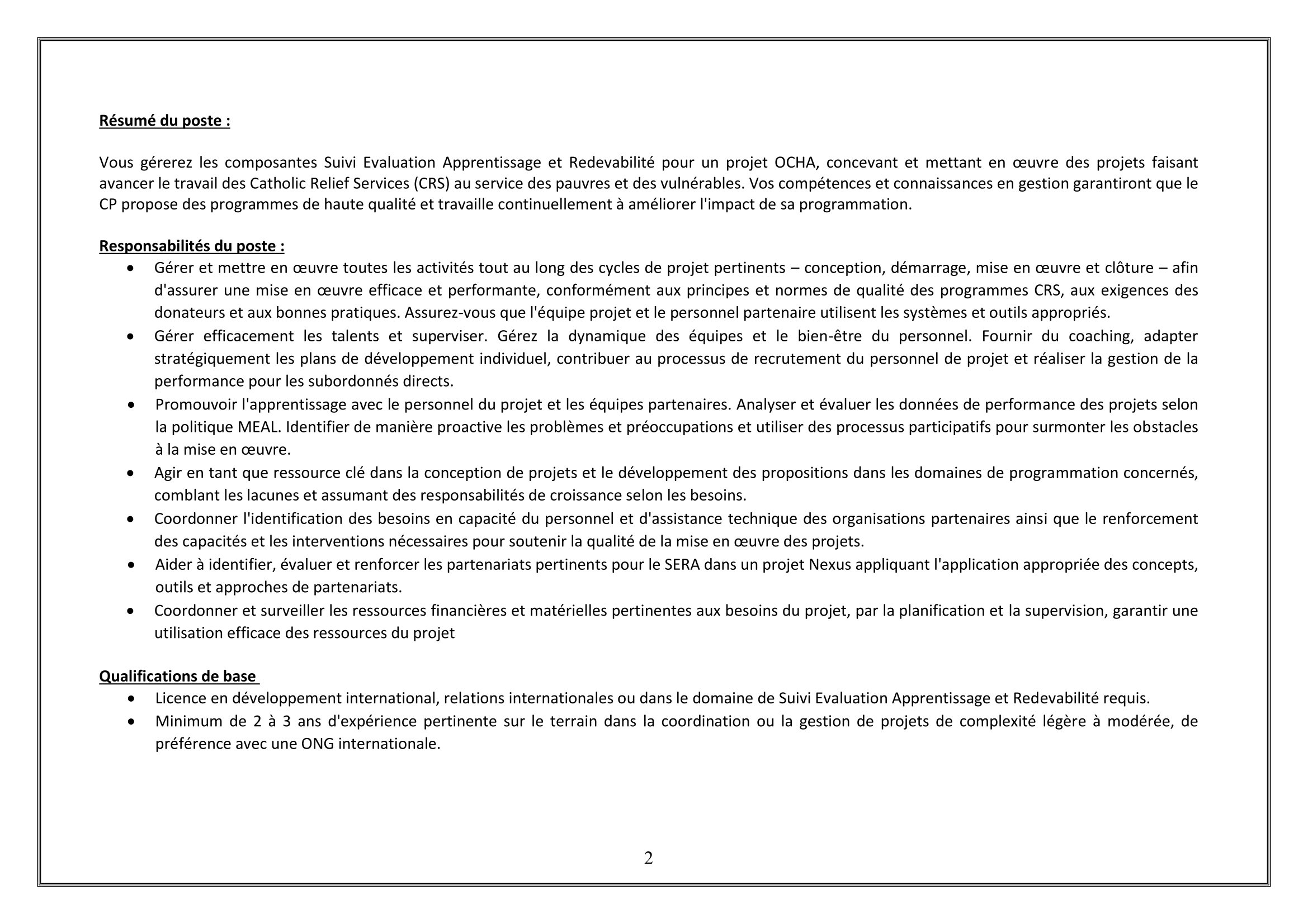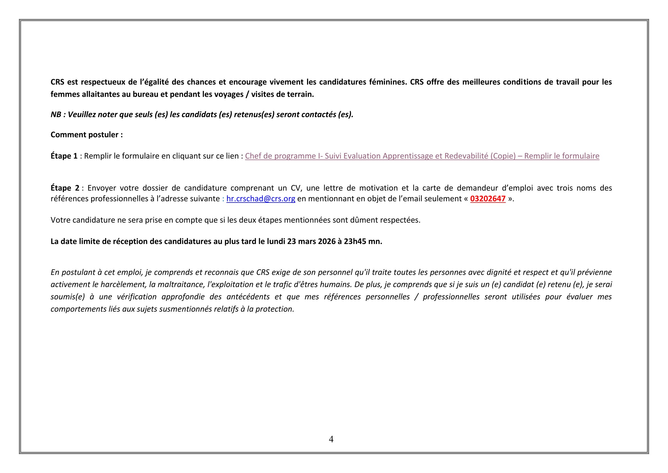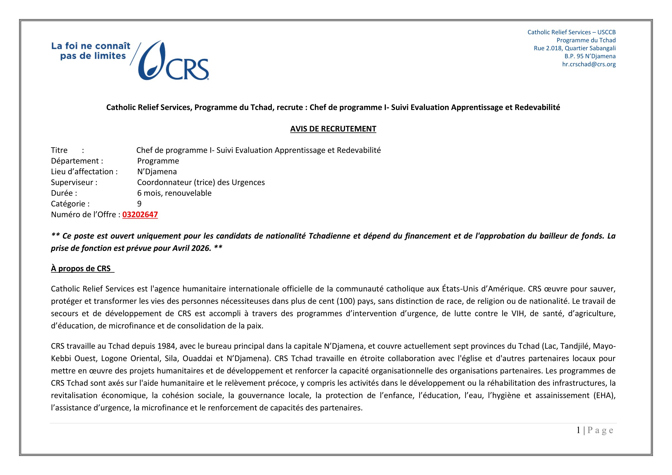Catholic Relief Services (CRS) recrute un Chef de Programme I- SERA, N’Djamena, Tchad Mar 18, 2026 Catholic Relief Services (CRS) recrute un Chef de Programme I- SERA, N’Djamena, Tchad Chef de programme I- Suivi Evaluation Apprentissage et Redevabilité (Copie) – Remplir le formulaire Share on FacebookTweetFollow usSaveAppel à candidatures pour les bourses d’études Banach NAWA, Pologne.Action Education recrute un(e) stagiaire appui à la gestion des connaissances, Paris 11, FranceCooperazione Internazionale (COOPI) recherche un assistant administrateur financier (H/F), Sarh, TchadMSF recrute un(e) Coordinateur(trice) Médical Support, N’Djamena, Tchad