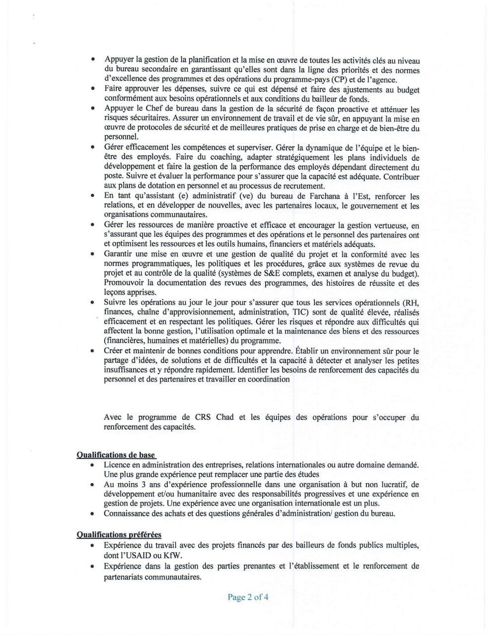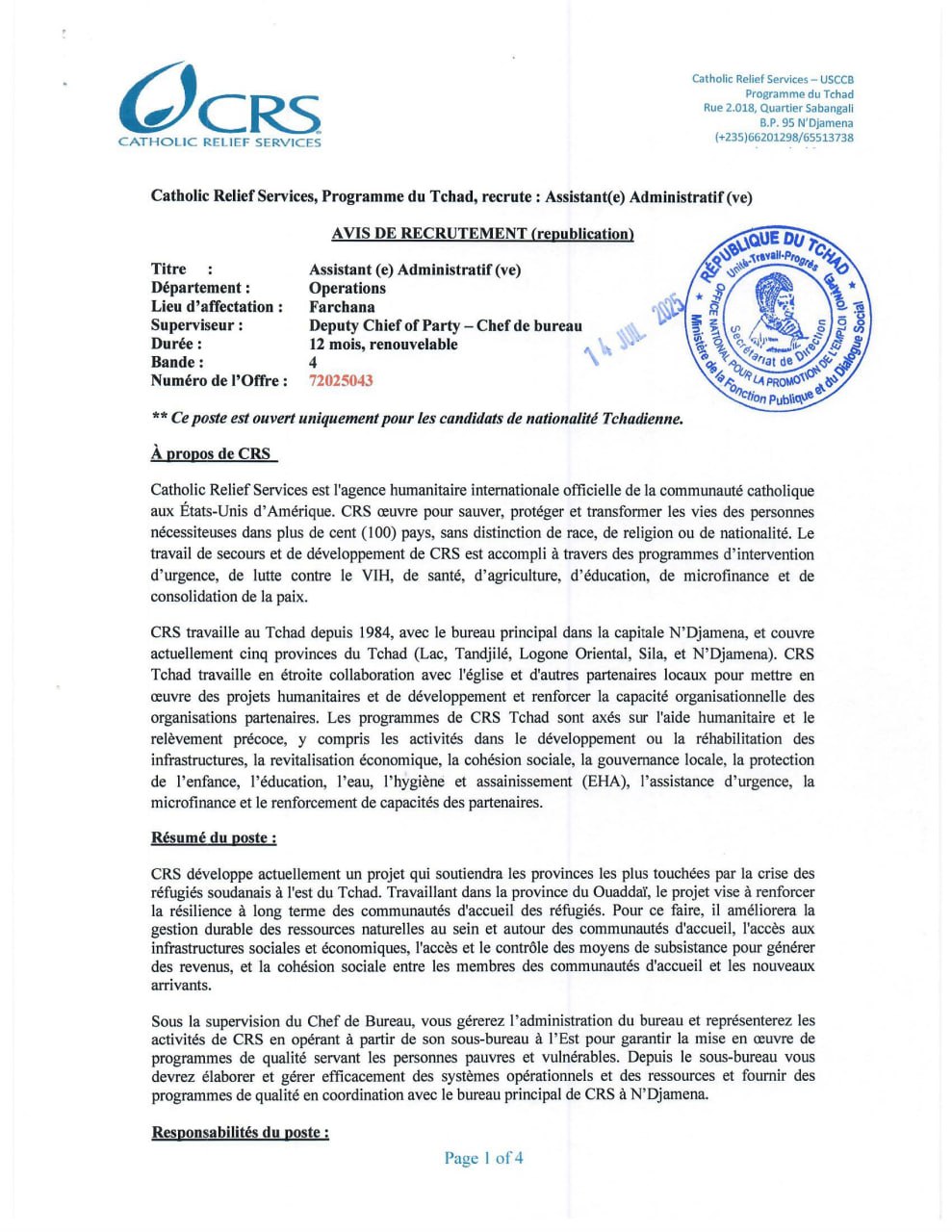 Catholic Relief Services recrute un assistant administratif (H/F), Farchana, Tchad