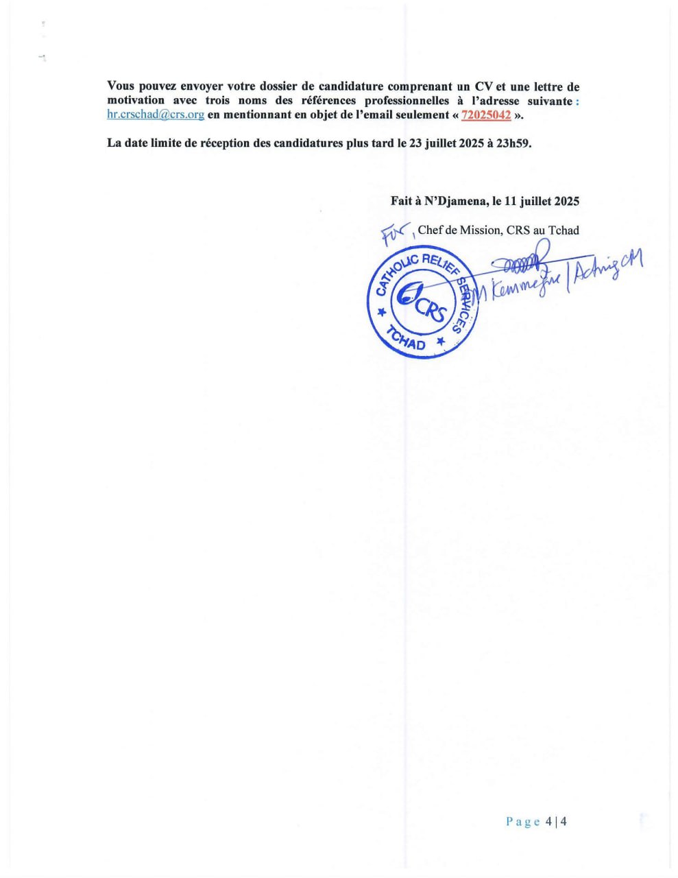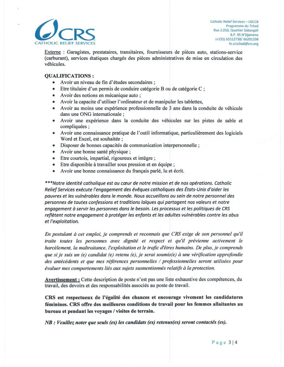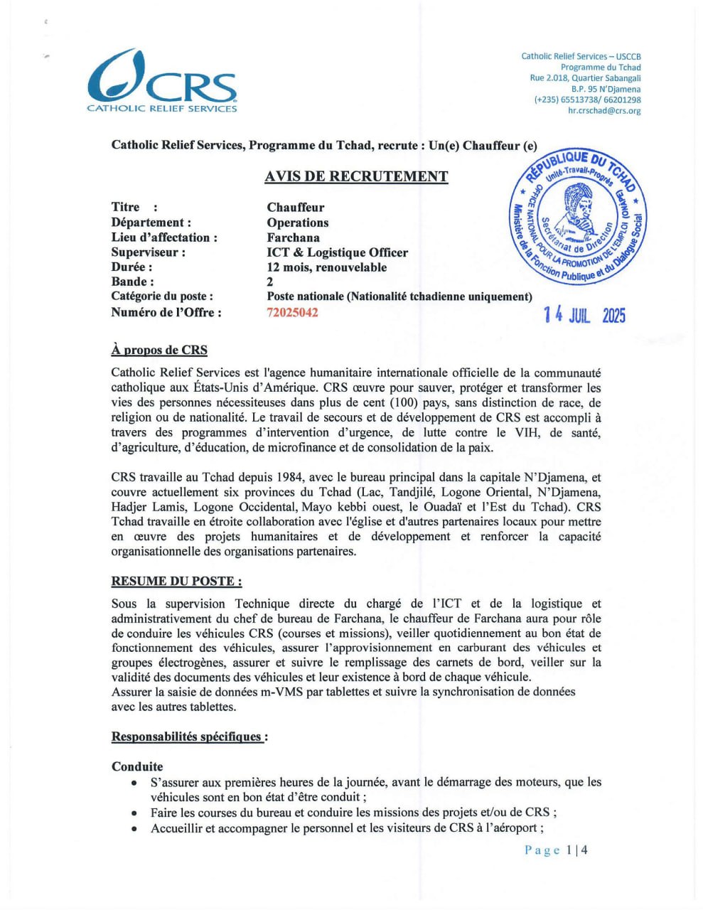 Catholic Relief Services recrute un chauffeur (H/F), Farchana, Tchad