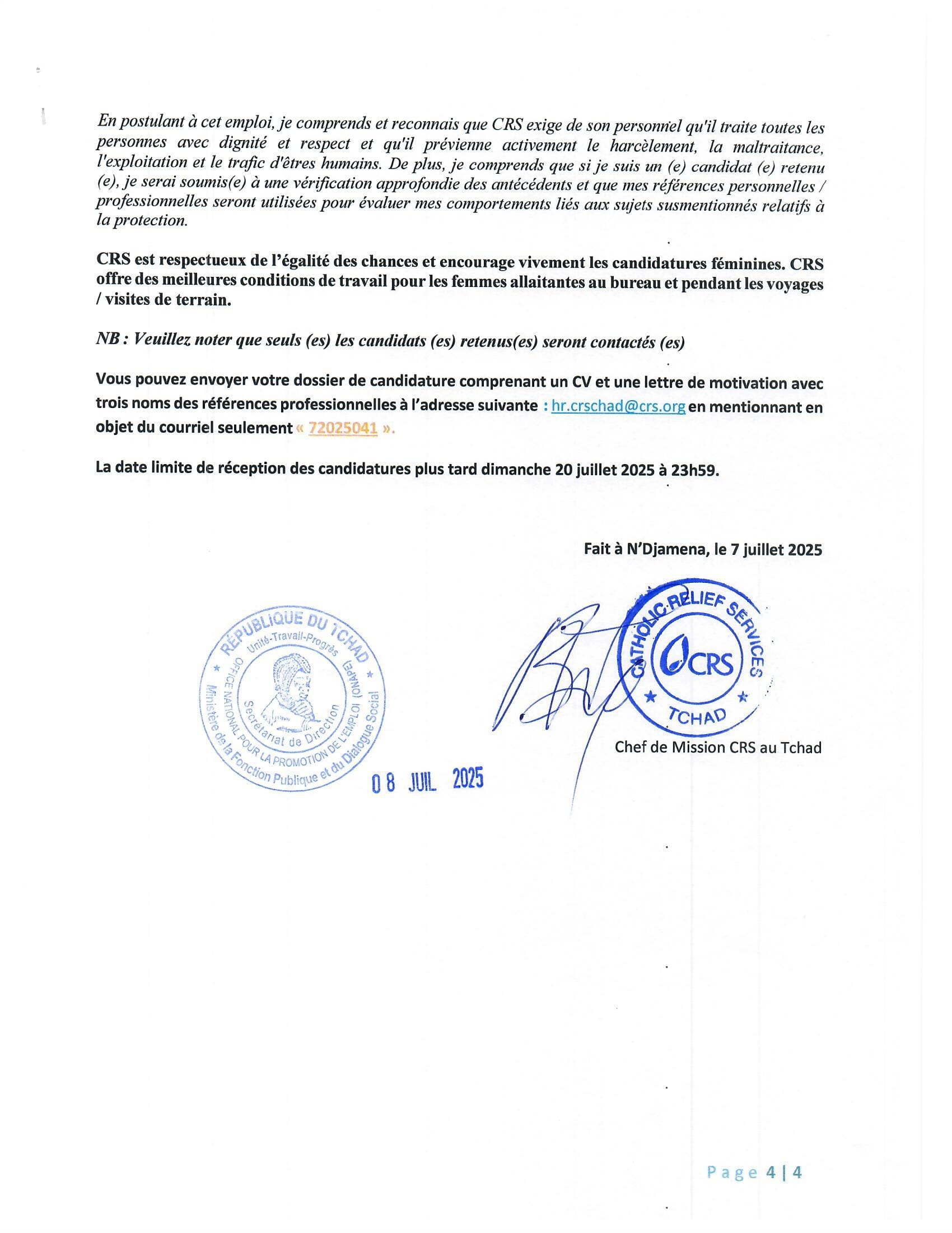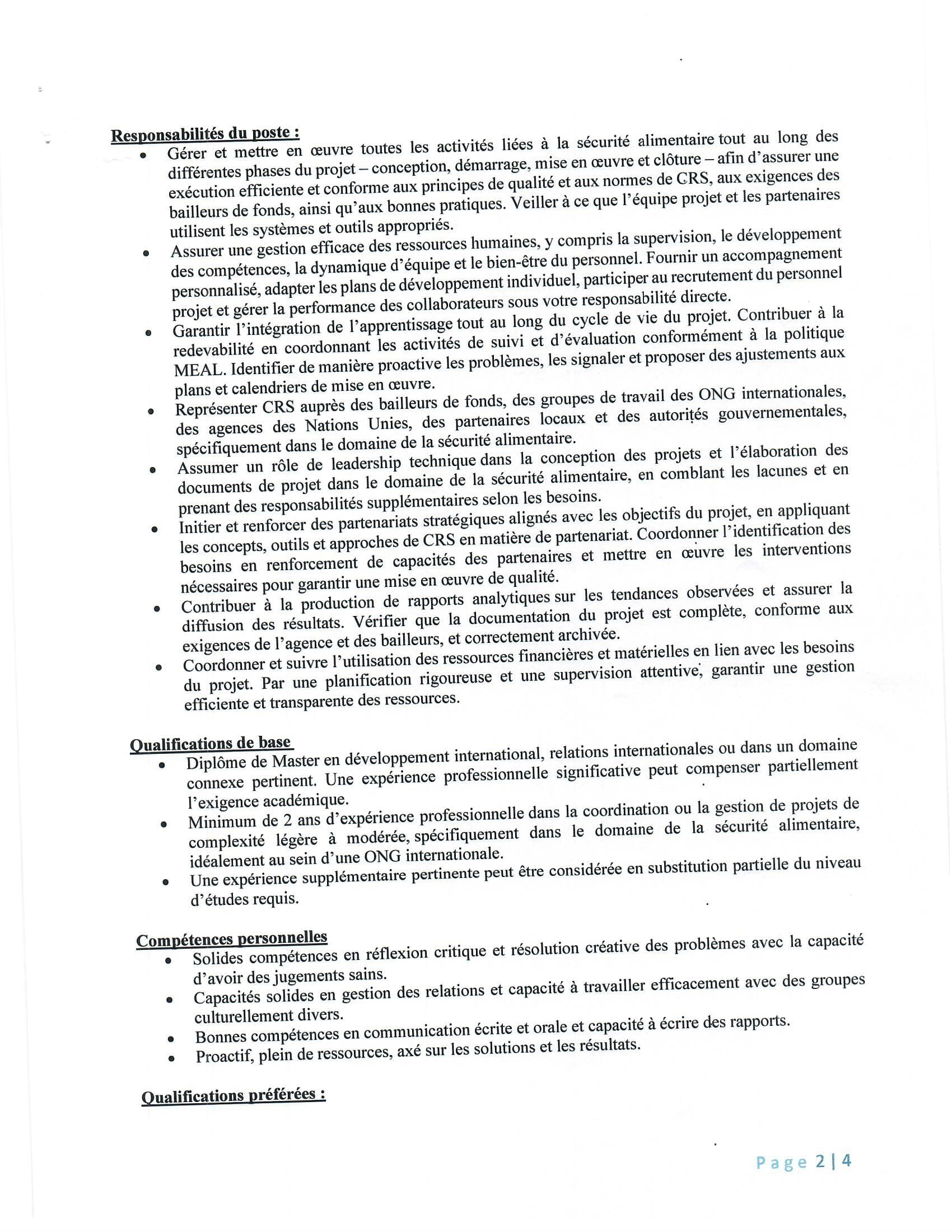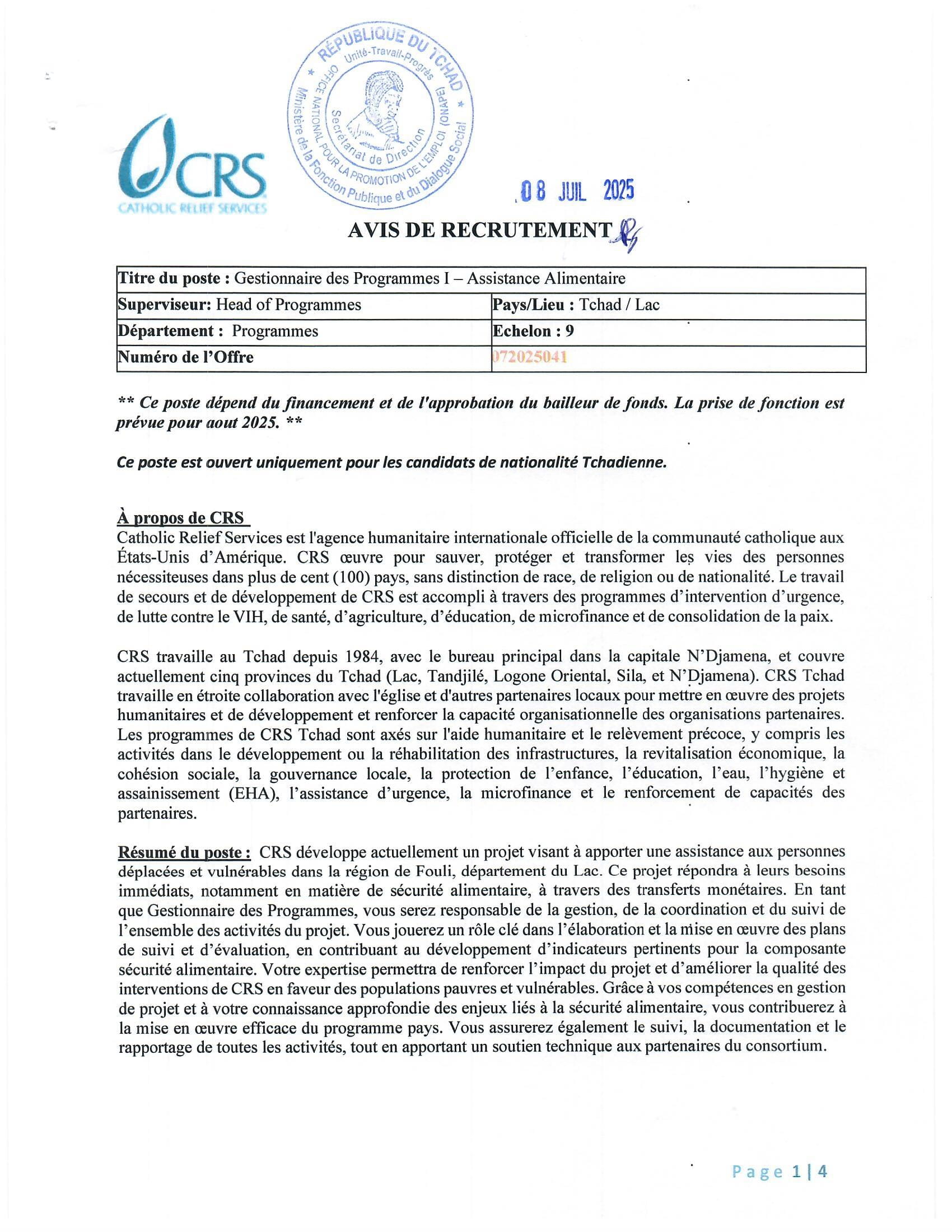 Catholic Relief Services recrute un gestionnaire des programmes 1- Assistance alimentaire, lac, Tchad Juil 8, 2025 Catholic Relief Services recrute un gestionnaire des programmes 1- Assistance alimentaire, lac, Tchad Share on FacebookTweetFollow usSaveCARITAS Suisse lance un avis de marche de fourniture pour la fourniture et mise en œuvre de deux (2) véhicules tout terrain pour le projet « Appui à la valorisation des Produits Forestiers Non-Ligneux (PFNL) au Tchad »Appel à candidatures pour les bourses d’études supérieures de recherche de l’Université Brunei DarussalamLa Fédération Luthérienne Mondiale (FLM) lance un avis d’appel à manifestation d’intérêt pour la fourniture des matériels et matériaux de construction à son bureau à Gozbeida, TchadFHI 360 recrute un Stagiaire Assistant de programme, Tunis, Tunisie