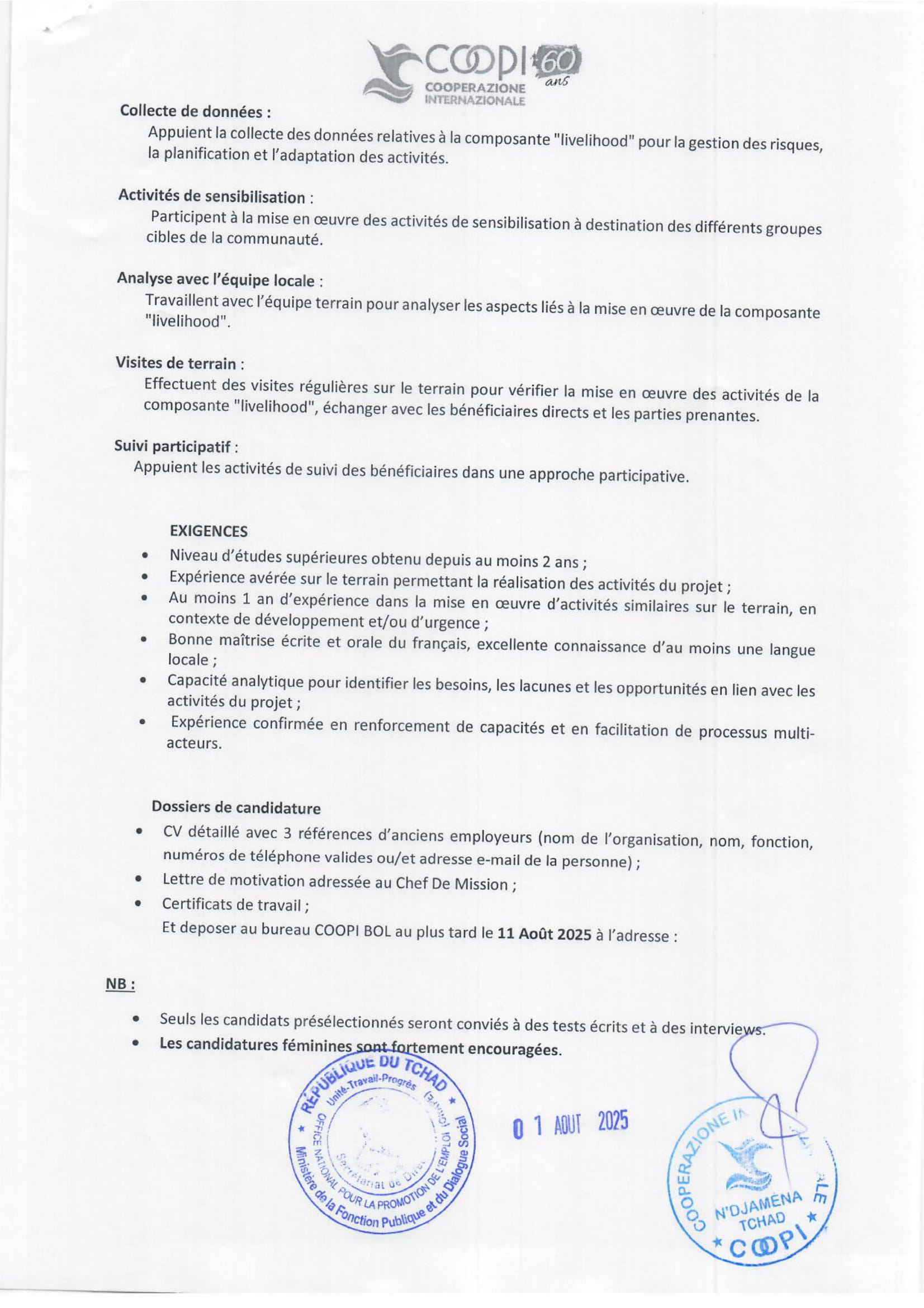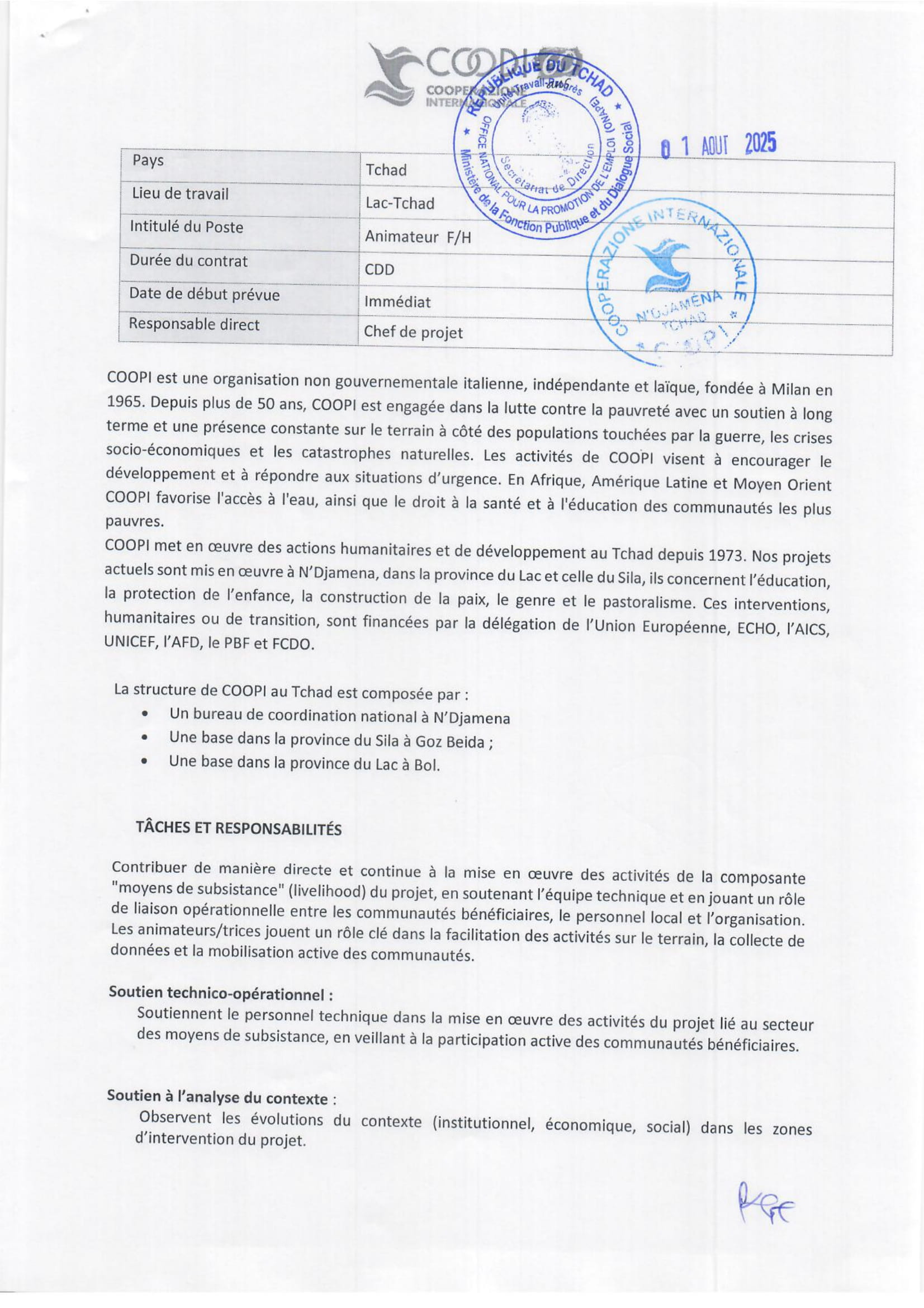 Cooperazione Internazionale (COOPI) recherche un animateur (H/F), Lac Tchad
