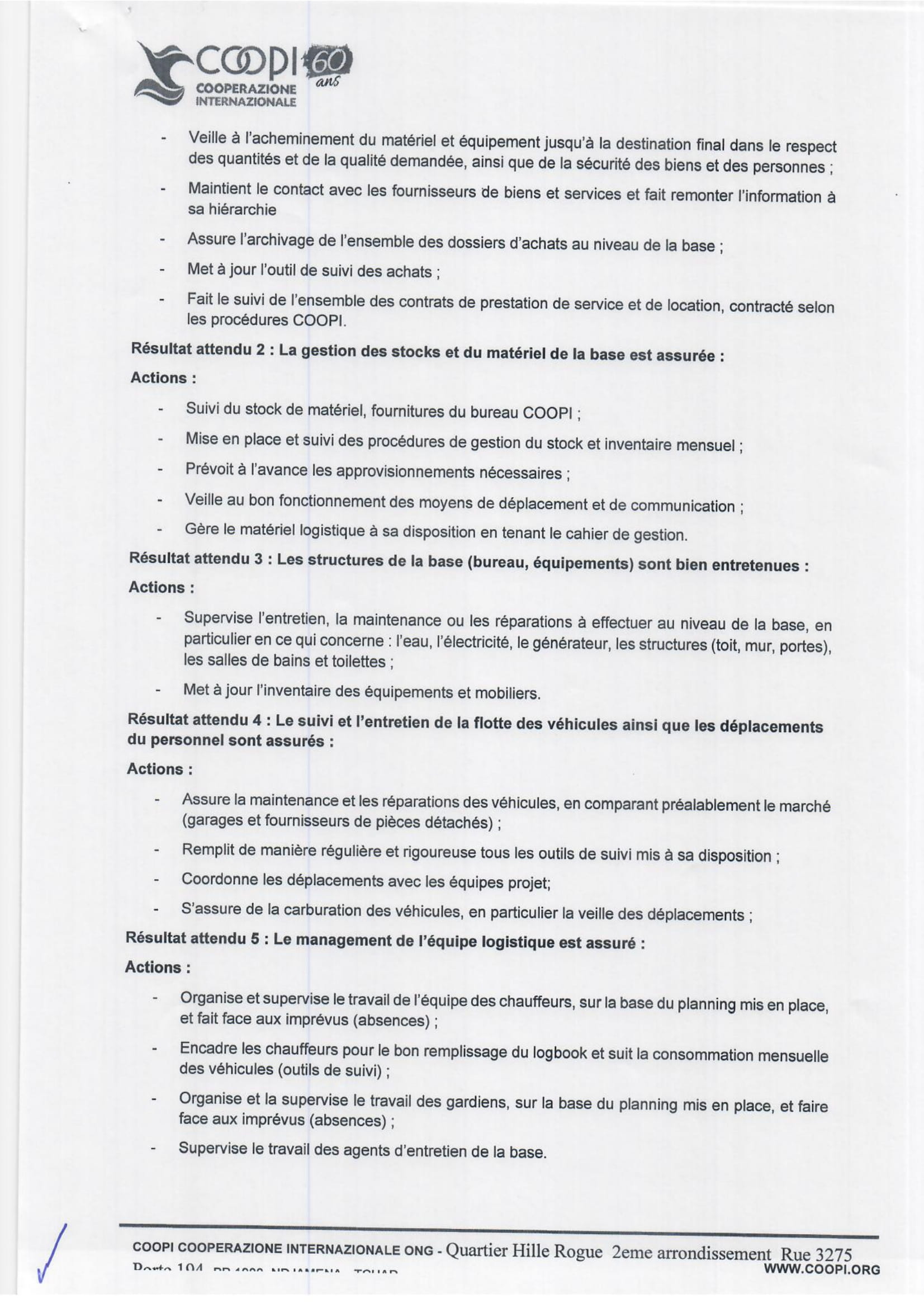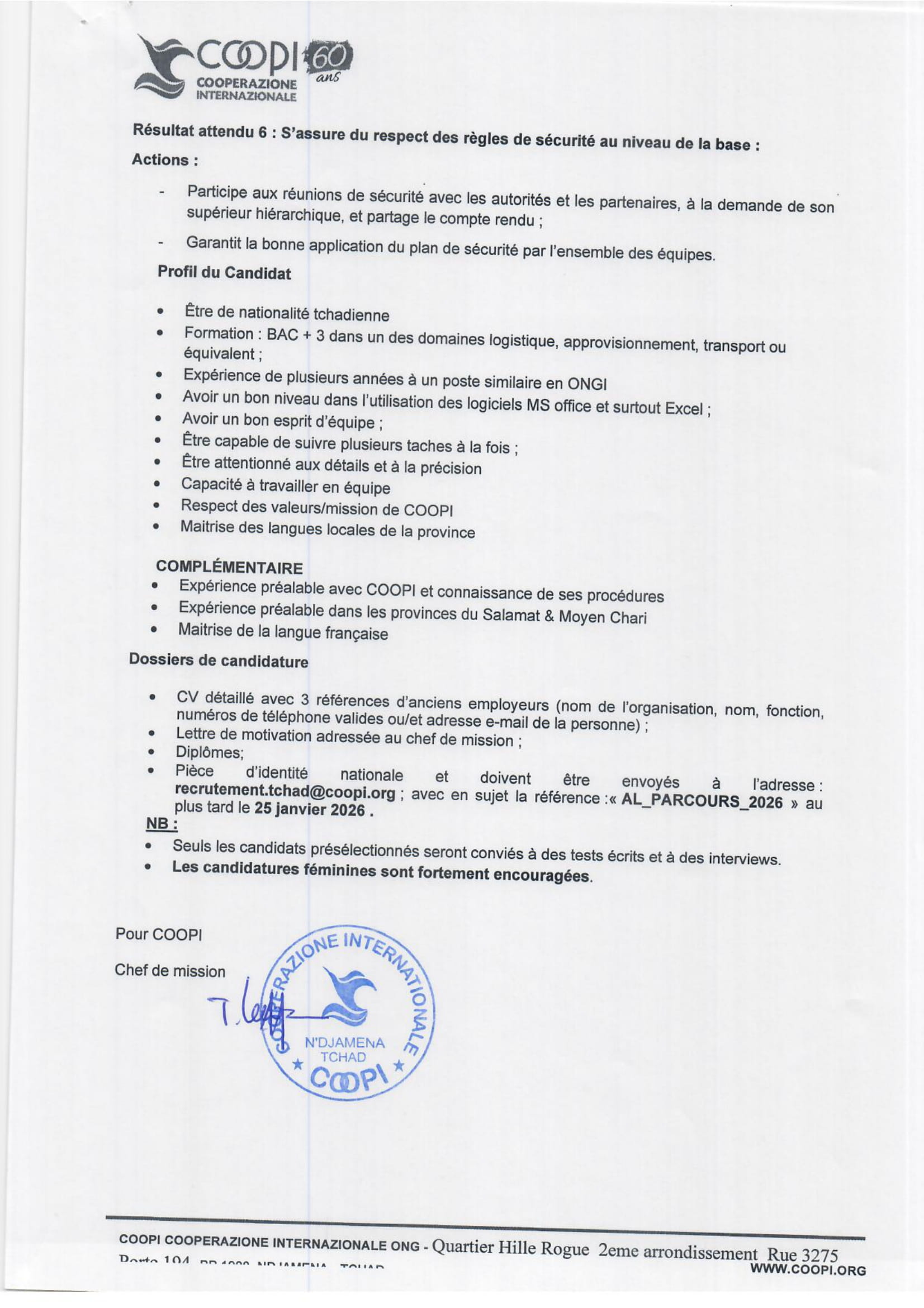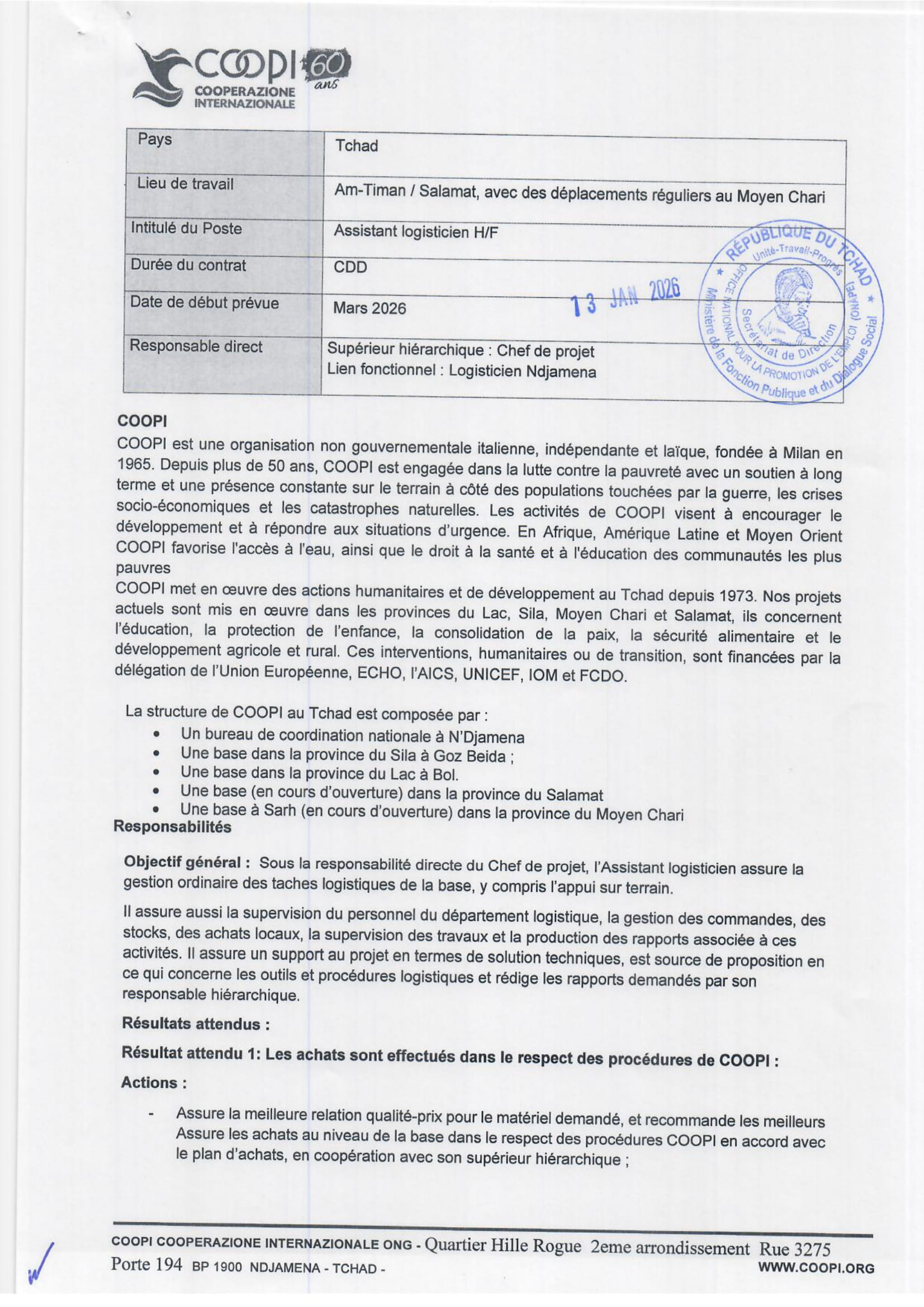 Cooperazione Internazionale (COOPI) recrute un Assistant Logisticien (H/F), Am-Timan, Tchad Jan 14, 2026 Cooperazione Internazionale (COOPI) recrute un Assistant Logisticien (H/F), Am-Timan, Tchad Share on FacebookTweetFollow usSaveCRS recrute un chargé de projet restauration des terres (H/F), Bol, TchadLe Réseau Accès aux Médicaments Essentiels (RAME) lance un appel à candidatures pour le recrutement d’un(e) stagiaire en Suivi-évaluation et gestion des données, Ouagadougou, Burkina FasoCEFOREP SARL organise une formation sur le suivi et évaluation des projets, Kobo collect et SPSS, N’Djamena, Tchad Acted recrute un stagiaire en contrôle de gestion, Paris, France