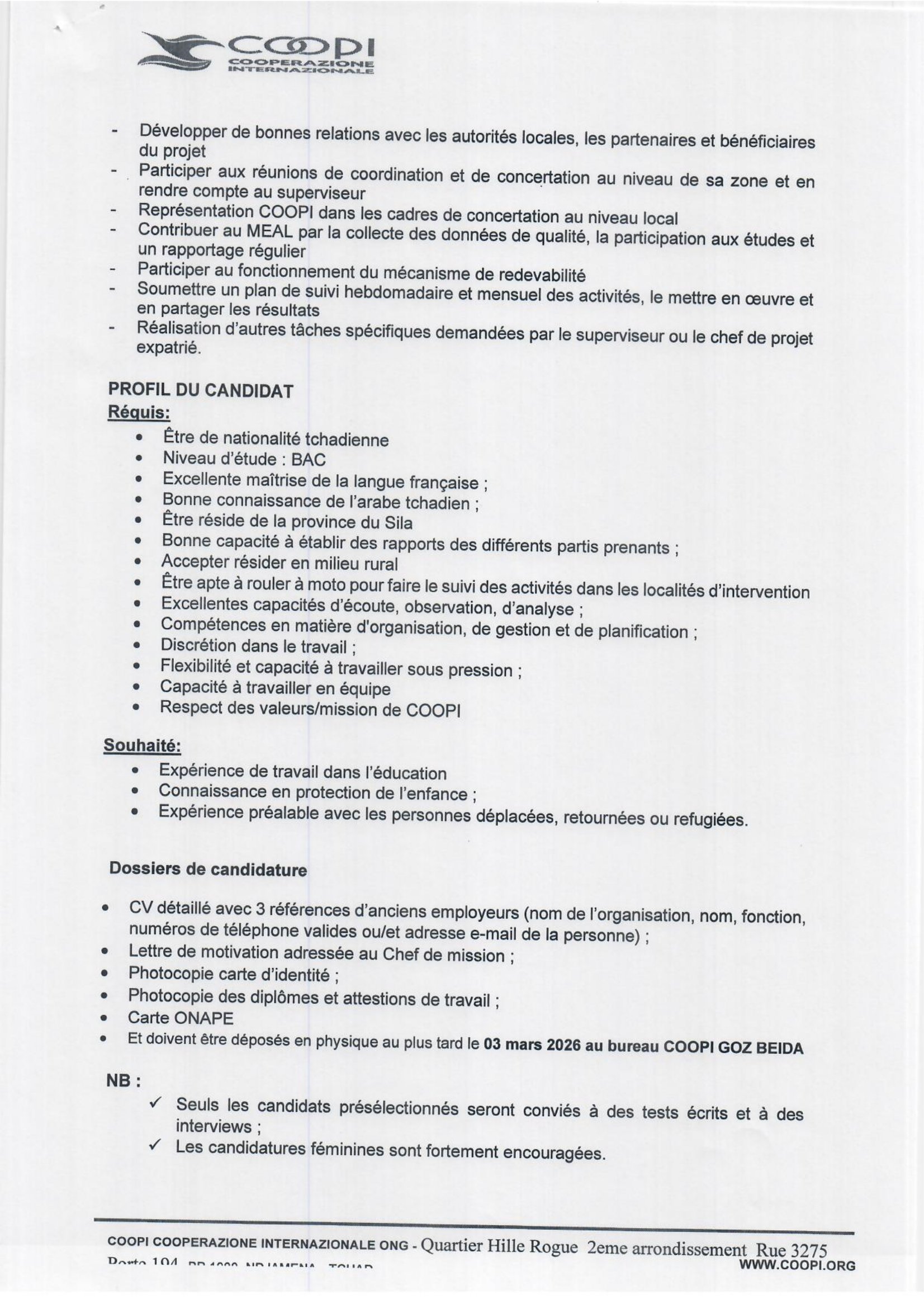 COOPI recrute un Animateur (H/F), Sila, Tchad