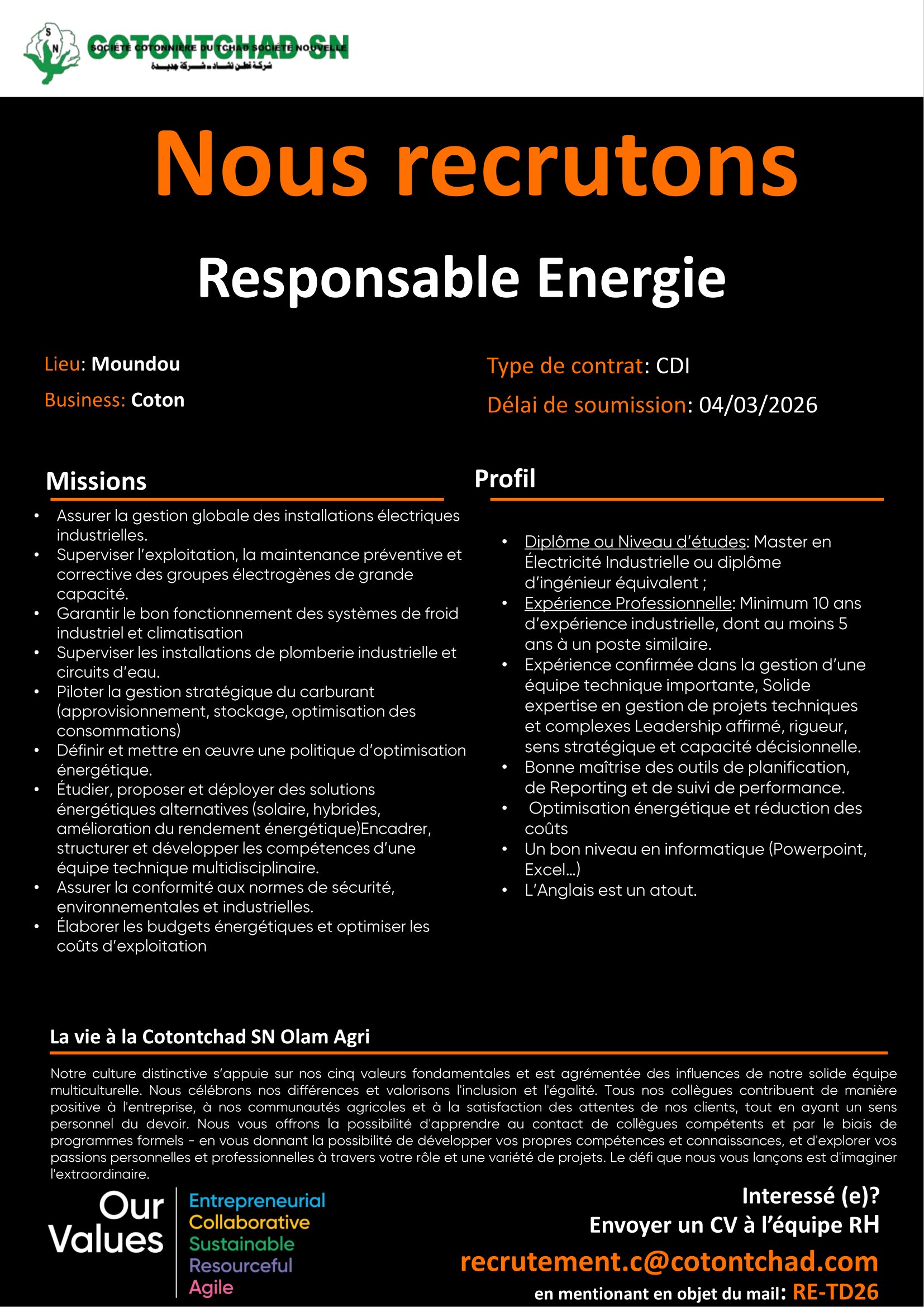 Coton Tchad SN recrute un Responsable Energie, Moundou, Tchad Fév 23, 2026 Coton Tchad SN recrute un Responsable Energie, Moundou, Tchad Share on FacebookTweetFollow usSaveAppel à candidatures pour les bourses d’études de l’université de Tsukuba, JaponL’ONG Développement Humain Durable (DHD) recrute un Responsable Gestion de l’information & Expert SIG, N’Djamena, TchadReporteurs Sans Frontières (RSF) recherche un Stagiaire en publication et suivi de projets Afrique (H/F), Dakar, SénégalAppel à candidatures pour les bourses d’études à l’Université de Qingdao, Chine