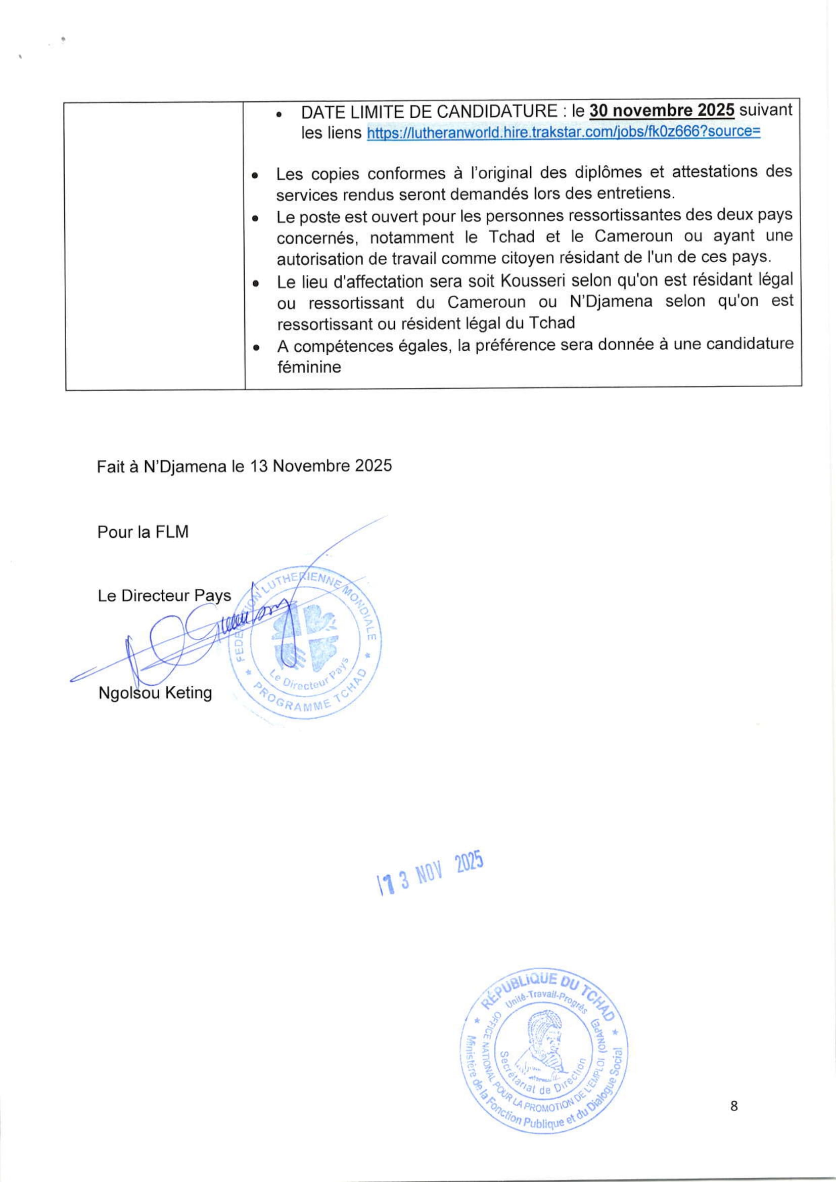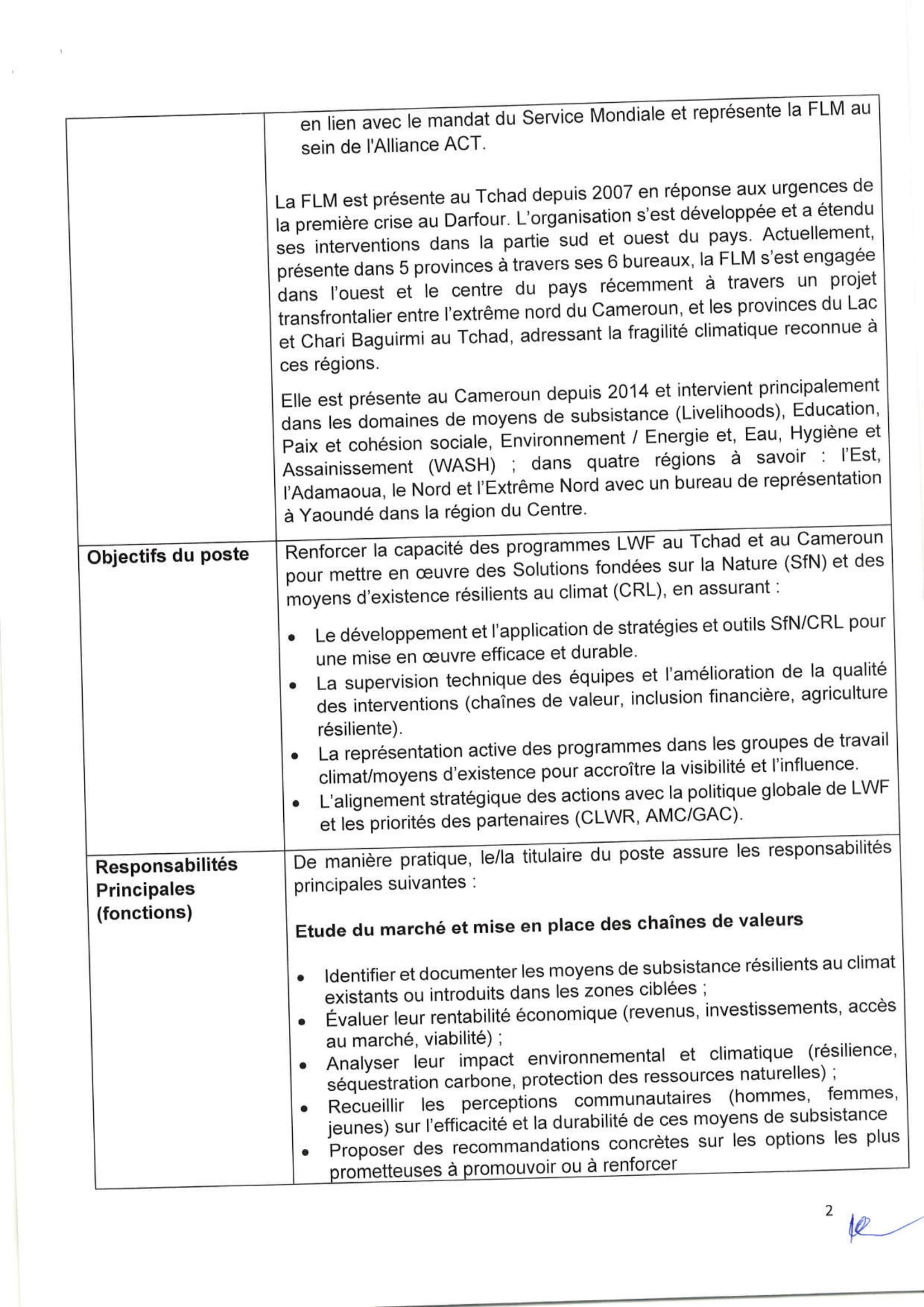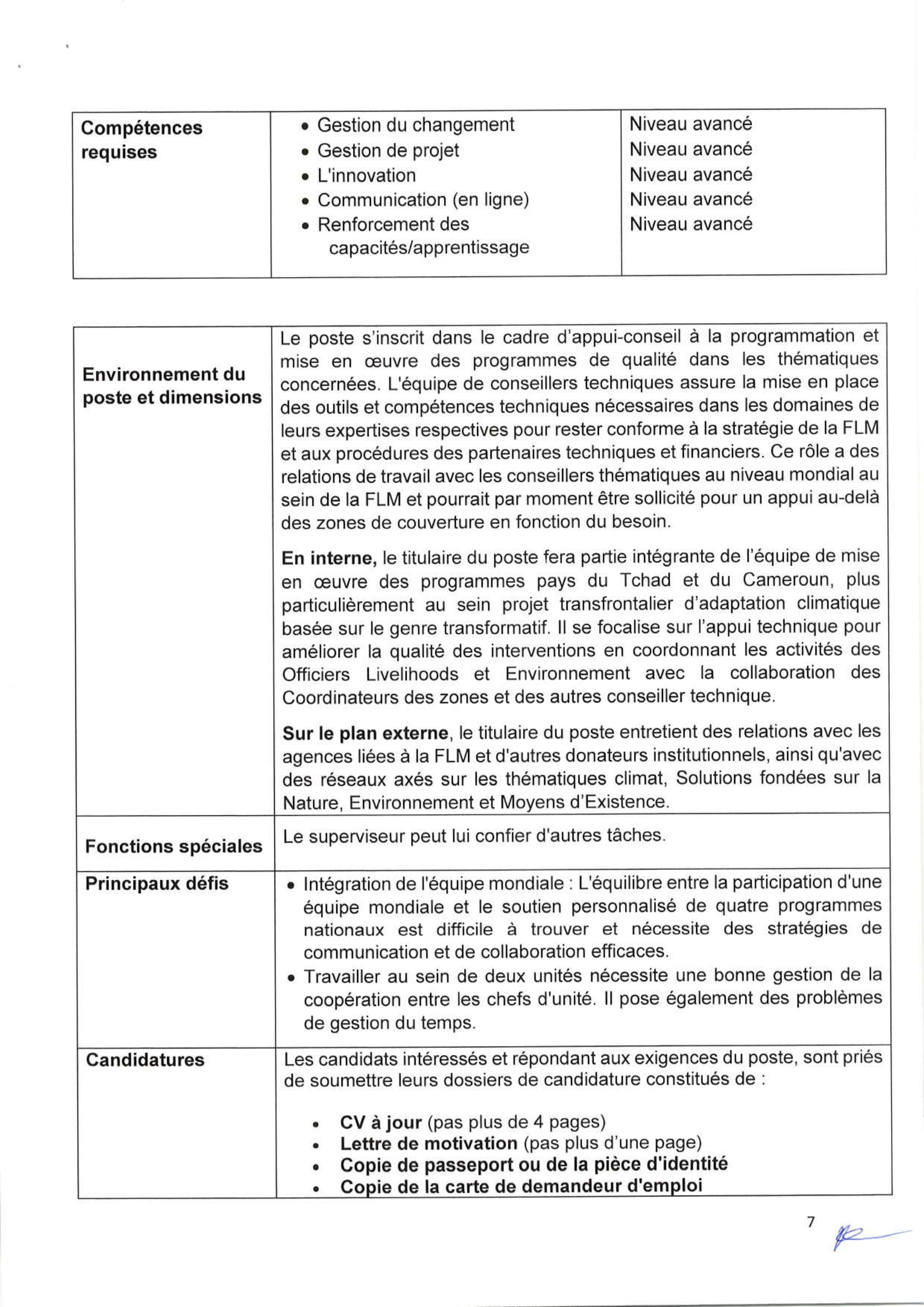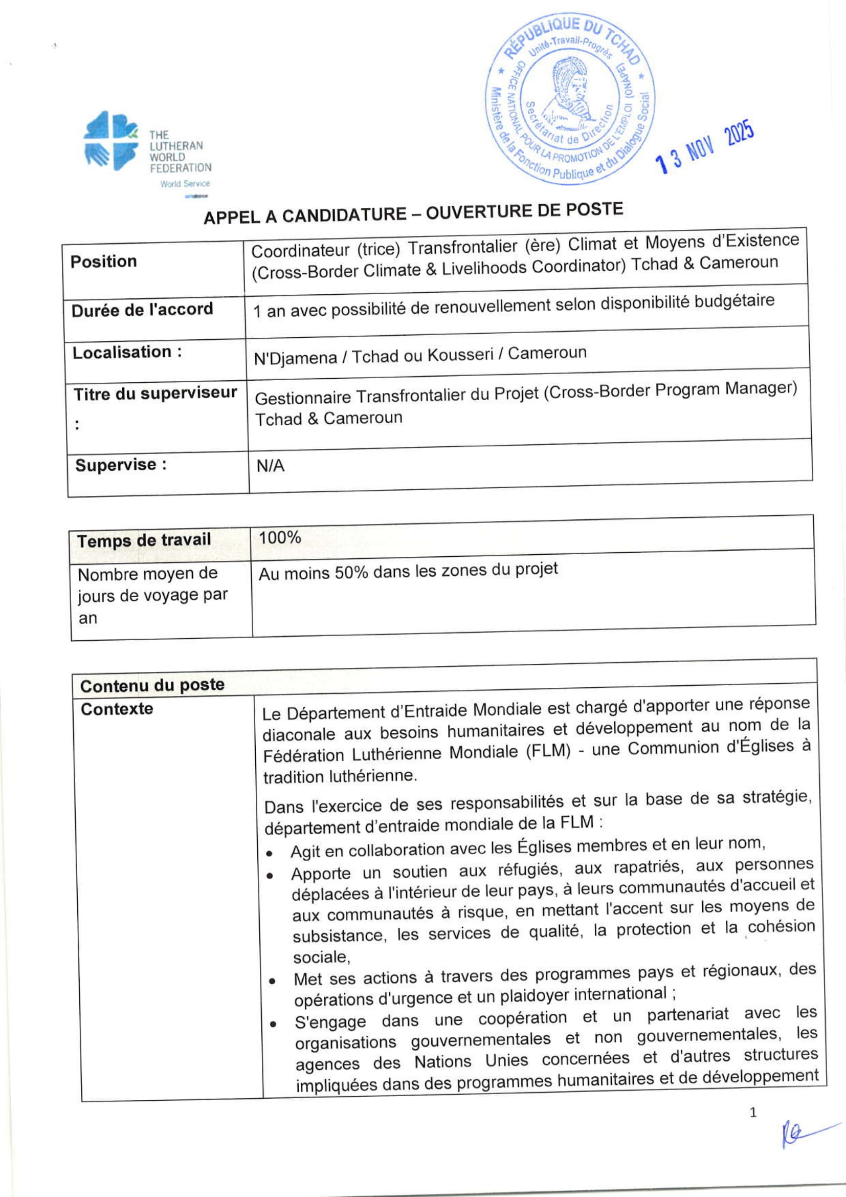FLM recrute un(e) Coordinateur(trice) transfrontalier(ère) climat et moyens d’existence (cross-border climate & livelihoods coordinator) Tchad, Cameroun Nov 13, 2025 FLM recrute un(e) Coordinateur(trice) transfrontalier(ère) climat et moyens d’existence (cross-border climate & livelihoods coordinator) Tchad, Cameroun Share on FacebookTweetFollow usSaveLa Wildlife Conservation Society (WCS) lance un avis d’appel d’offres pour le recrutement d’un Consultant pour la réalisation d’une étude sur la taxation des éleveurs transhumants dans la zone de mise en œuvre du PAIRIAC, TchadAfrican Parks recrute pour le poste de responsable du développement communautaire, Parc National de Siniaka Minia, TchadCare recrute un stagiaire assistant projet feministes en action (H/F), Paris, FranceLe Conseil norvégien pour les réfugiés (NRC) recrute les Stagiaires au siège social, Norvège