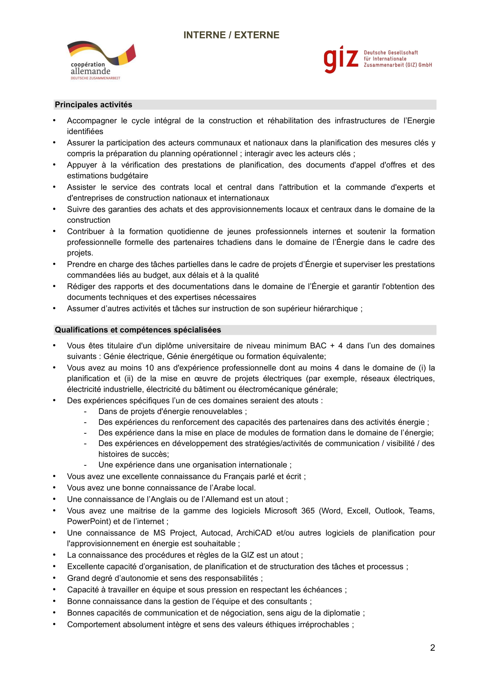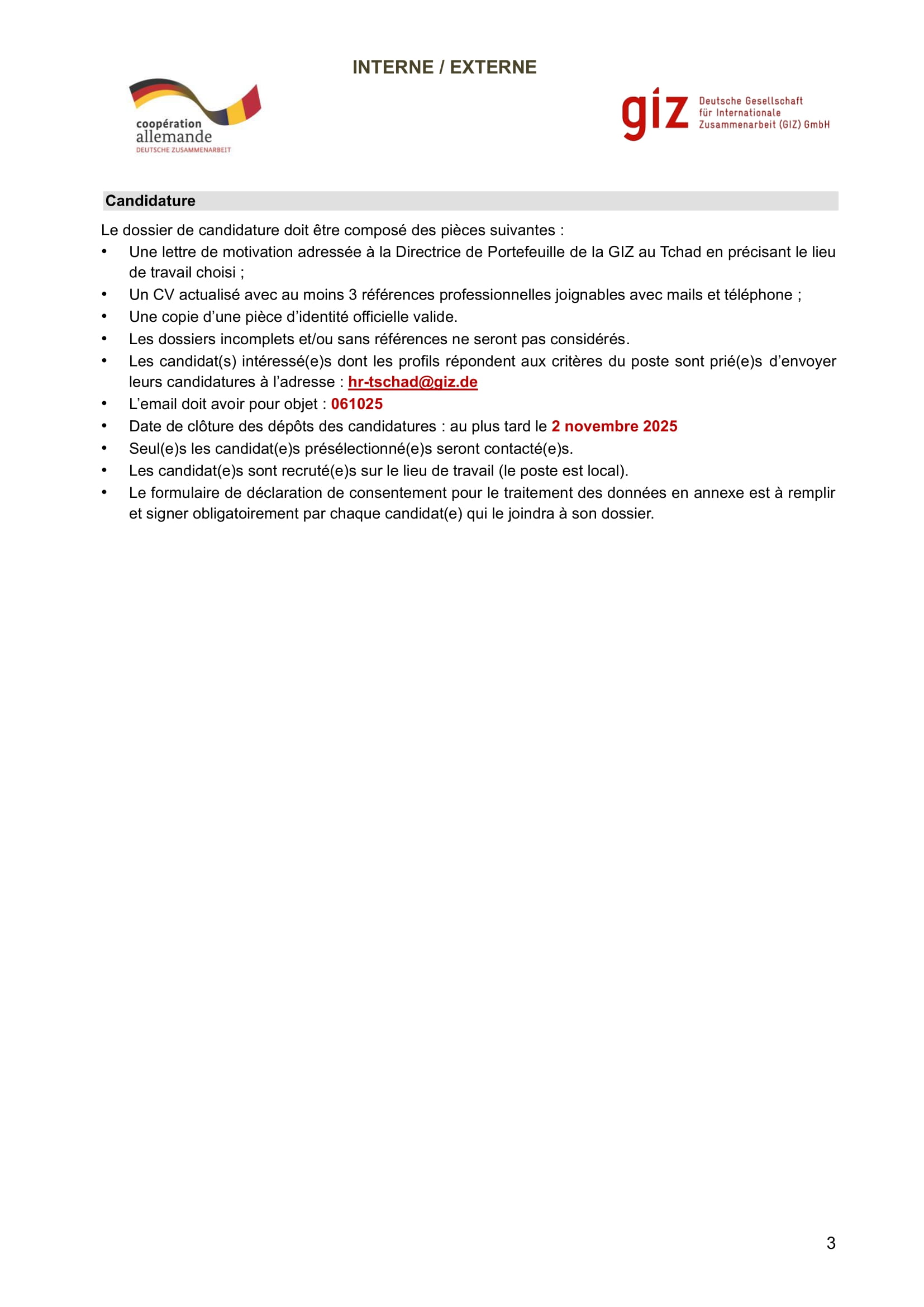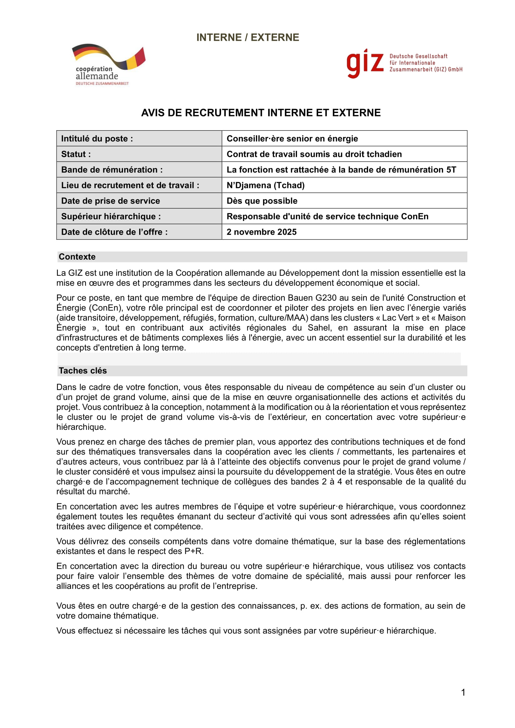 GIZ lance le recrutement interne/externe pour le poste de conseiller sénior en énergie, N’Djamena, Tchad Oct 25, 2025 GIZ lance le recrutement interne/externe pour le poste de conseiller sénior en énergie, N’Djamena, Tchad Share on FacebookTweetFollow usSaveMSF recrute un superviseur sage-femme, Aboutengue, TchadLa CARITAS SUISSE lance un avis d’appel d’offre restreinte achat des matériels aratoires au profit de 750 producteurs maraichers, Grande Sido, Monts de Lam, Nya-Pendé, de Barh Sara et la Moula, TchadL’association NOE lance un avis d’appel d’offre pour le recrutement d’un infirmier diplômé d’état (H/F), Parc de Noé, TchadLa FAO (Organisation des Nations Unies pour l’Alimentation et l’Agriculture) lance un appel à manifestation d’intérêt pour le Programme de Stages pour l’Afrique (RAF), Afrique