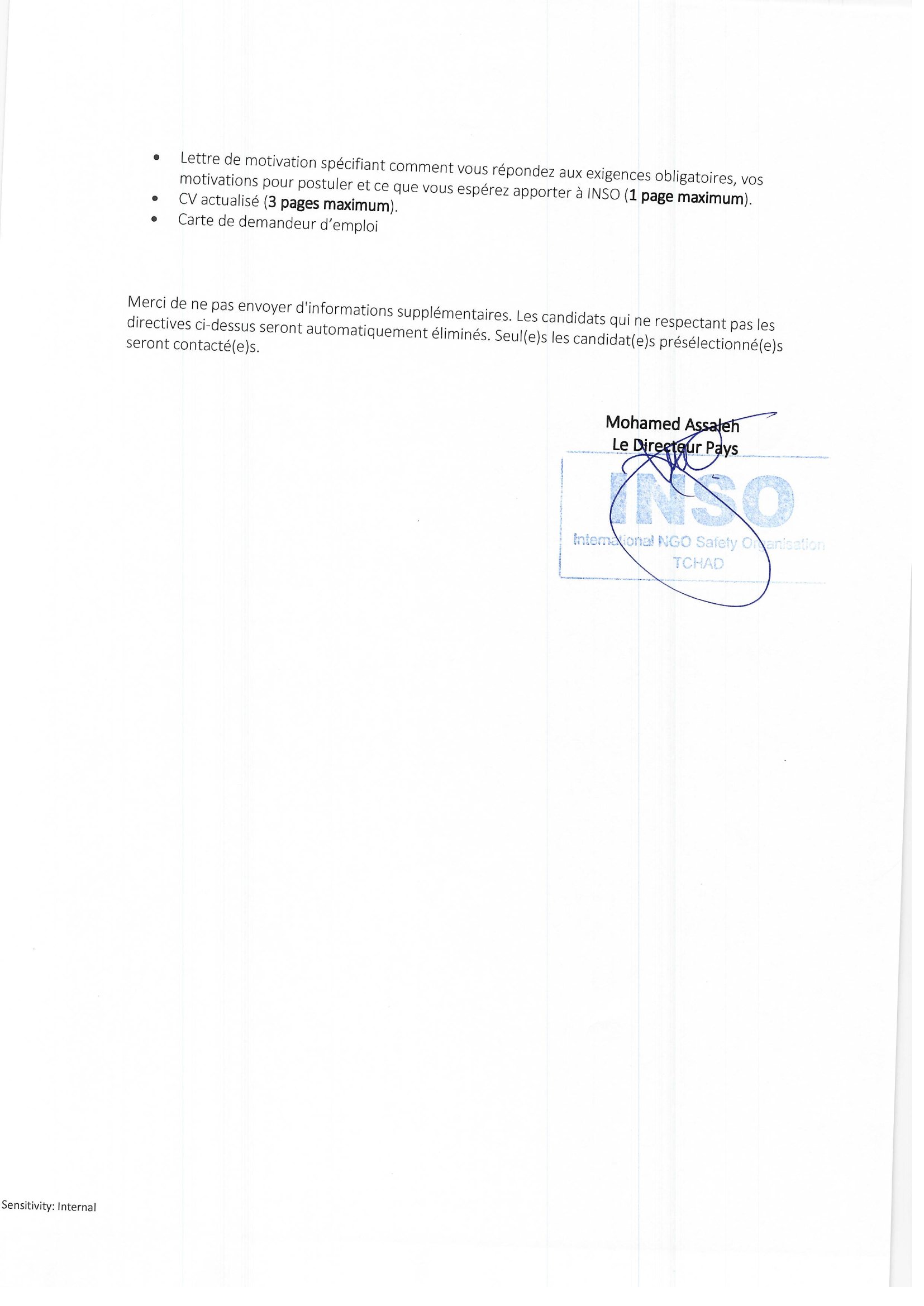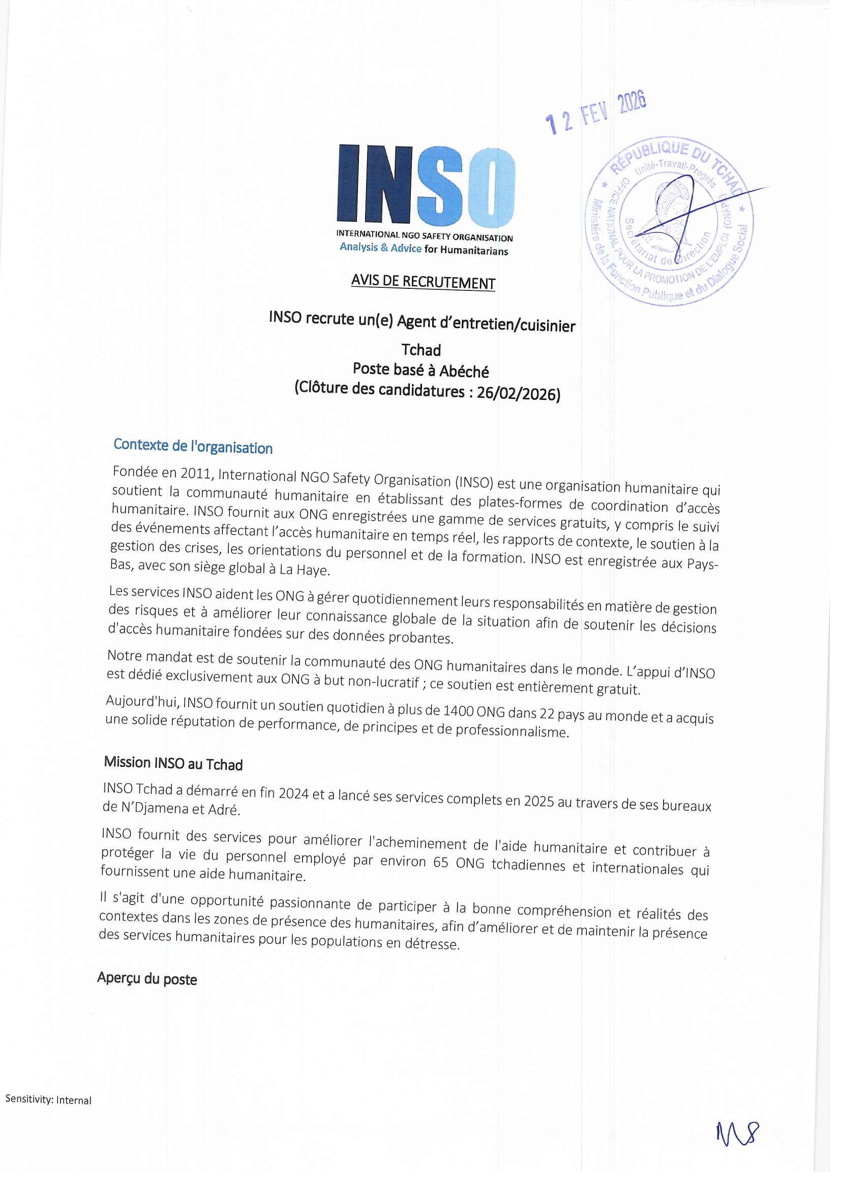 International Ngo Safety Organisation (INSO) recrute un Agent d’entretien/cuisinier (H/F), Abéché, Tchad Fév 13, 2026 International Ngo Safety Organisation (INSO) recrute un Agent d’entretien/cuisinier (H/F), Abéché, Tchad Share on FacebookTweetFollow usSaveLe Conseil danois pour les réfugiés (DRC) recrute un Agent d’entretien – Cuisinier, N’Djamena, TchadFHI 360 recrute un(e) consuktant(e) formateur(trice) en maintenance des équipements radios, N’Djamena, TchadAppel à candidature pour la bourse d’études Michael Adamson NEBOSH Diploma Scholarship 2025, Royaume-UniOn-Purpose recrute un stagiaire Gestion de programme – Développement des partenariats, mesure d’impact et formation, Paris, France