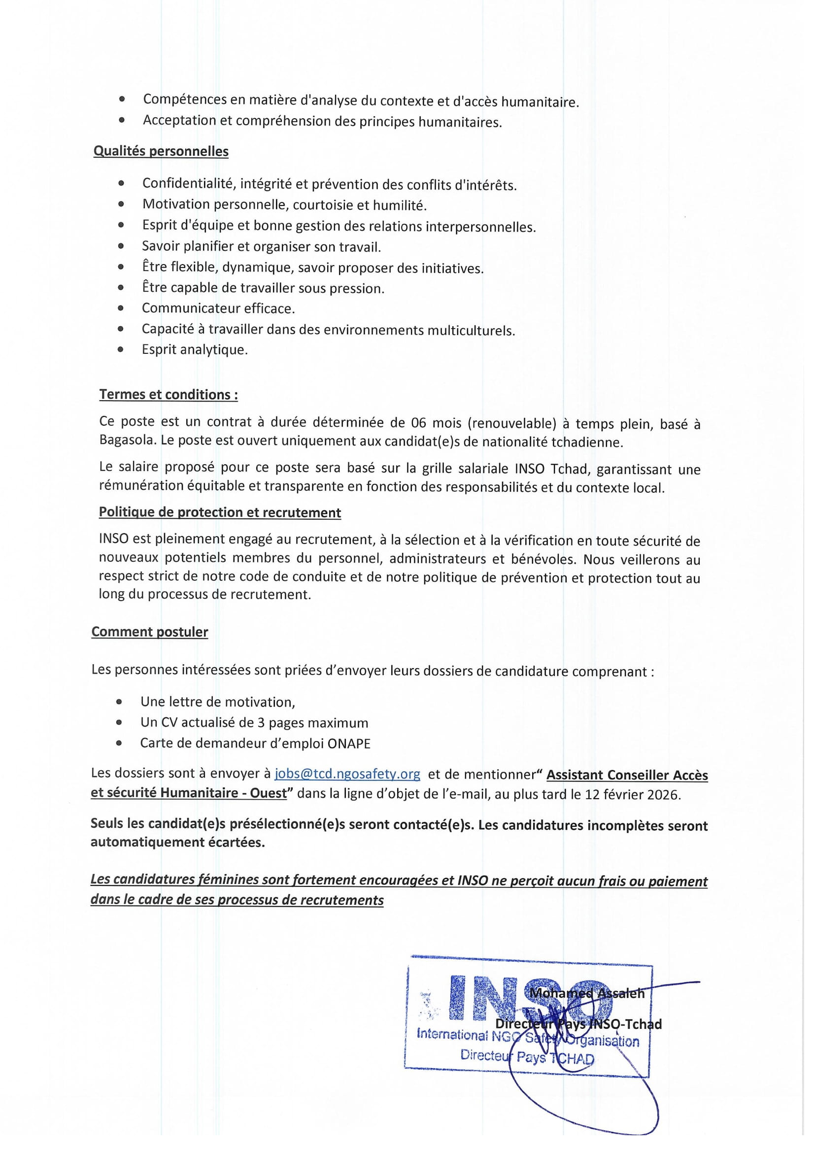 International Ngo Safety Organisation (INSO) recrute un Assistant Conseiller Acces et Sécurité Humanitaire (H/F), Ouest (Lac), Tchad Jan 31, 2026 International Ngo Safety Organisation (INSO) recrute un Assistant Conseiller Acces et Sécurité Humanitaire (H/F), Ouest (Lac), Tchad Share on FacebookTweetFollow usSaveCOOPI recrute un(e) Administrateur(trice) financier, Sila, TchadConcern Worldwide lance un avis d’appel d’offre pour les travaux de construction infrastructures environnementales volet 1, Tchad Appel à candidature pour les bourses à l’université de Drake aux USA en 2024Republication d’appel d’offre pour la clôture des sites maraichers, projet NexSud, Tchad