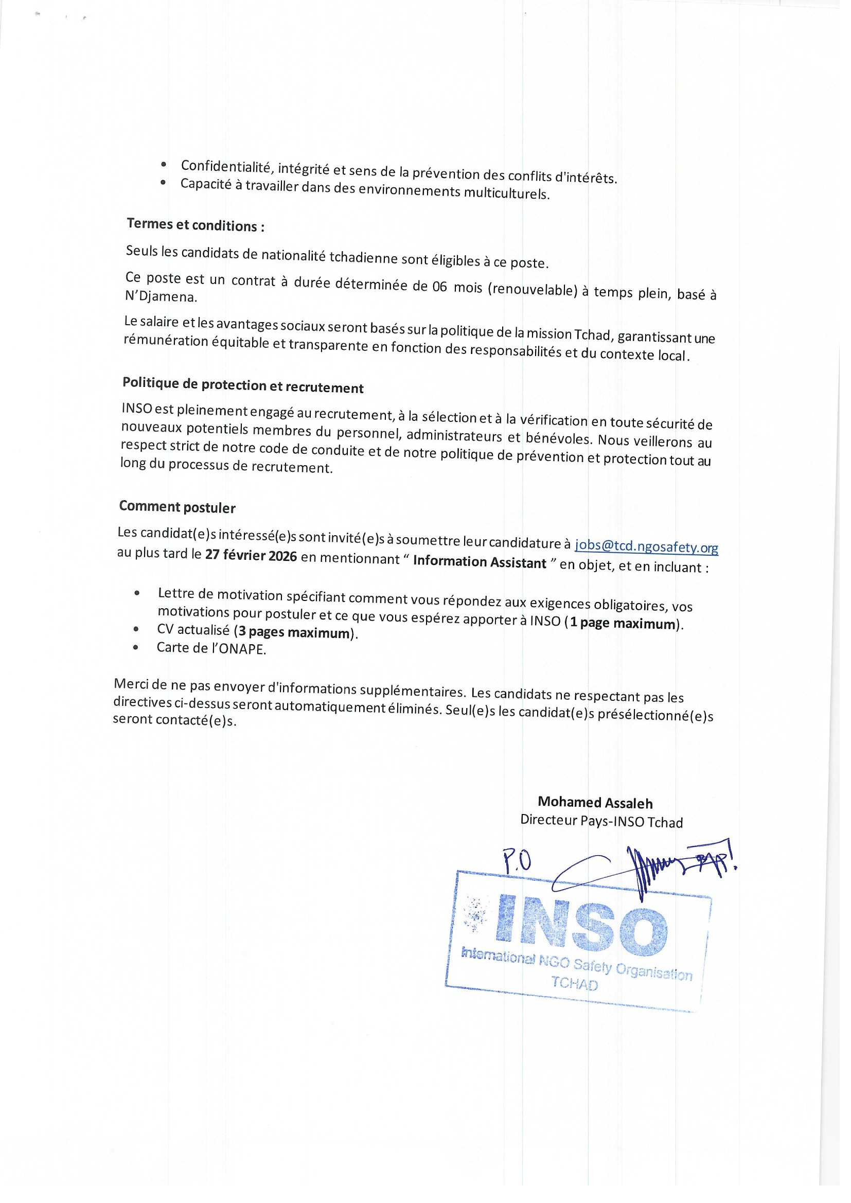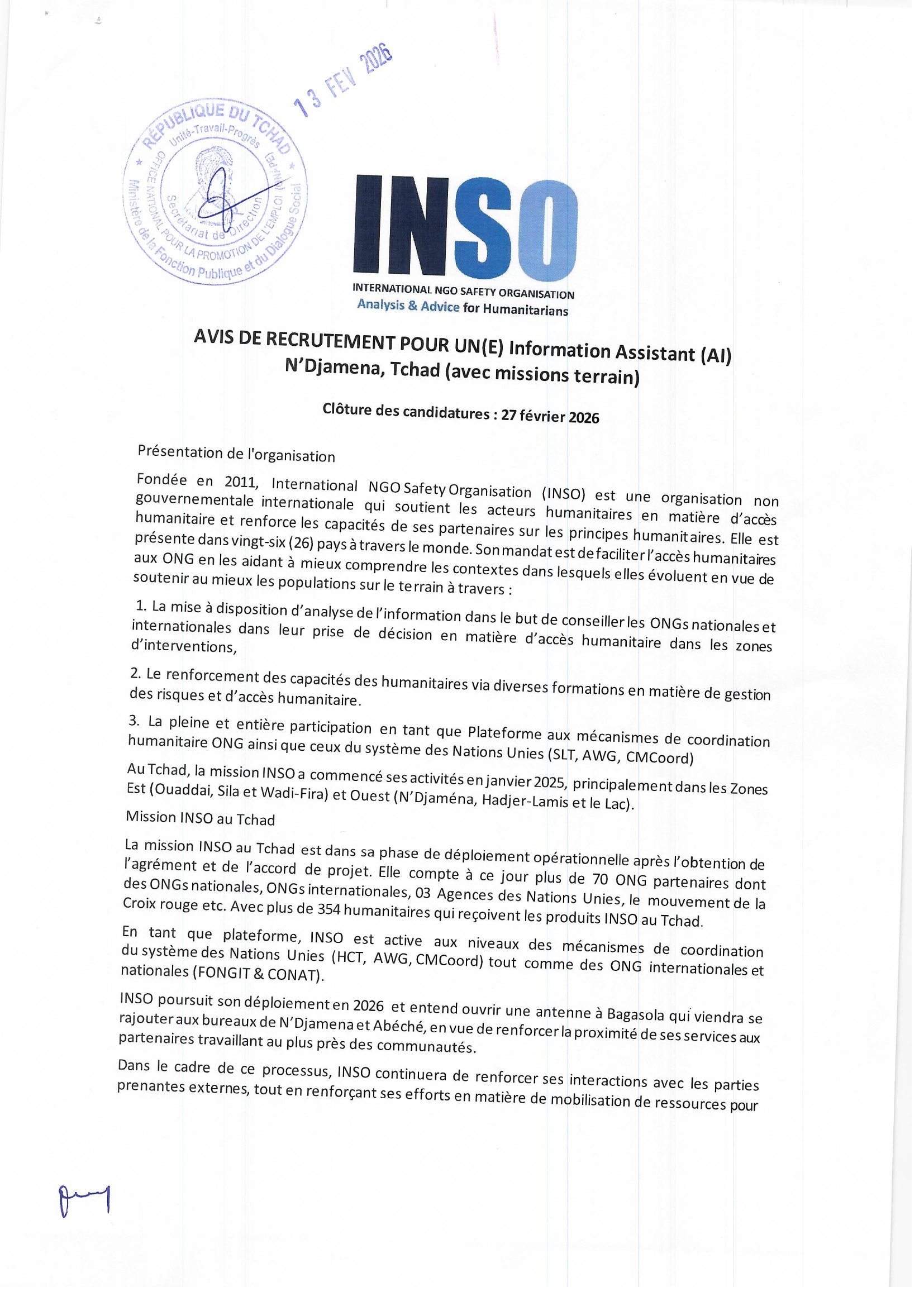 International Ngo Safety Organisation (INSO) recrute un Assistant Information (H/F), N’Djamena, Tchad Fév 13, 2026 International Ngo Safety Organisation (INSO) recrute un Assistant Information (H/F), N’Djamena, Tchad Share on FacebookTweetFollow usSaveAppel à candidatures pour les bourses Eramsus Mundus Europe Global MINDS, EuropeAppel à candidatures pour les bourses de doctorat de l’Université de Galway, IrlandeLe Comité International de la Croix-Rouge recrute un chargé de la santé du personnel (H/F), N’Djamena, TchadLa société 2N CORPORATE SARL recrute un stagiaire administrateur système réseau, Douala, Cameroun