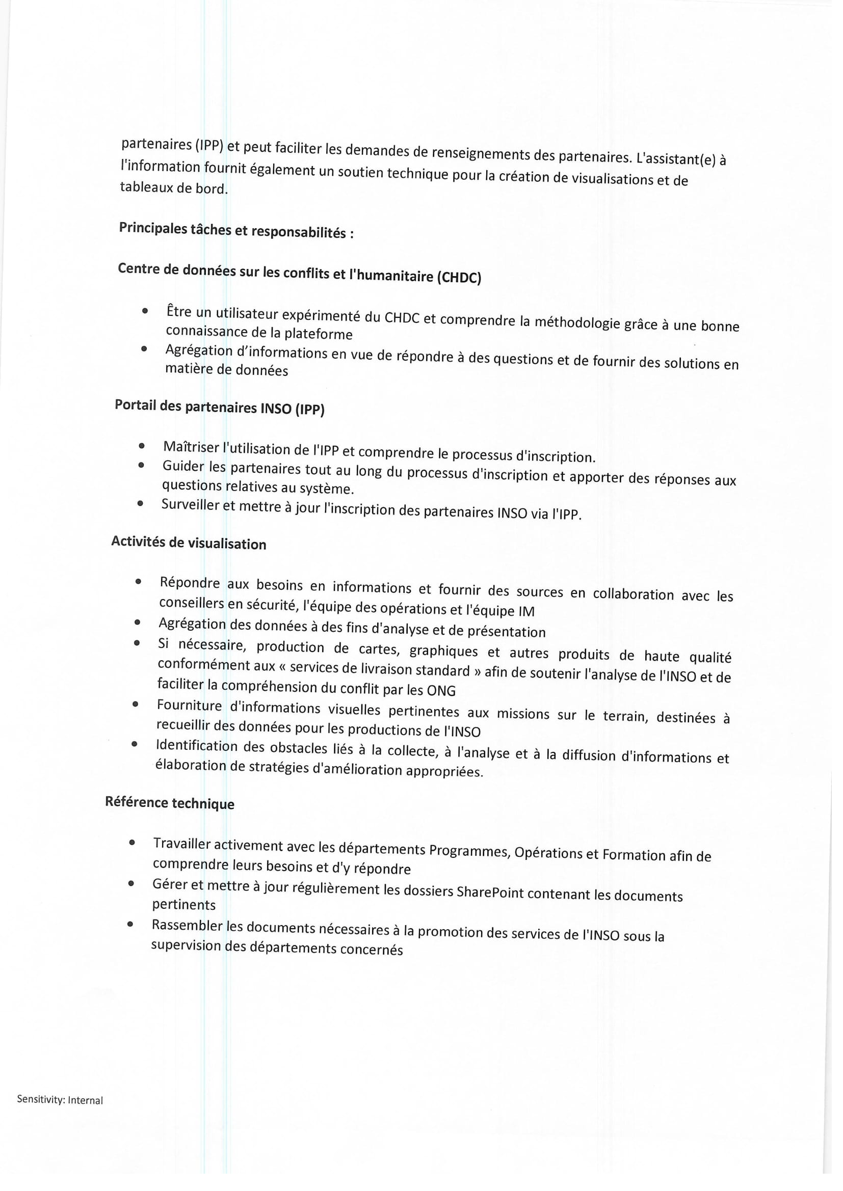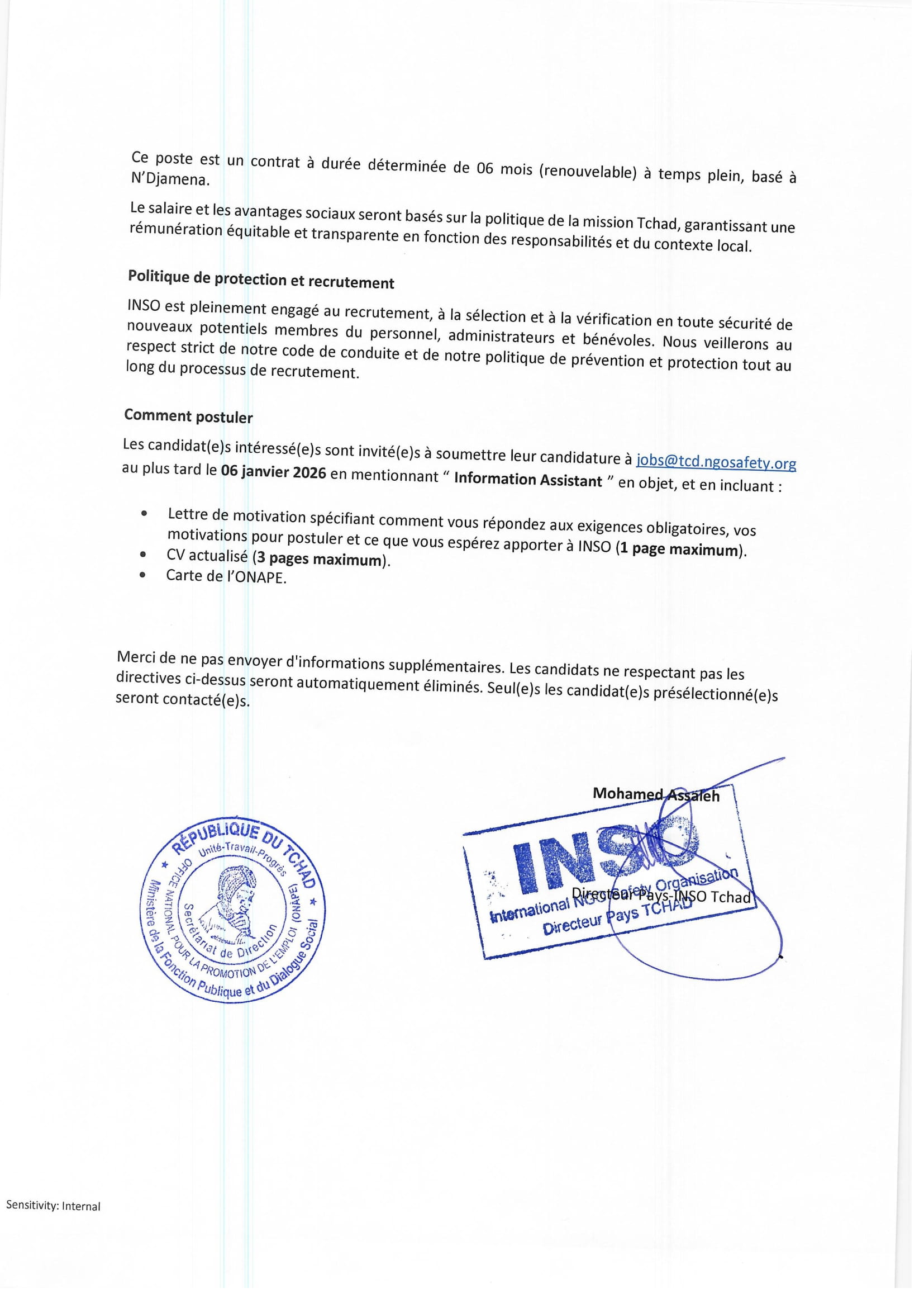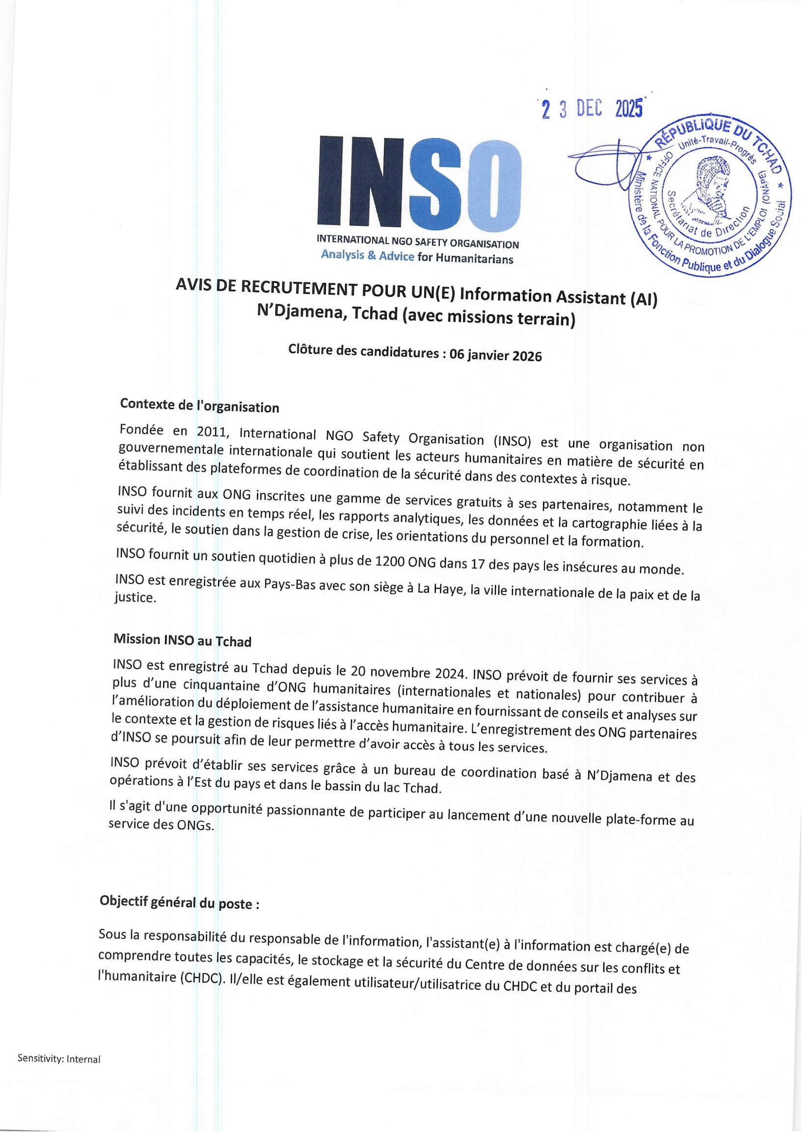 International Ngo Safety Organisation (INSO) recrute un assistant information (H/F), N’Djamena, Tchad Déc 24, 2025 International Ngo Safety Organisation (INSO) recrute un assistant information (H/F), N’Djamena, Tchad Share on FacebookTweetFollow usSaveGIZ recrute un conseiller(e) en gouvernance locale, Moundou, TchadCICR recrute deux comptables (H/F) basé(e)s à Adré/Bagasola, TchadUNICEF recrute un(e) Chargé(e) de programme Nutrition, Bol, TchadSolidaridad West Africa lance un avis de recrutement externe de Gestionnaire de centre de service rural Moundou ou Kelo, Tchad