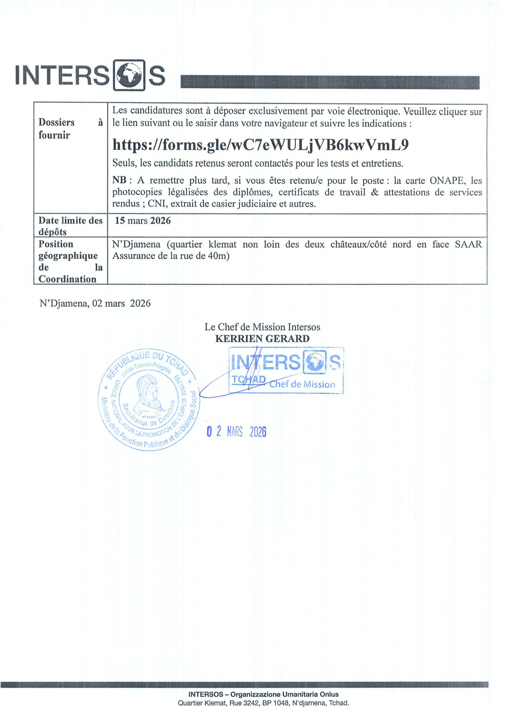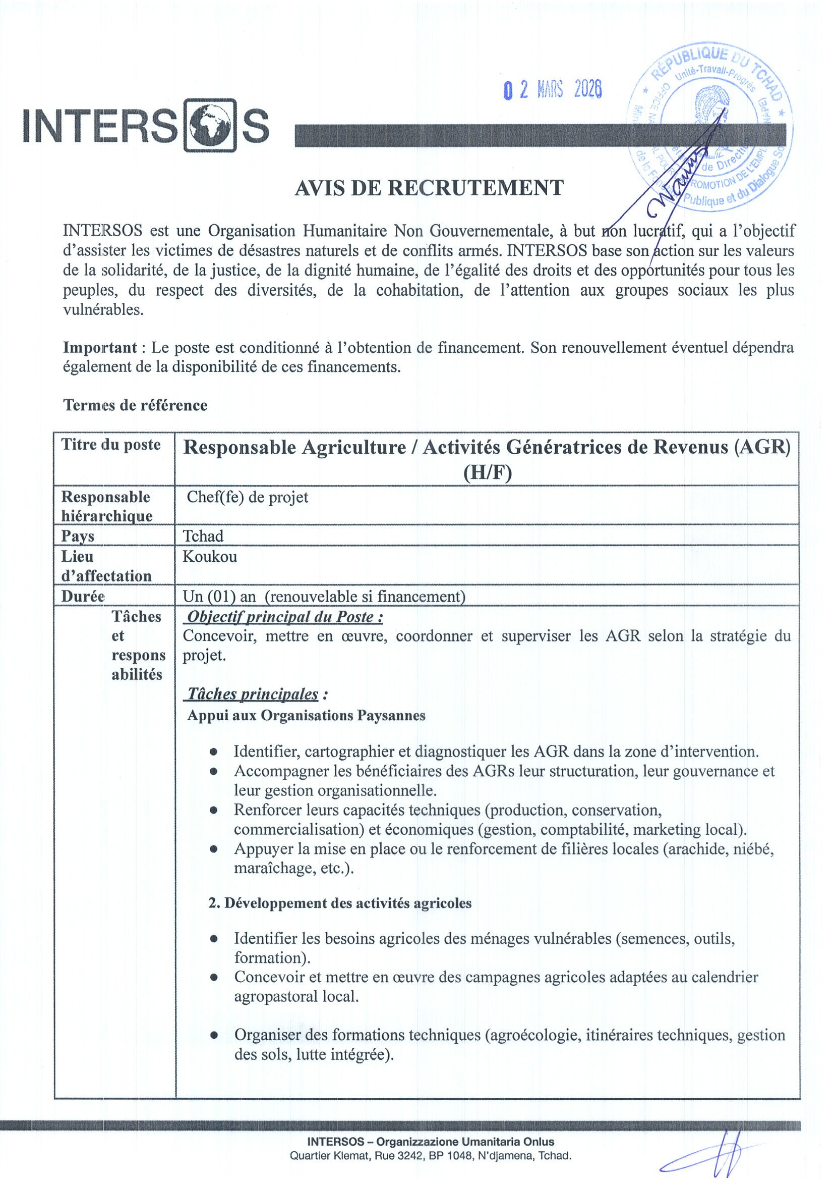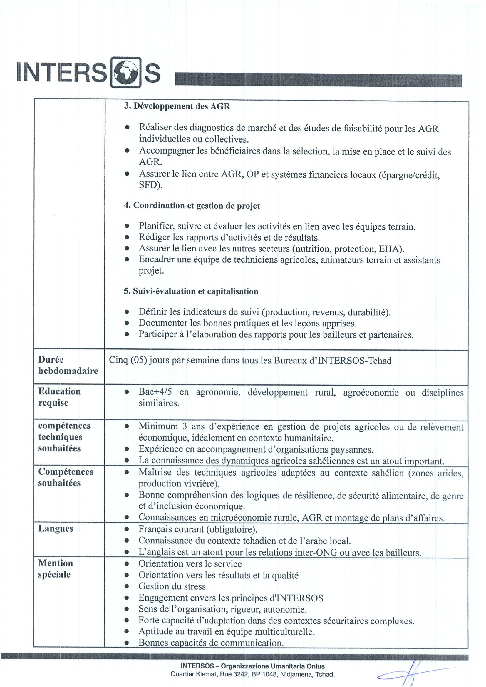 INTERSOS recrute un Responsable Agriculture/ Activités Génératrices de Revenus (AGR) (H/F), Koukou, Tchad
