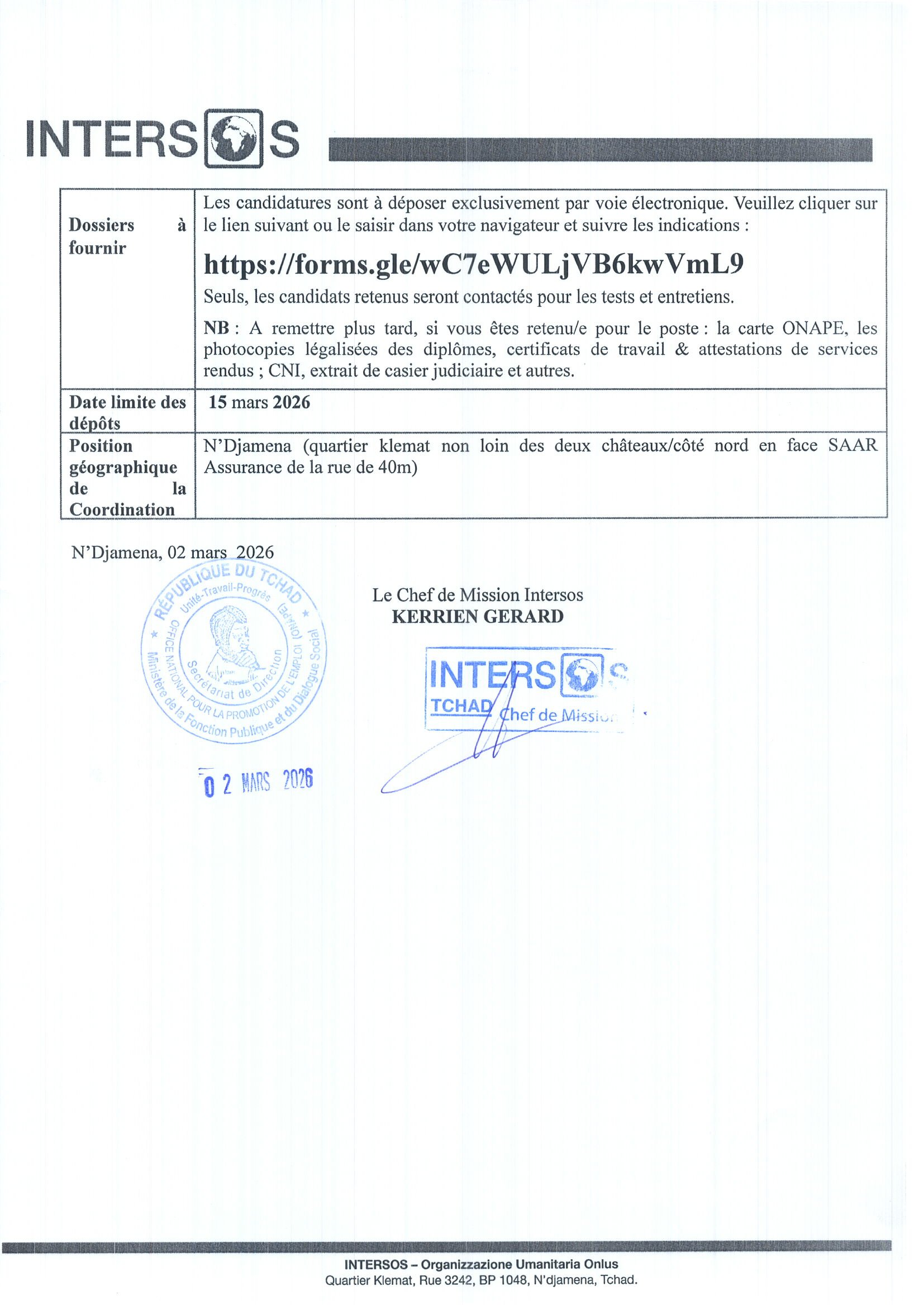 INTERSOS recrute un Superviseur des Activités Génératrices de Revenus (AGR) (H/F), Koukou, Tchad
