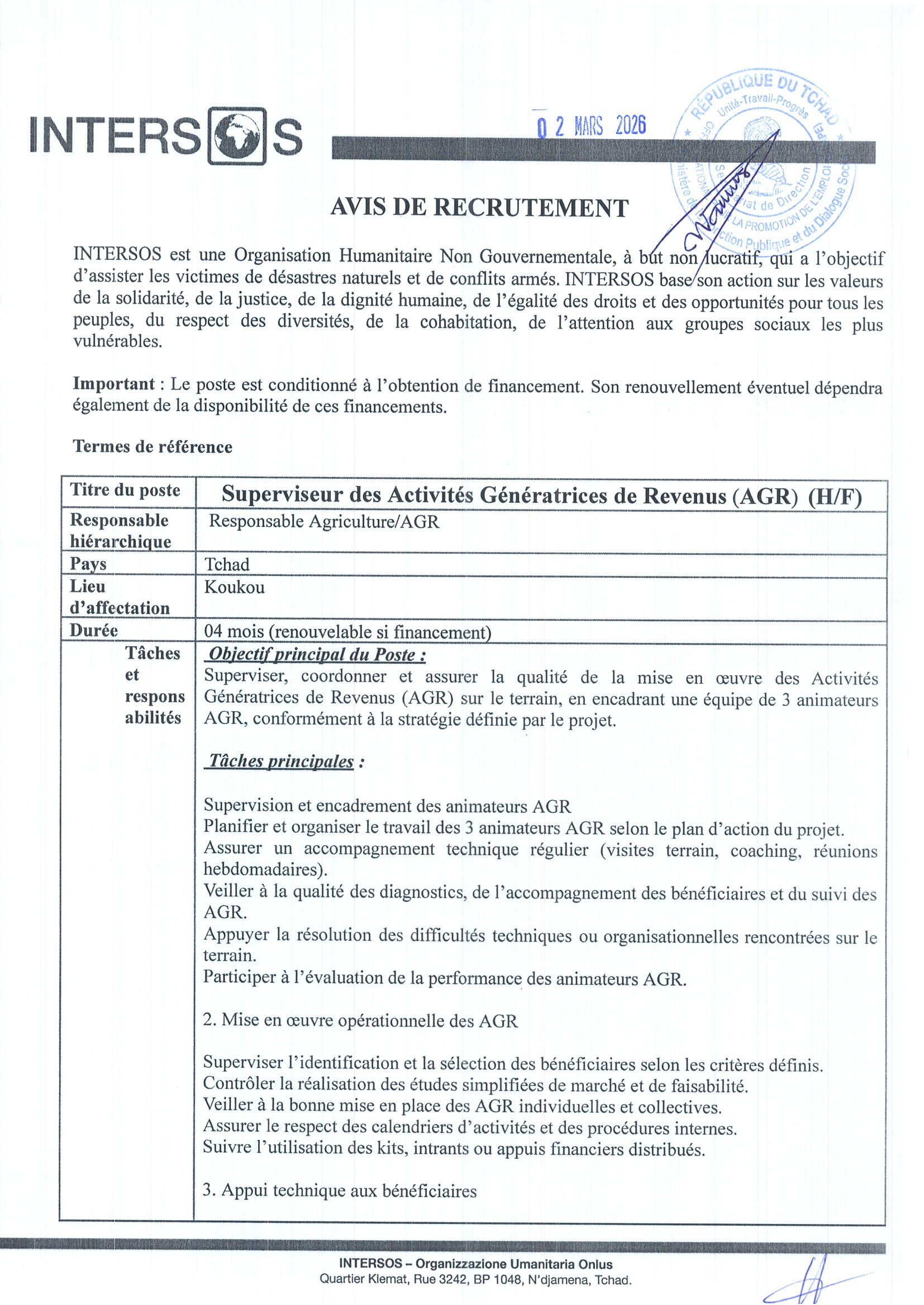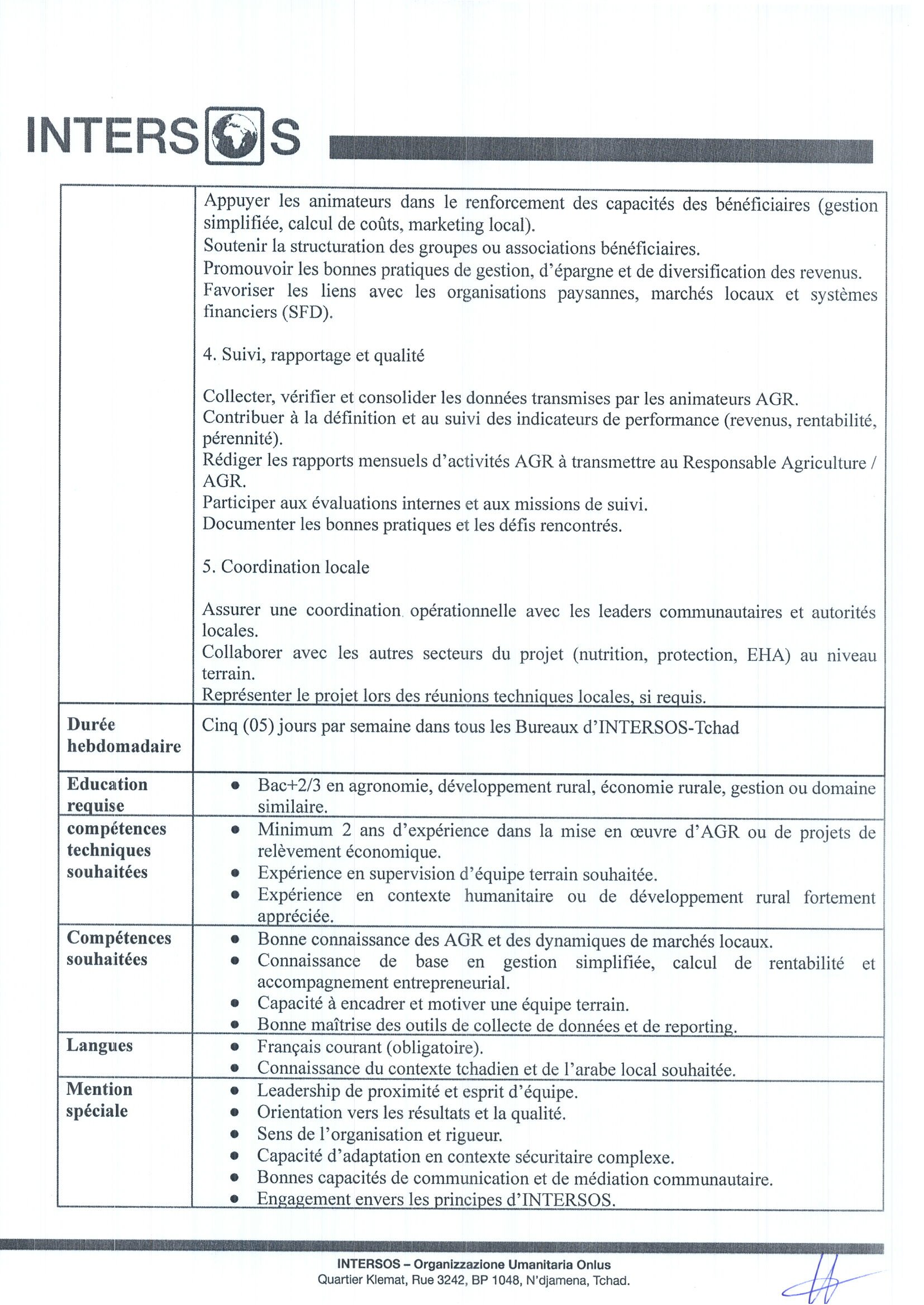 INTERSOS recrute un Superviseur des Activités Génératrices de Revenus (AGR) (H/F), Koukou, Tchad