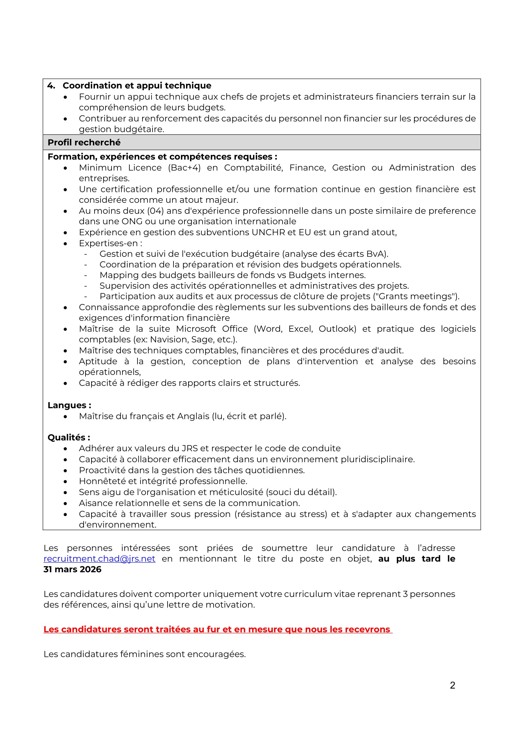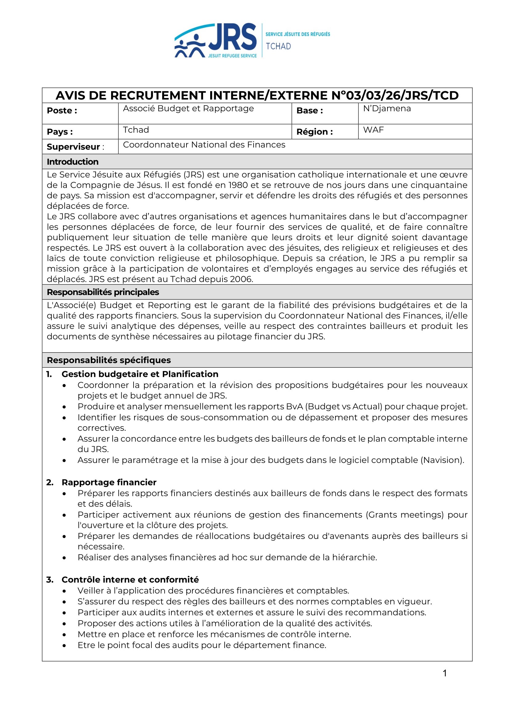 Jesuit Refugee Service (JRS) recrute un Associé Budget et Rapportage, N’Djamena, Tchad