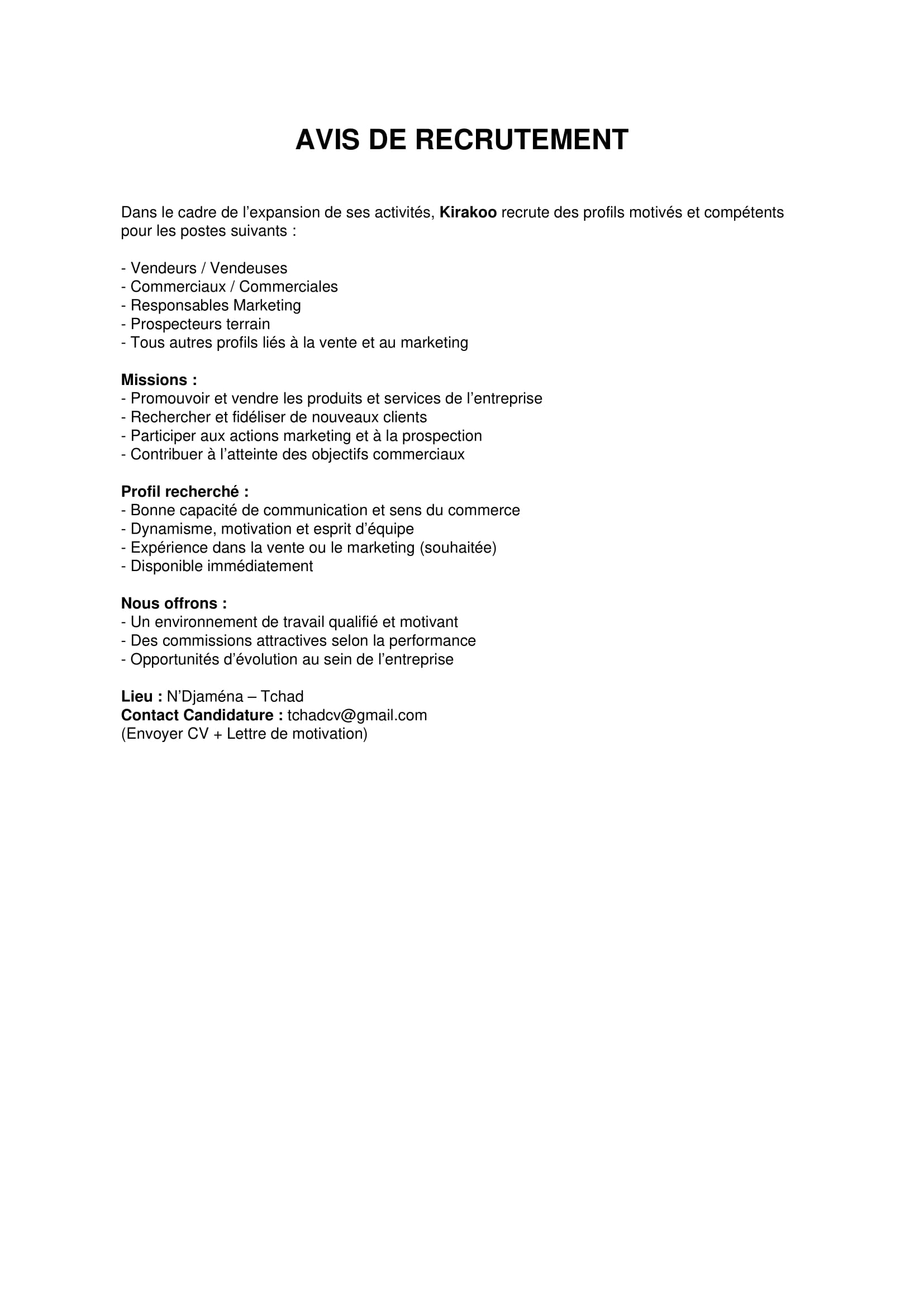 Kirakoo recrute : vendeurs, commerciaux, responsable marketing, prospecteurs de terrain, N’Djamena, Tchad Déc 8, 2025 Kirakoo recrute : vendeurs, commerciaux, responsable marketing, prospecteurs de terrain, N’Djamena, Tchad Share on FacebookTweetFollow usSave L’ONG Reporters sans frontières recrute un stagiaire en relations presse/communication (H/F),Paris, FranceUNICEF-TCHAD lance un avis d’appel d’offresLe Programme des Nations Unies pour les établissements humains (ONU-HABITAT) recherche un(e) Stagiaire en médias, Nairobi, KenyaLe Conseil danois pour les réfugiés recrute un spécialiste MHPSS, Adré, Tchad