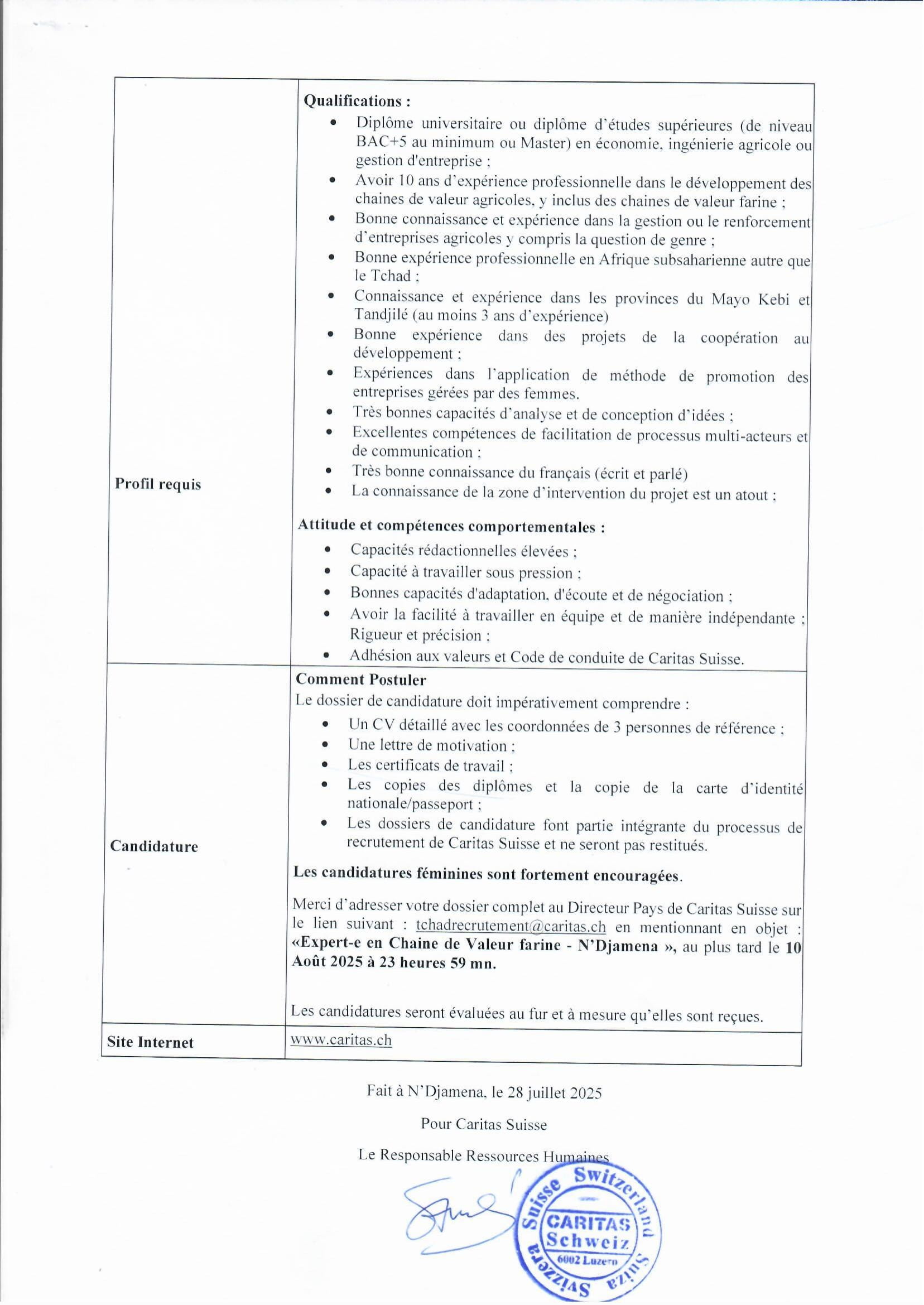 La Caritas Suisse recherche deux (02) expert(e)s en chaine de valeur farine 100%, N’Djamena, Tchad Juil 29, 2025 La Caritas Suisse recherche deux (02) expert(e)s en chaine de valeur farine 100%, N’Djamena, Tchad Share on FacebookTweetFollow usSaveL’ONG Développement Humain Durable (DHD) recrute un expert senior, spécialiste en gouvernance organisationnelle, N’Djamena, TchadAppel à candidatures pour le Programme d’échange d’été 2025 du Hansen Leadership Institute USABRISCOM recrute une assistante de direction et de gestion, Ouagadougou, Burkina FassoAppel à candidature pour les bourses de l’université technique de Munich, Schmidt Science Fellows 2026 (entièrement financé), Allemagne