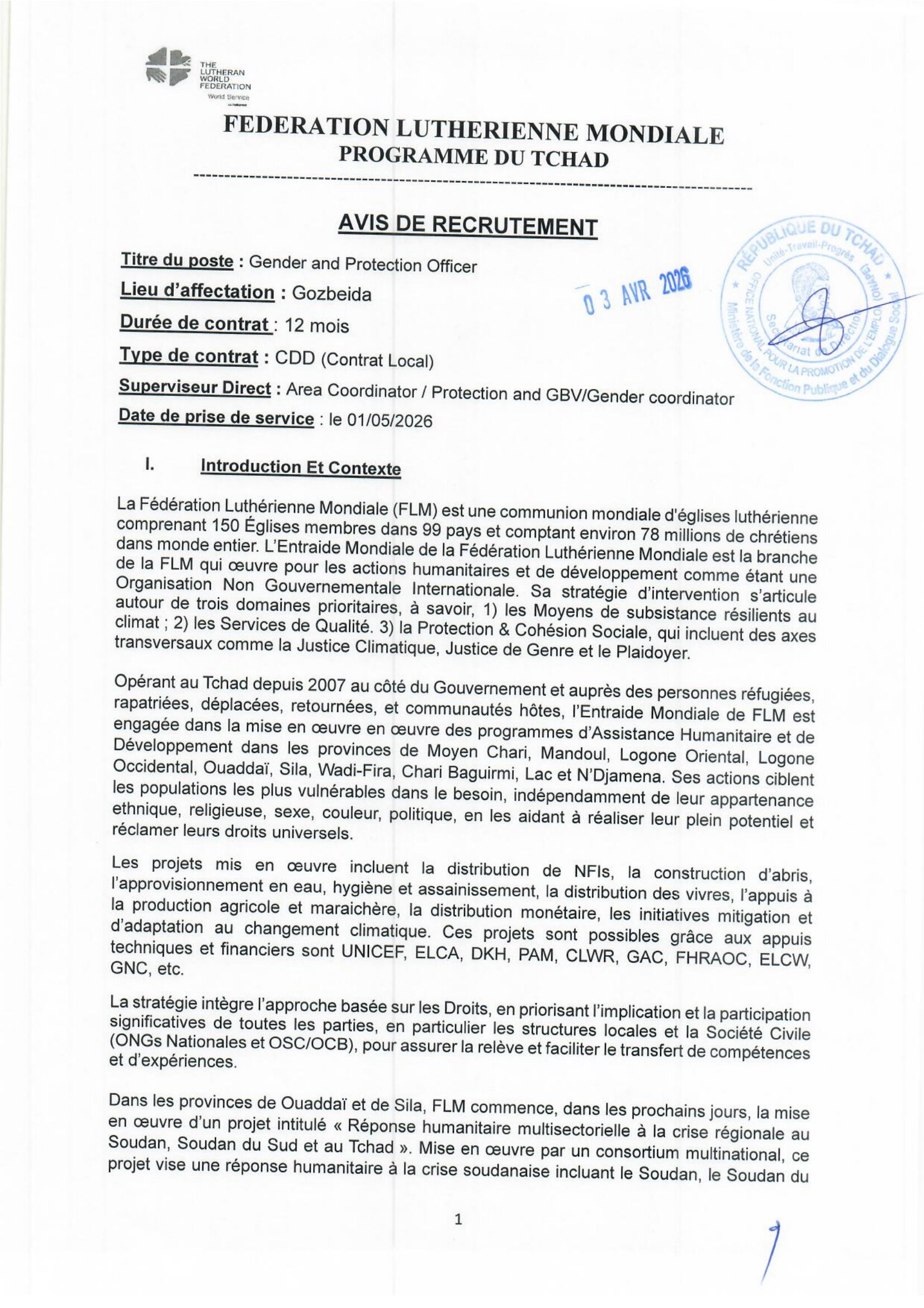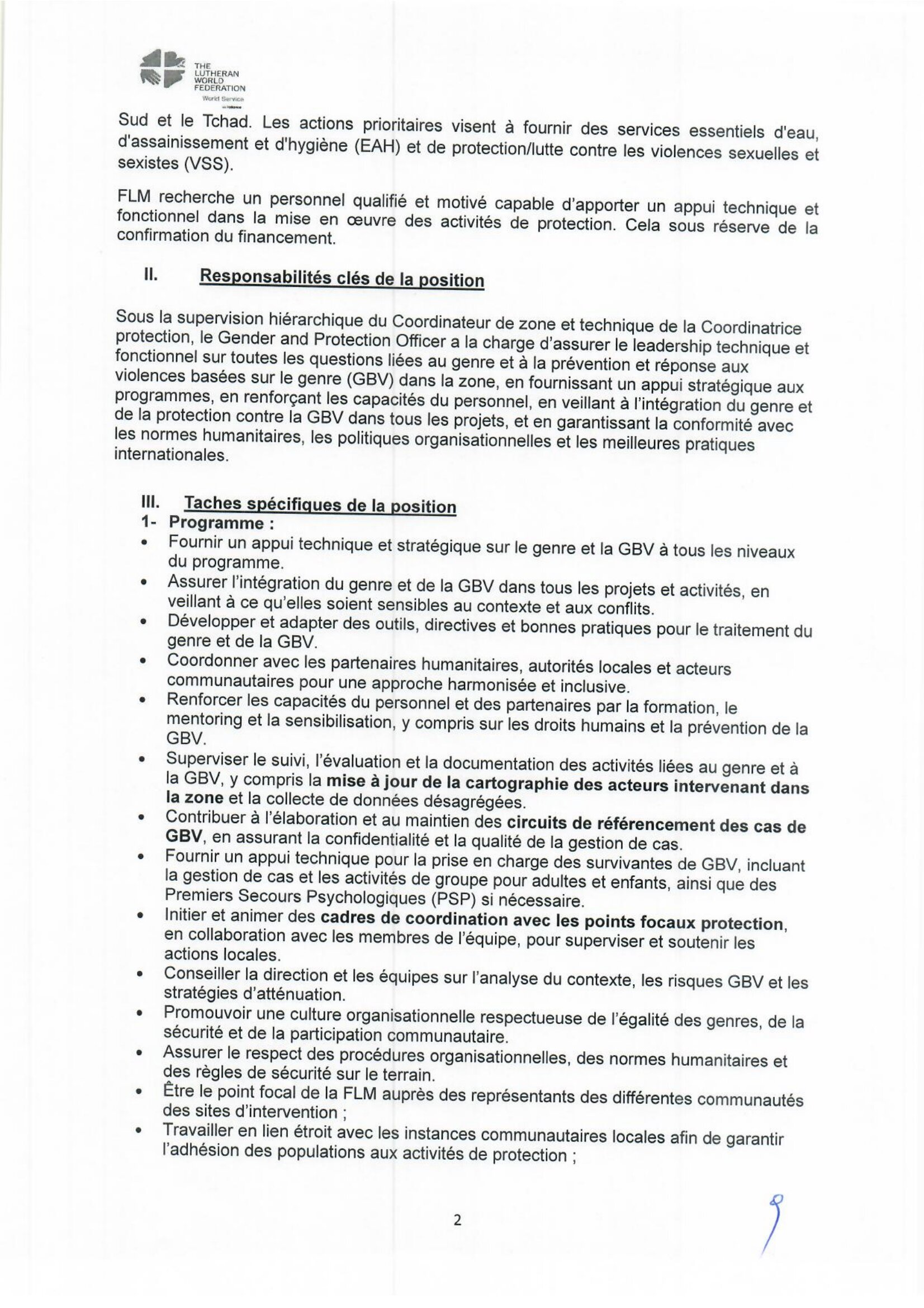 La Fédération Luthérienne Mondiale (FLM) recrute un Gender and Protection Officer, Gozbeida, Tchad Avr 3, 2026 La Fédération Luthérienne Mondiale (FLM) recrute un Gender and Protection Officer, Gozbeida, Tchad Share on FacebookTweetFollow usSaveLe Programme des Nations Unies pour l’environnement (PNUE) recherche un(e) stagiaire Assistant(e) Gouvernance Océanique, Nairobi, Kenya World Relief lance un avis de recrutement d’un responsable (H/F) Nutrition, Guéréda, Koursigué, TchadLe Bureau de l’OMS recrute un stagiaire pour le poste de gestion de projet, Congo-BrazzavilleLe cabinet CESERH organise une formation sur la planification des projets avec Ms Project, N’Djamena, Tchad