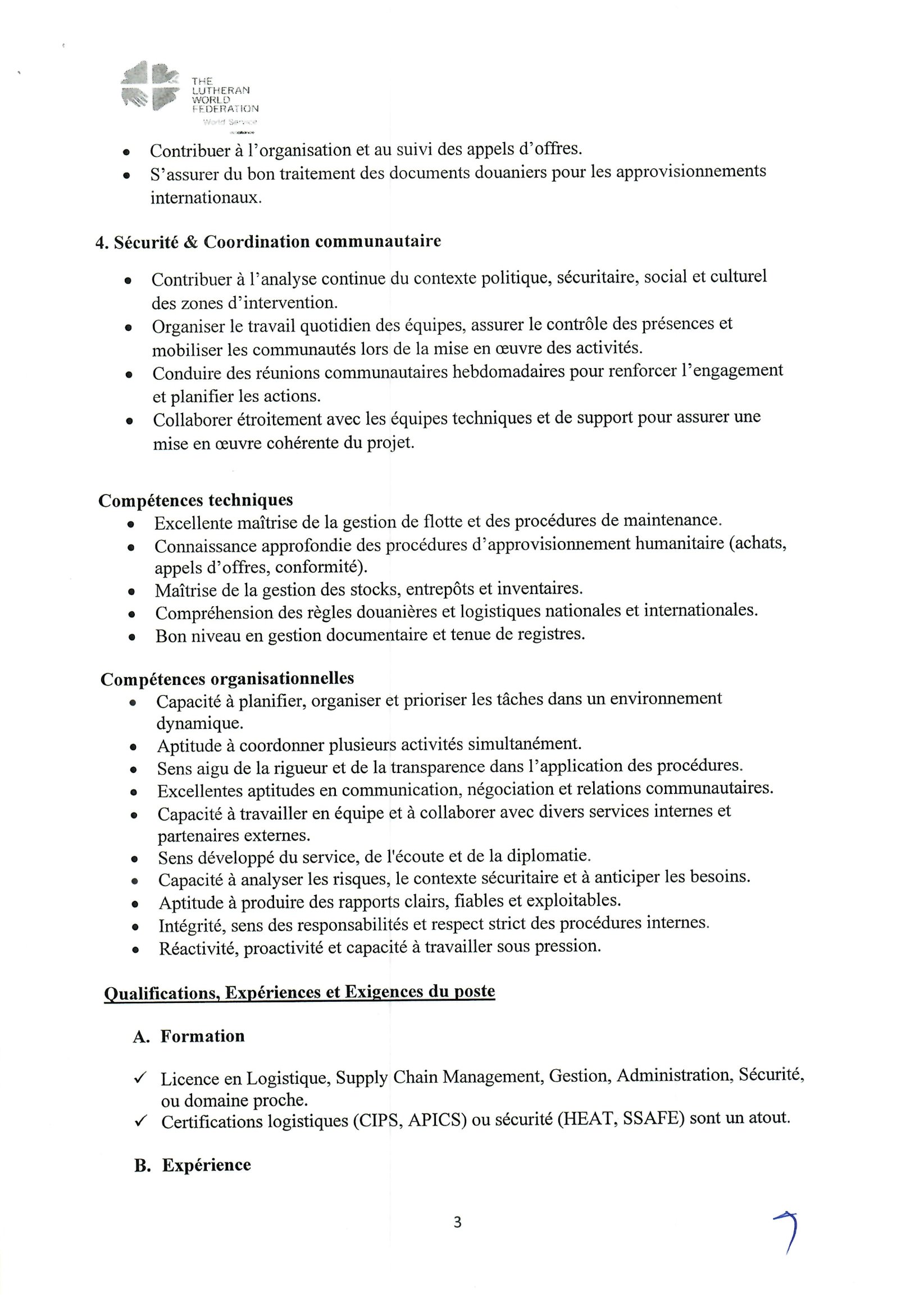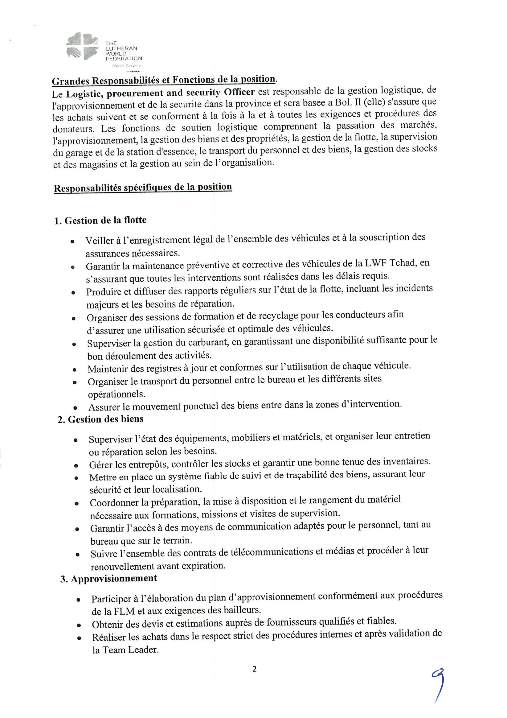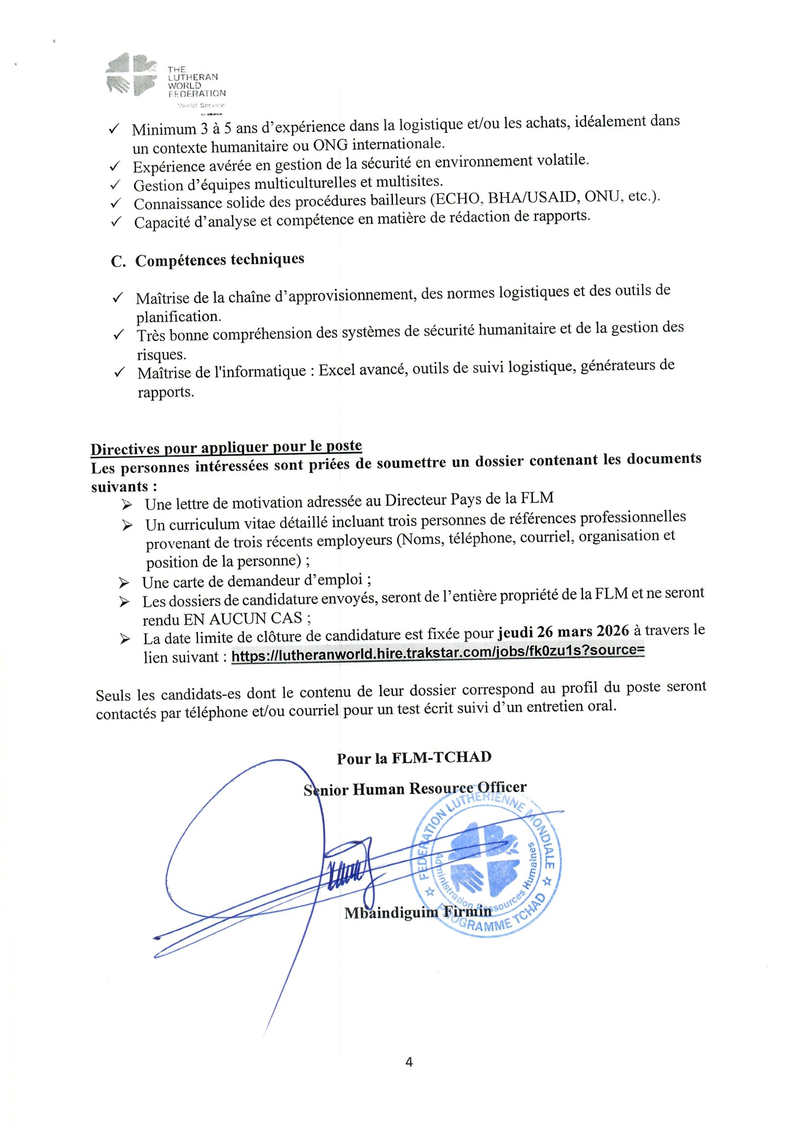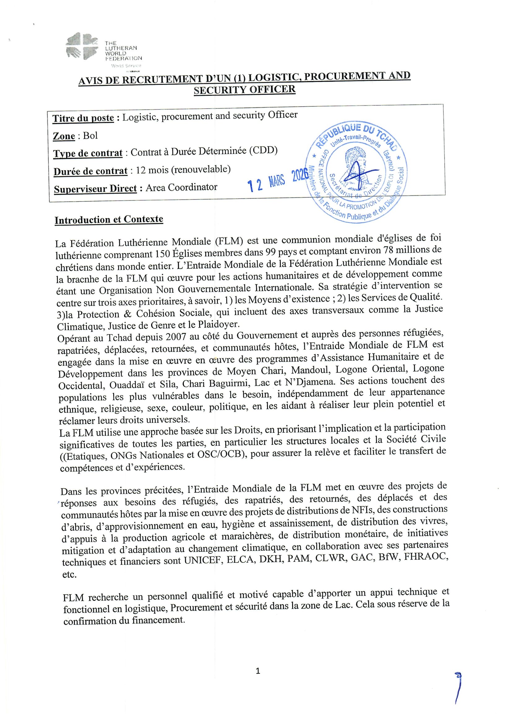 La Fédération Luthérienne Mondiale (FLM) recrute un Logistic, Procurement and Security Officer, Bol, Tchad Mar 12, 2026 La Fédération Luthérienne Mondiale (FLM) recrute un Logistic, Procurement and Security Officer, Bol, Tchad Postuler ici Share on FacebookTweetFollow usSaveGIZ recrute un expert en crise, conflits et catastrophes (H/F), N’Djamena, TchadMédecins Sans Frontières (MSF) recrute un stagiaire en communication digitale, Dakar, SénégalLe Centre de services régional des Nations Unies à Entebbe (RSCE) recrute un Stagiaire – Technologie de l’information, Entebbe, OugandaBourses d’études pour les leaders mondiaux émergents de l’American University.