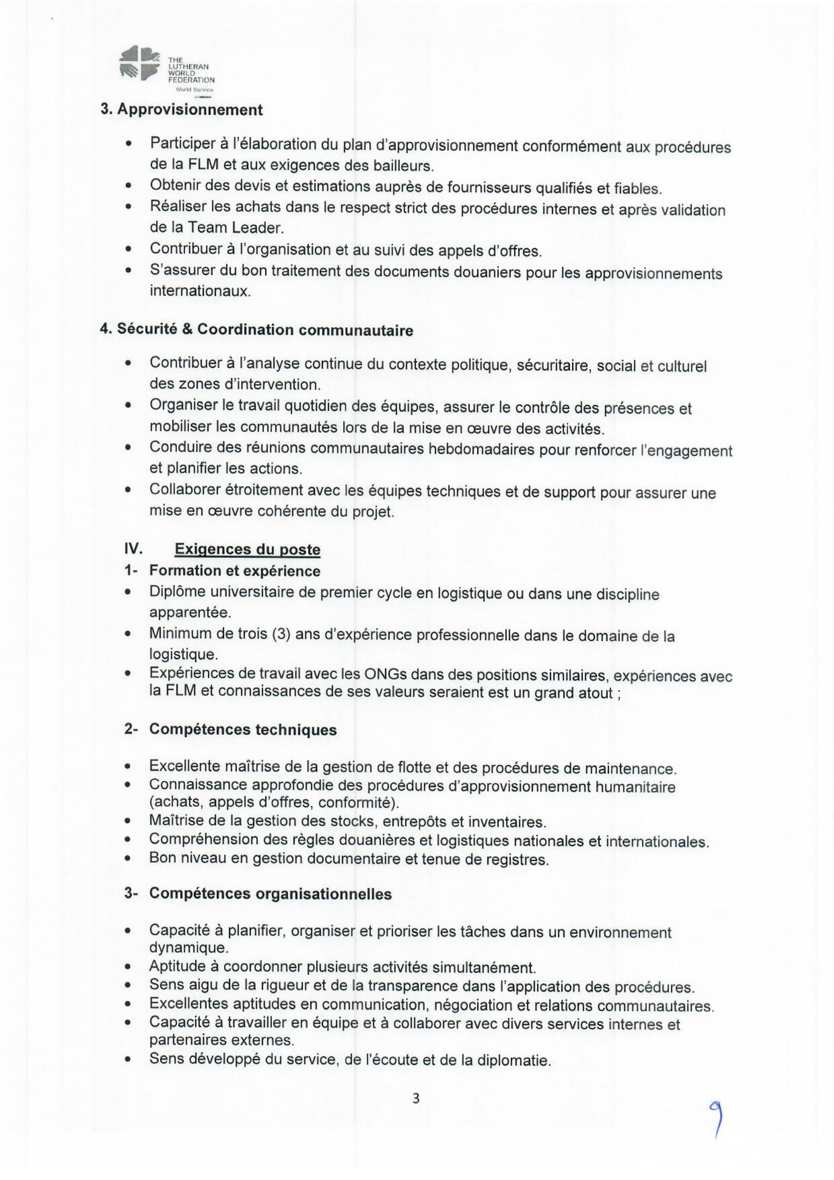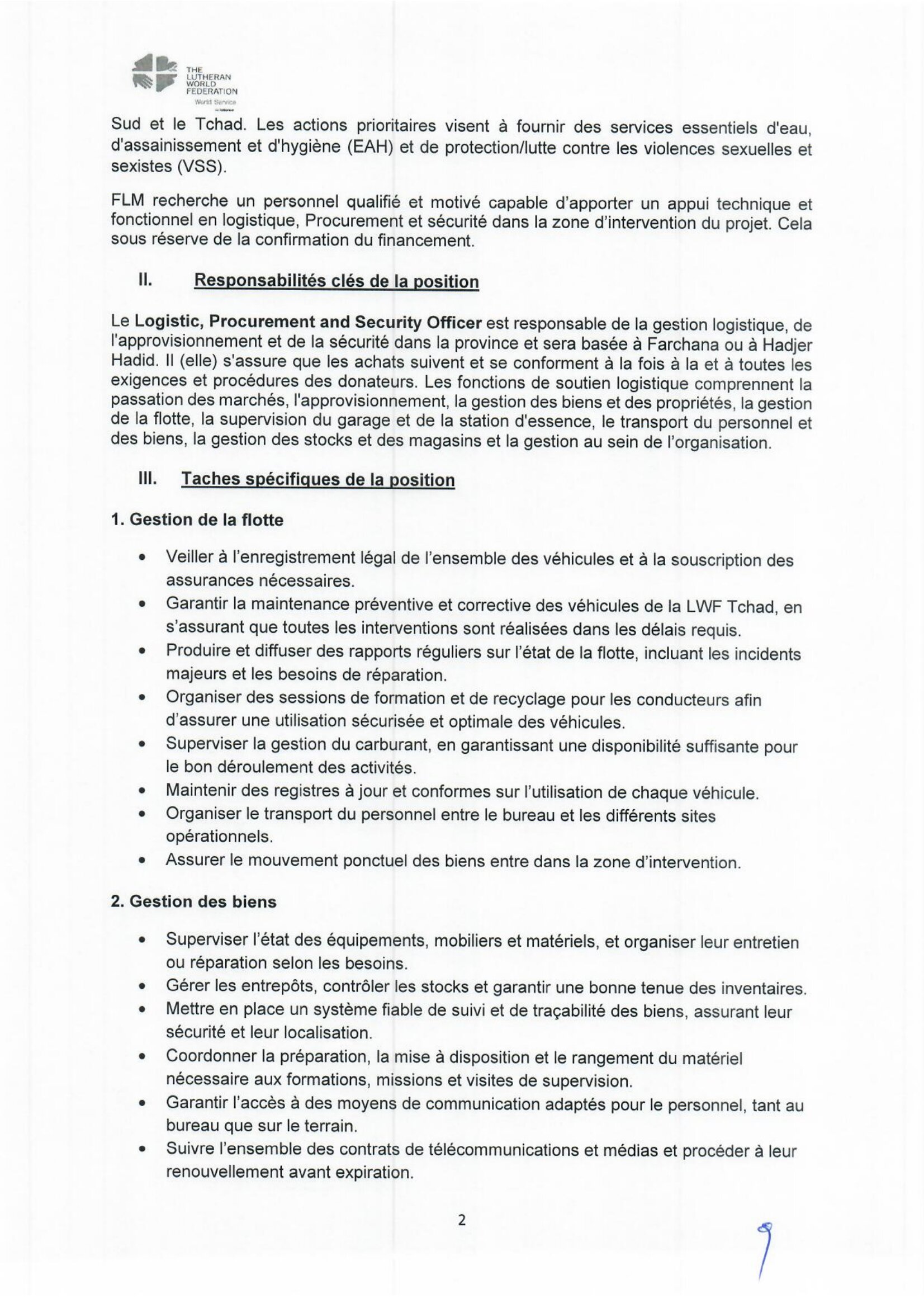 La Fédération Luthérienne Mondiale (FLM) recrute un Logistic, Procurement and Security Officer, Farchana, Tchad Avr 3, 2026 La Fédération Luthérienne Mondiale (FLM) recrute un Logistic, Procurement and Security Officer, Farchana, Tchad Share on FacebookTweetFollow usSaveLe Programme des Nations Unies pour l’environnement (PNUE) recherche un(e) stagiaire Assistant(e) Gouvernance Océanique, Nairobi, Kenya World Relief lance un avis de recrutement d’un responsable (H/F) Nutrition, Guéréda, Koursigué, TchadLe Bureau de l’OMS recrute un stagiaire pour le poste de gestion de projet, Congo-BrazzavilleLe cabinet CESERH organise une formation sur la planification des projets avec Ms Project, N’Djamena, Tchad