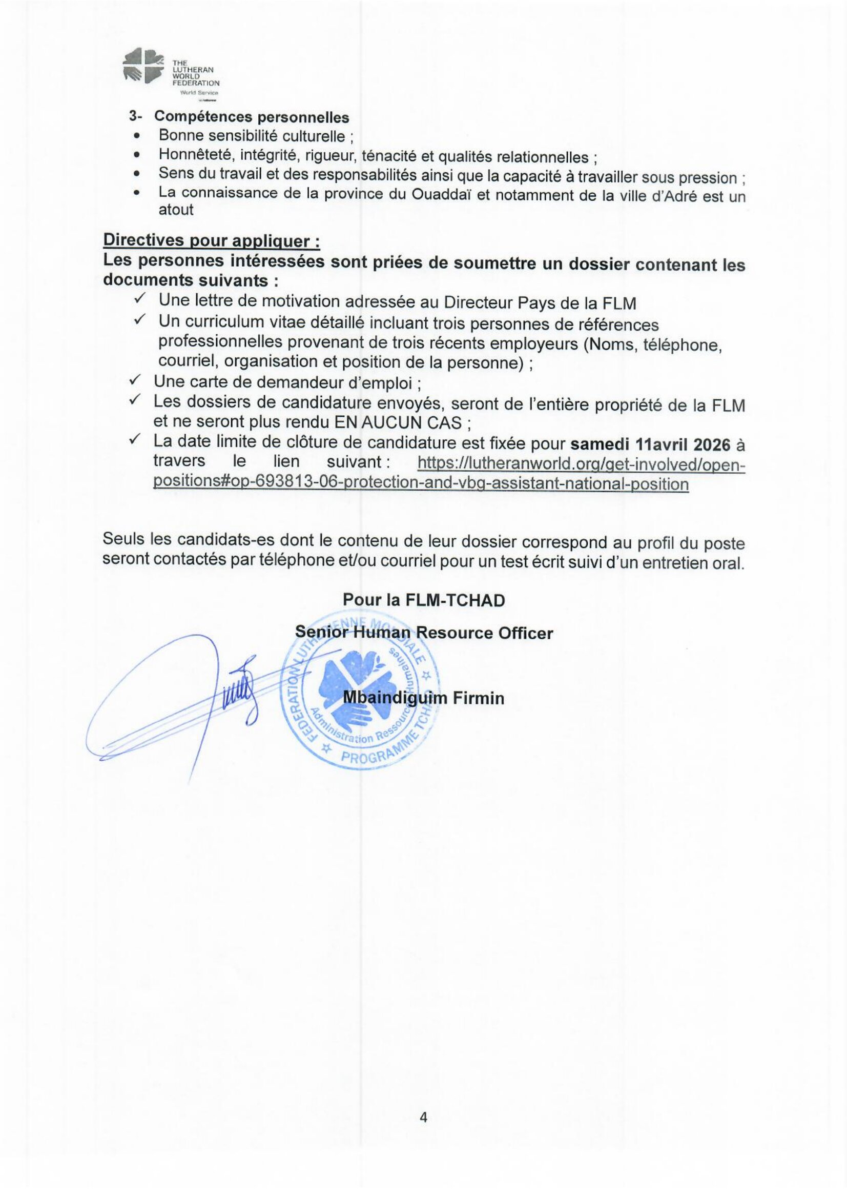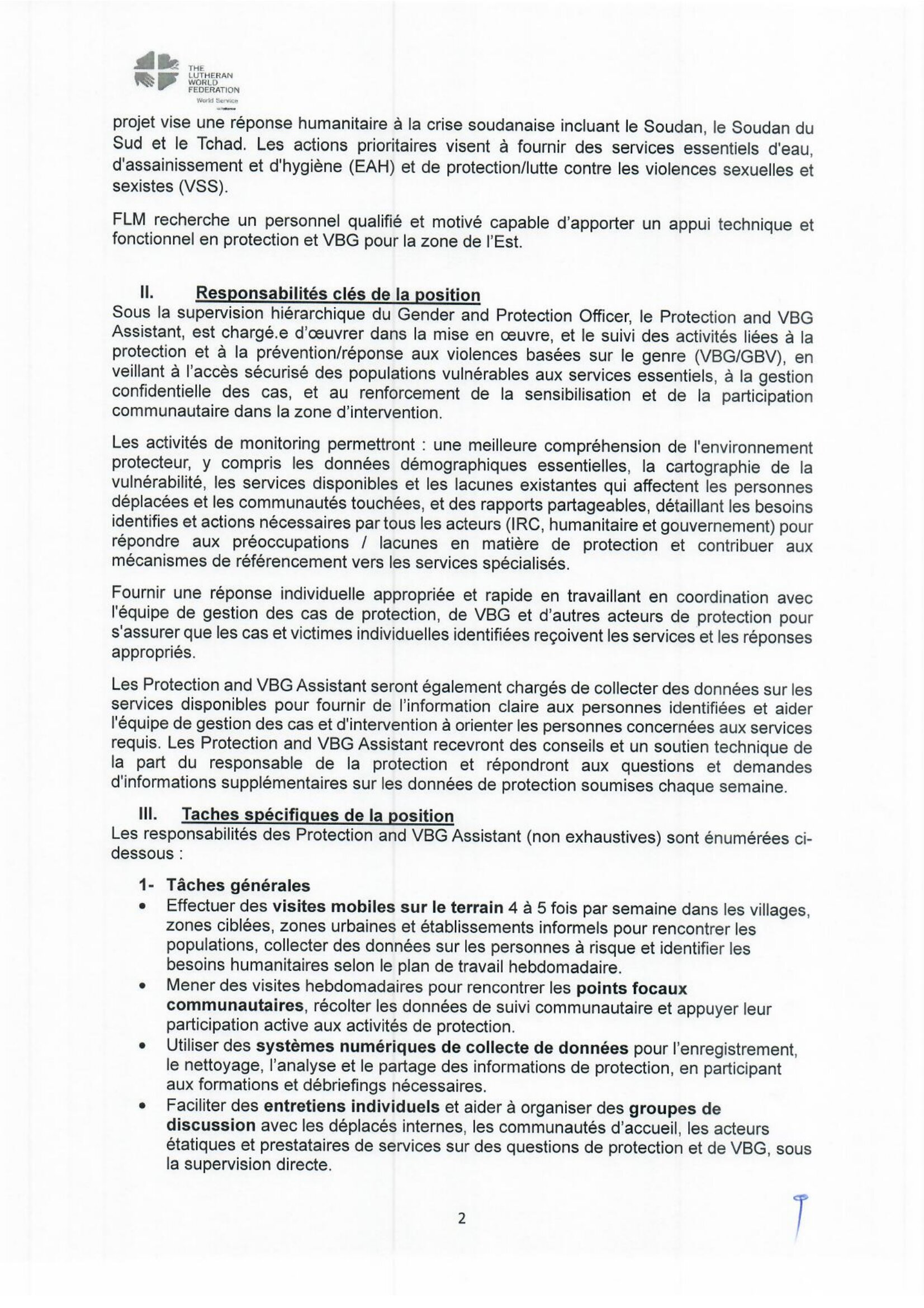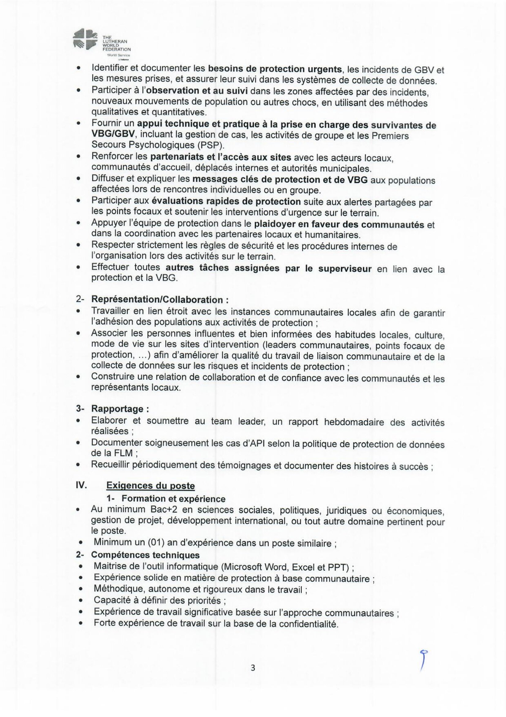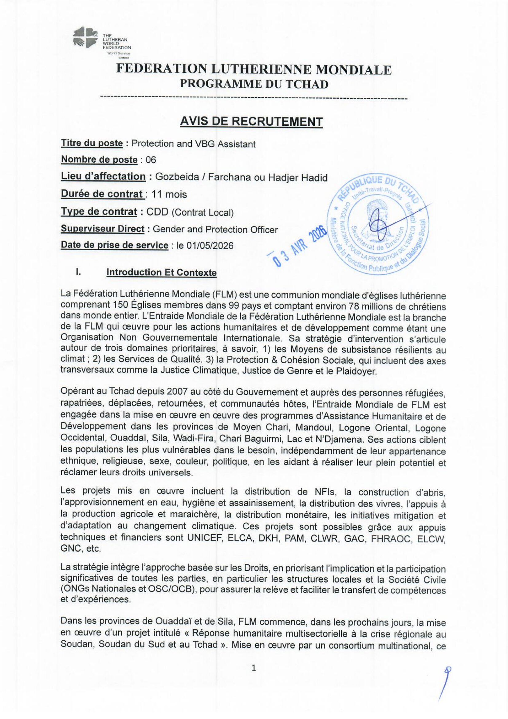 La Fédération Luthérienne Mondiale (FLM) recrute un Protection and VBG Assistant, Gozbeida ou Farchana, Tchad Avr 3, 2026 La Fédération Luthérienne Mondiale (FLM) recrute un Protection and VBG Assistant, Gozbeida ou Farchana, Tchad Share on FacebookTweetFollow usSaveSolidarité International (SI) recrute un stagiaire assistant rédaction & relations presse (H/F), Clichy, FranceAfrican Parks Network lance un avis d’appel à candidature/offre de fournisseur de service d’assuranceAfrican Parks Network recrute un Coordonnateur(ice) du programme d’Education Environnementale (EE), Tchad Le Consortium ACORD Tchad et ADI lancent un avis d’appel d’offre national pour la fourniture d’un véhicule Toyota Land-Cruiser 4×4 et de deux motos, N’Djamena, Tchad