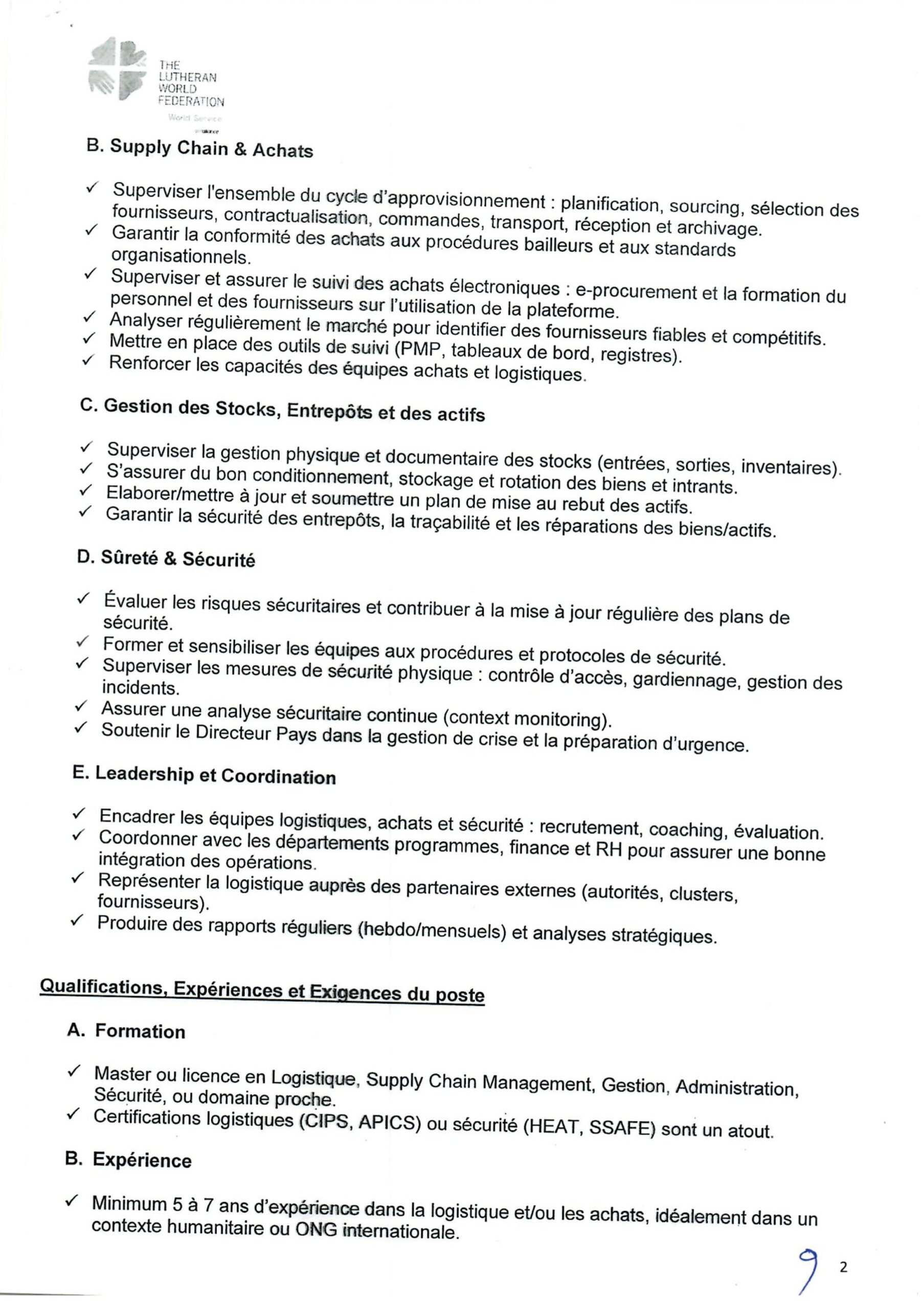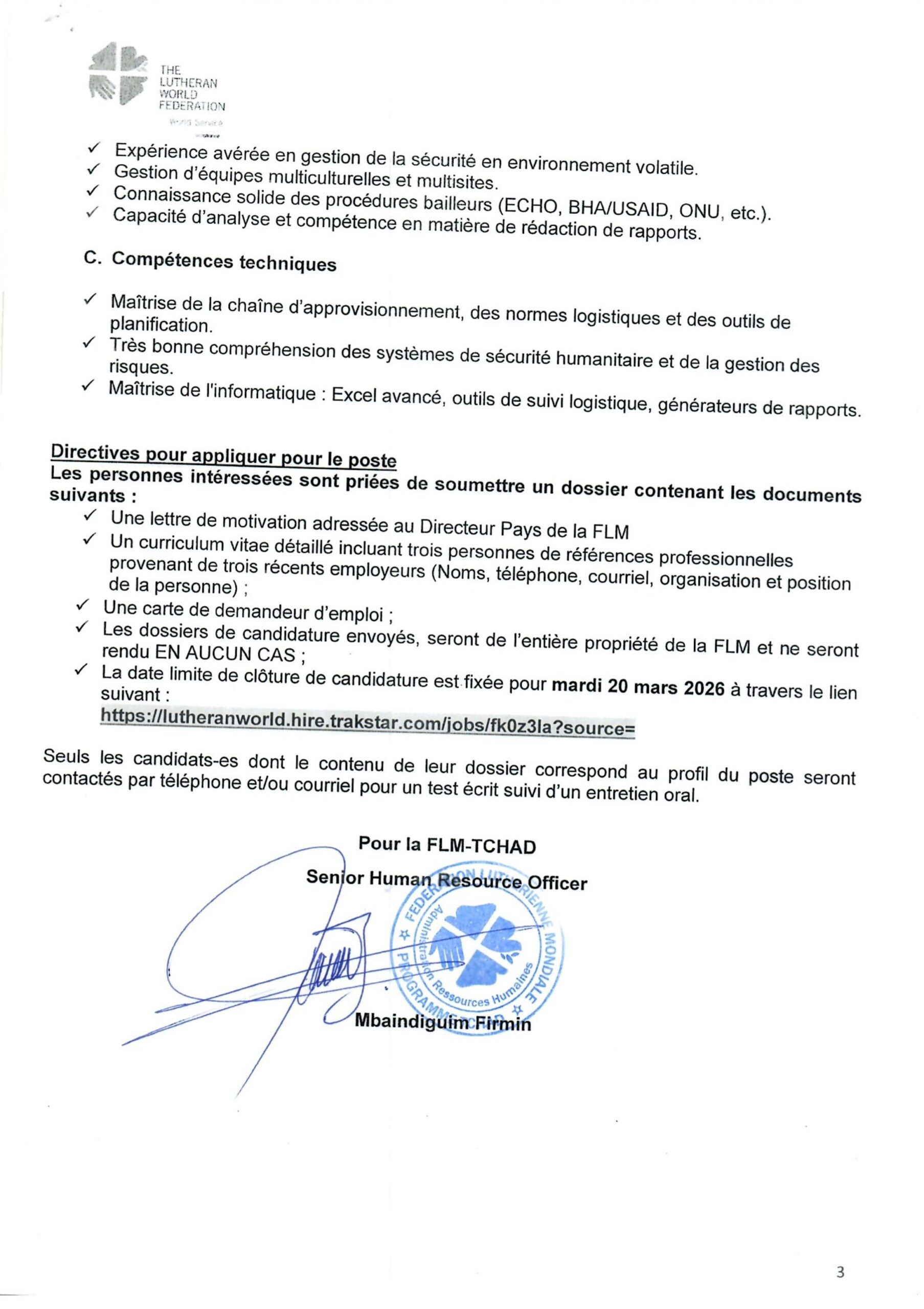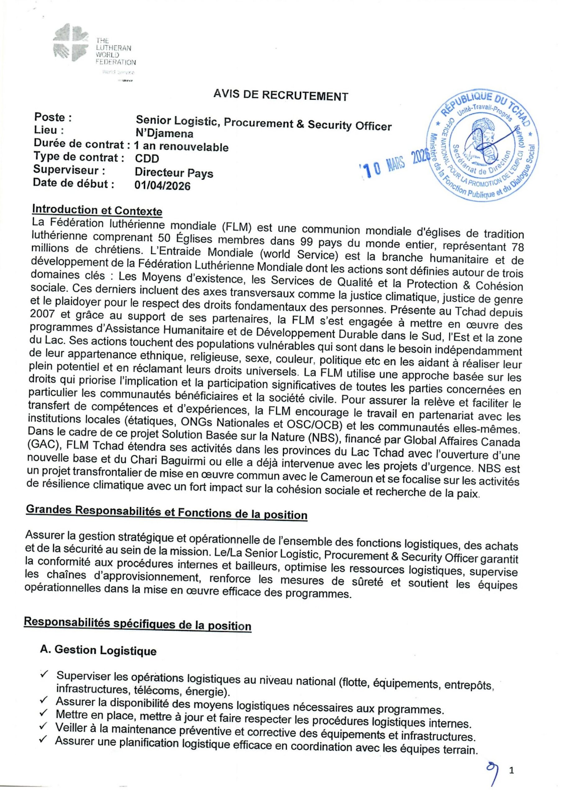La Fédération Luthérienne Mondiale recrute un Senior Logistic, Procurement & Security Officer, N’Djamena, Tchad Mar 10, 2026 La Fédération Luthérienne Mondiale recrute un Senior Logistic, Procurement & Security Officer, N’Djamena, Tchad Postuler ici Share on FacebookTweetFollow usSaveCRS recrute un chargé de projet restauration des terres (H/F), Bol, TchadLe Réseau Accès aux Médicaments Essentiels (RAME) lance un appel à candidatures pour le recrutement d’un(e) stagiaire en Suivi-évaluation et gestion des données, Ouagadougou, Burkina FasoCEFOREP SARL organise une formation sur le suivi et évaluation des projets, Kobo collect et SPSS, N’Djamena, Tchad Acted recrute un stagiaire en contrôle de gestion, Paris, France