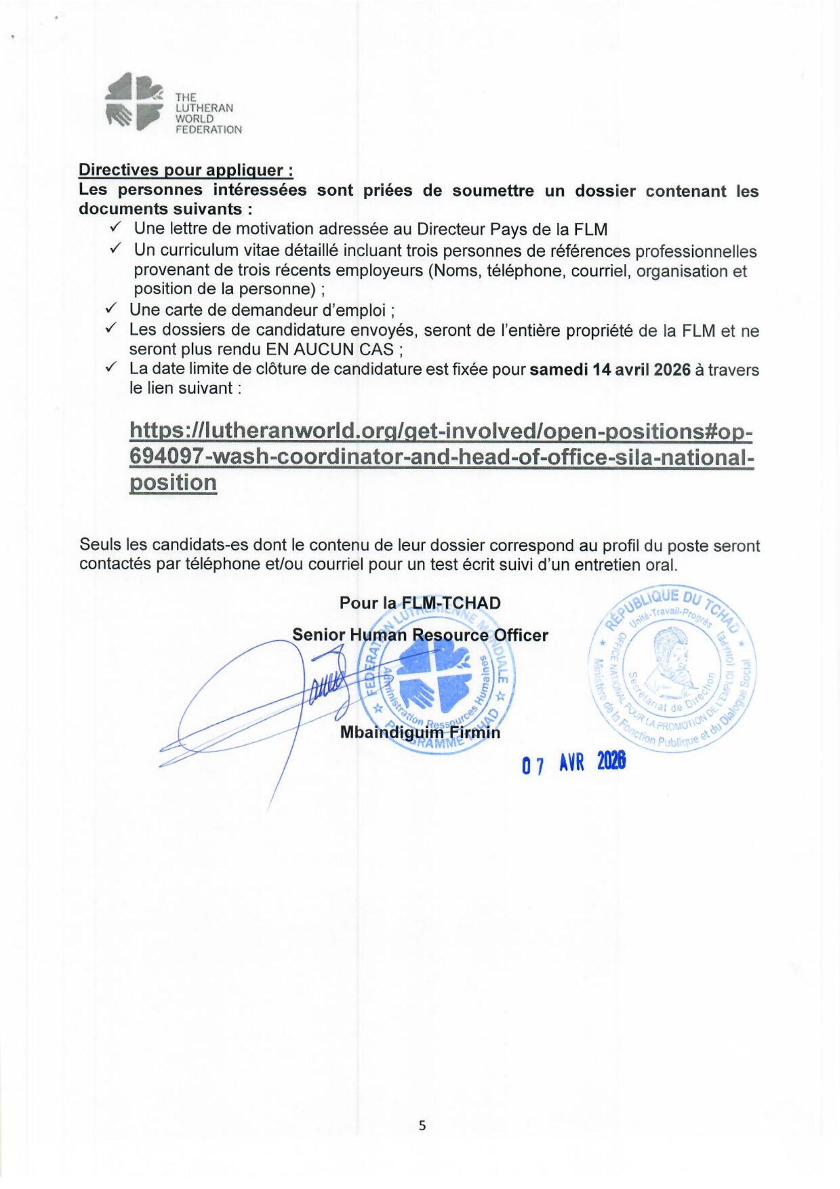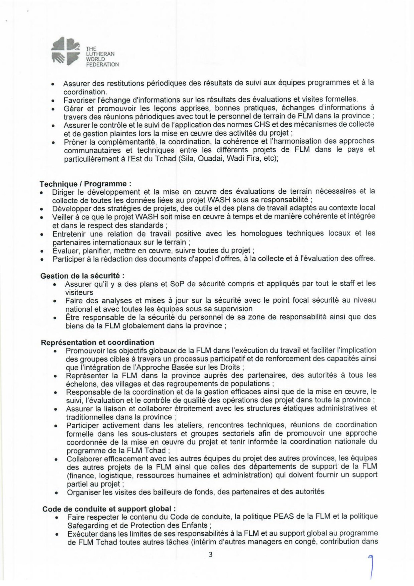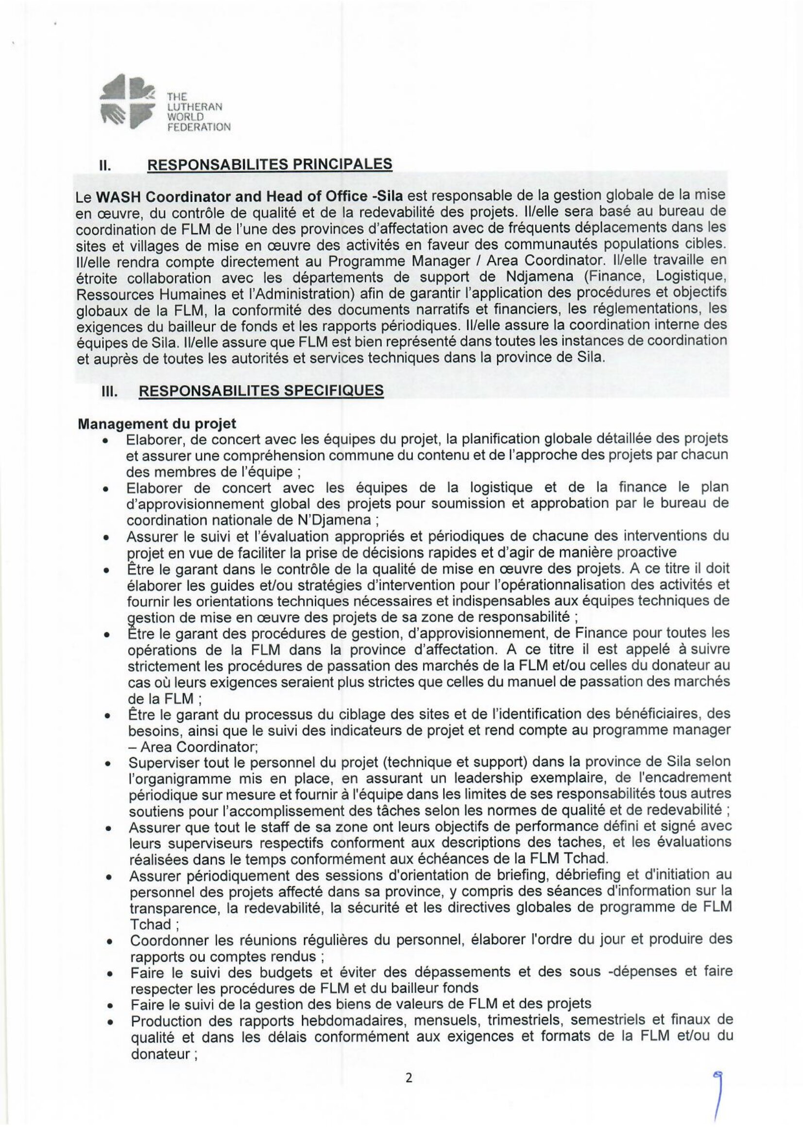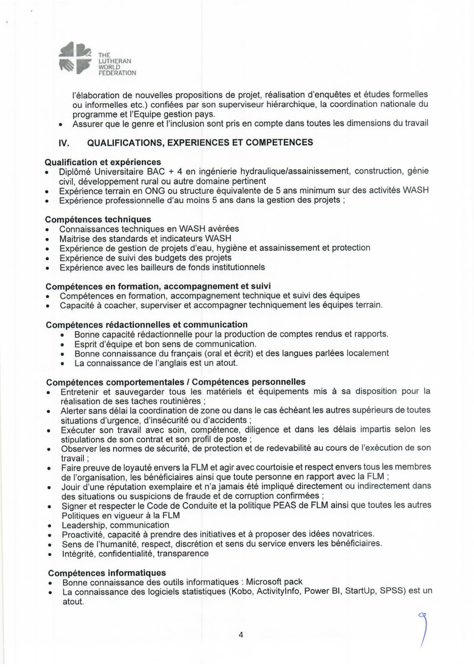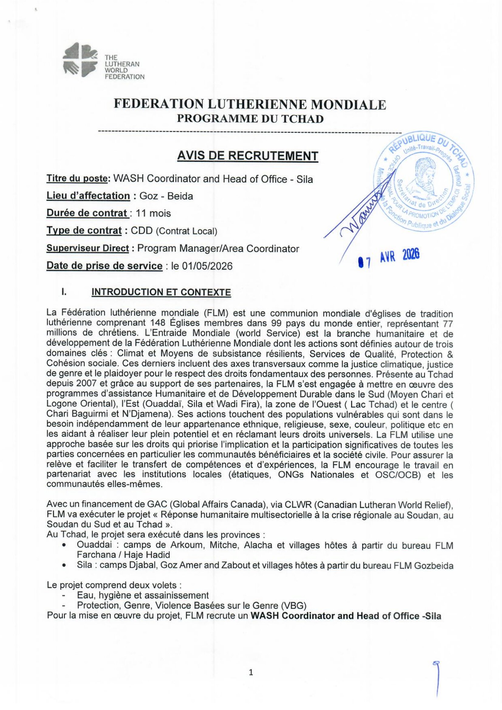 La Fédération Luthérienne Mondiale recrute un WASH Coordinator and Head of Office – Sila, Gozdeida, Tchad Avr 7, 2026 La Fédération Luthérienne Mondiale recrute un WASH Coordinator and Head of Office – Sila, Gozdeida, Tchad Postuler ici Share on FacebookTweetFollow usSaveDirection de l’Emploi recrute des stagiaires archivistes, Dakar, Sénégal L’Université du Kent lance un appel à candidatures pour les bourses mondiales, Royaume-Uni.Caritas Suisse lance un avis d’appel d’offre pour le recrutement d’un fournisseur pour la dotation des banques de céréales, Batha Ouest, Ouadi-Rimé, Tchad