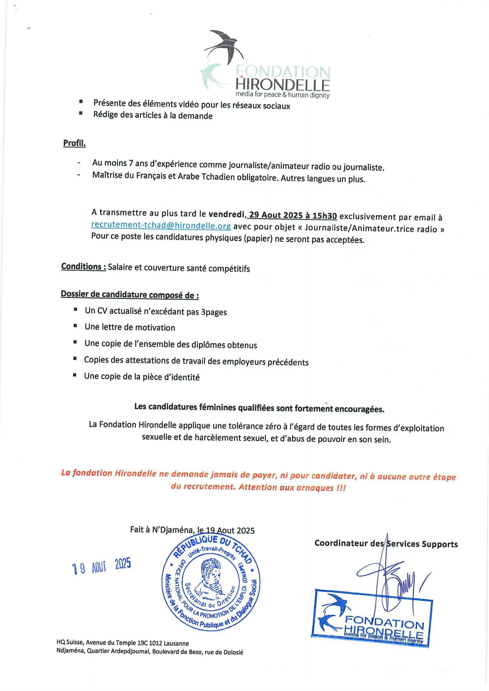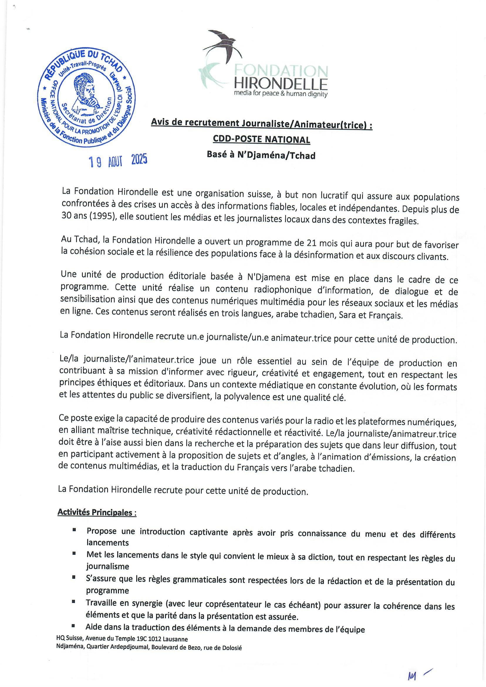 La Fondation Hirondelle recrute un journaliste/animateur (H/F), N’Djamena, Tchad