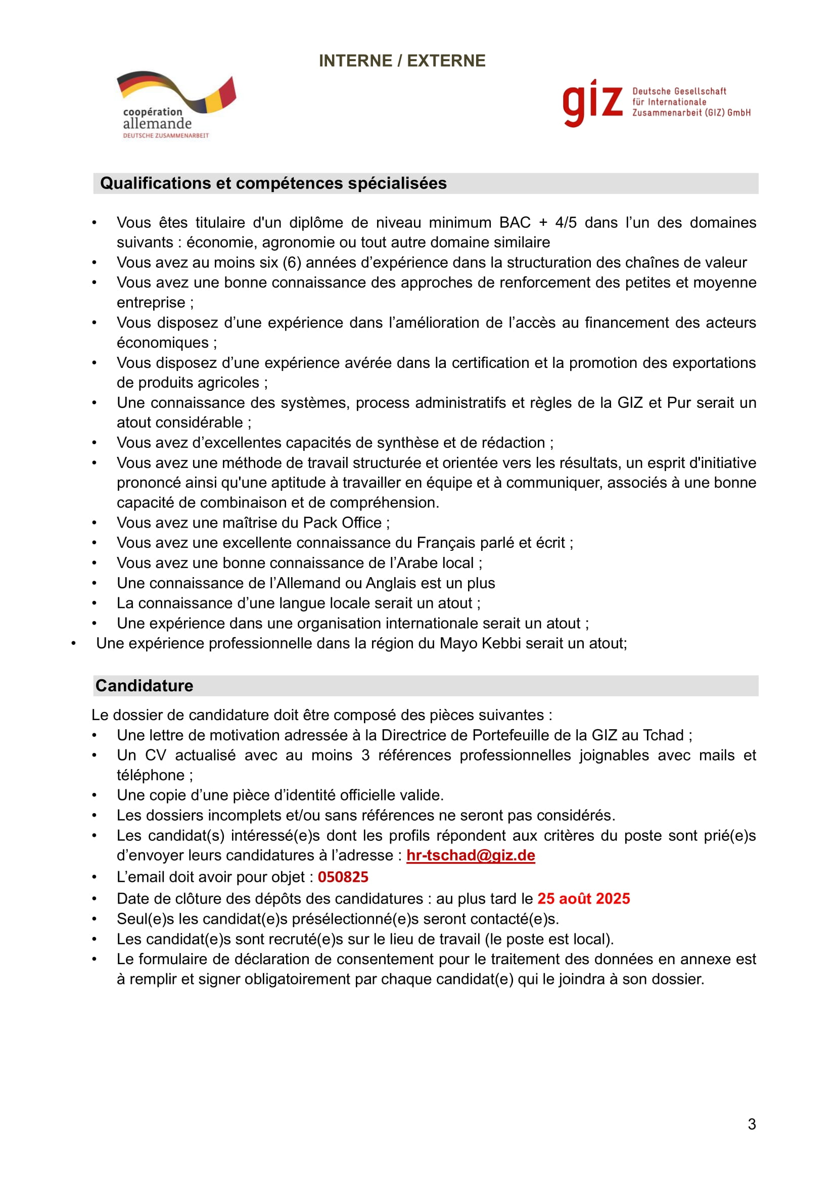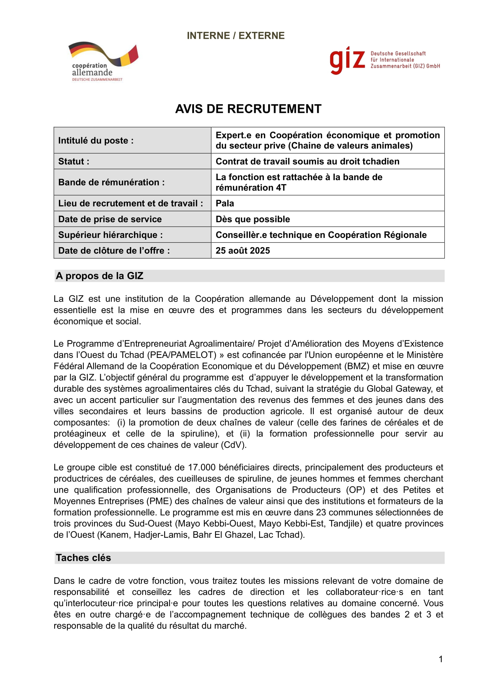 La GIZ lance le recrutement interne/externe d’un(e) expert(e) en coopération économique et promotion du secteur privé (chaine de valeurs animales), Pala, Tchad