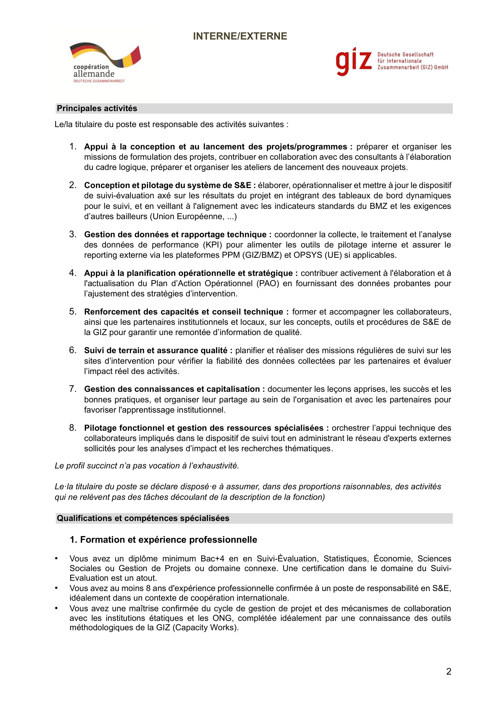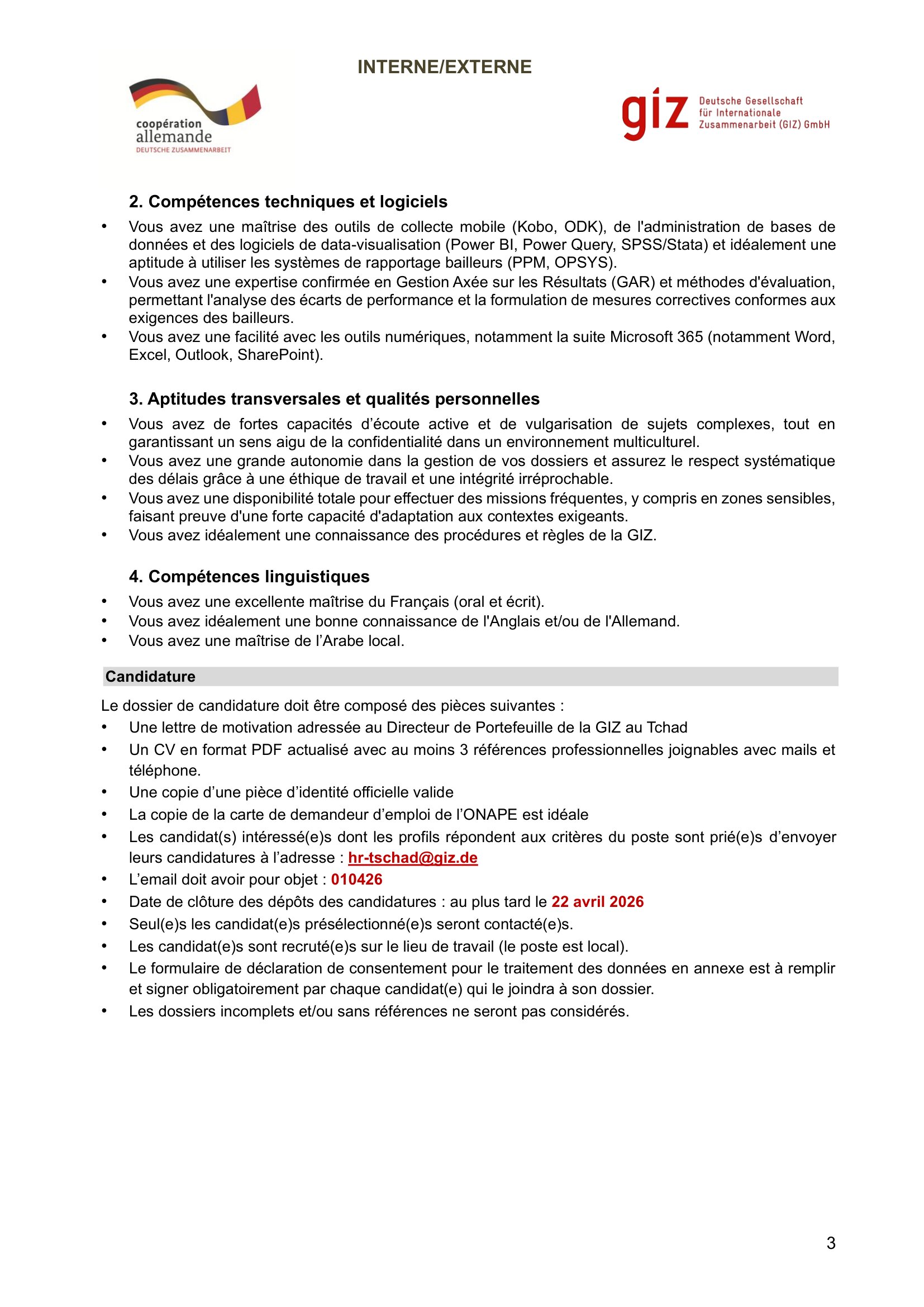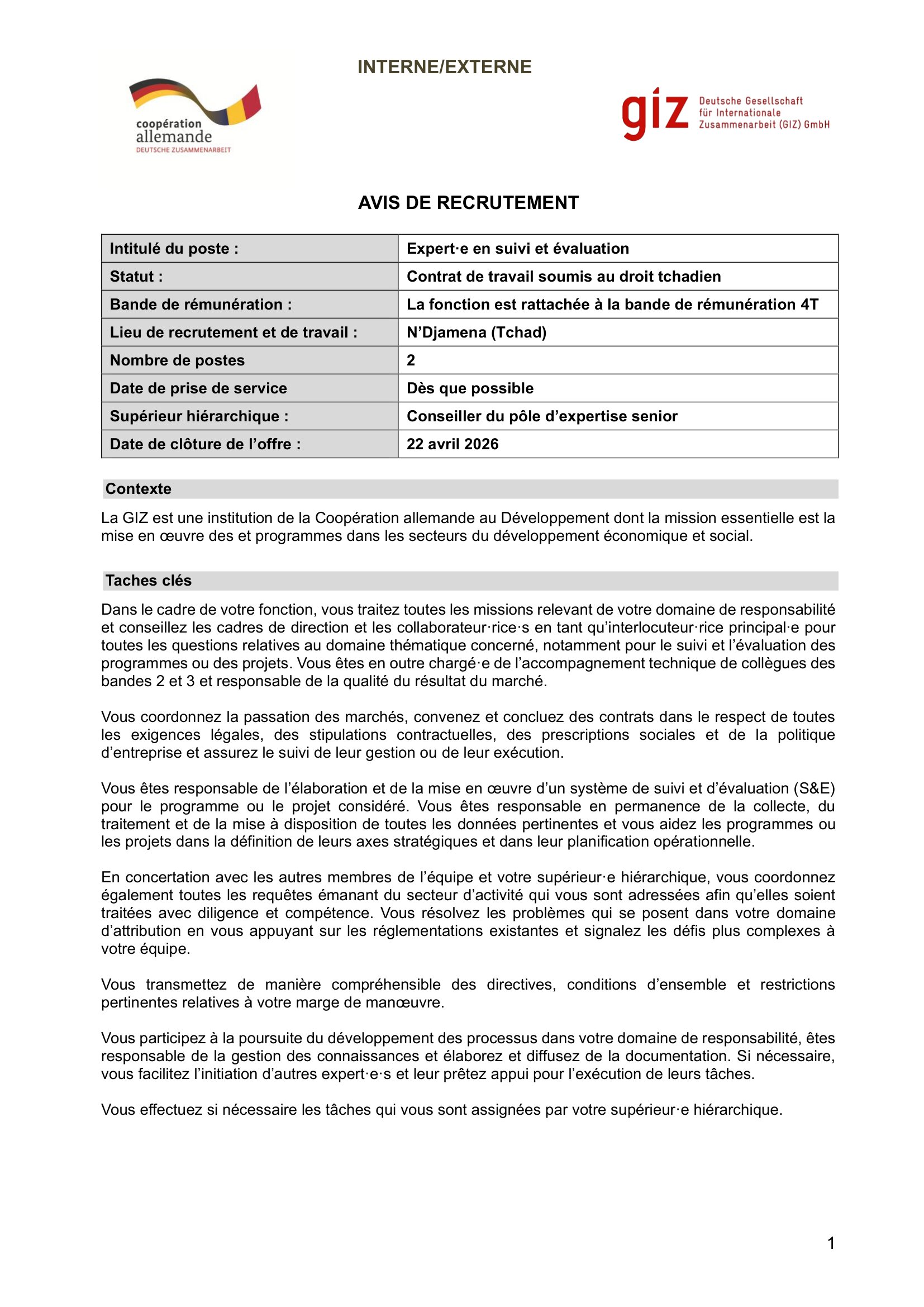 La GIZ lance un avis de recrutement interne/externe de deux (02) Expert en suivi et évaluation (H/F), N’Djamena, Tchad Avr 14, 2026 La GIZ lance un avis de recrutement interne/externe de deux (02) Expert en suivi et évaluation (H/F), N’Djamena, Tchad Share on FacebookTweetFollow usSaveLa Fédération Luthérienne Mondiale recrute un(e) assistant(e) terrain livelihood, Chari Baguirmi (Mandelia), TchadFIDIS INVEST organise une formation certifiante en techniques bancaires et financières, 100% en ligneACINA recrute un stagiaire en communication, (H/F), Paris, FranceLe Gret recherche un(e) stagiaire chargé(e) de mission formation, Nogent-sur-Marne, France