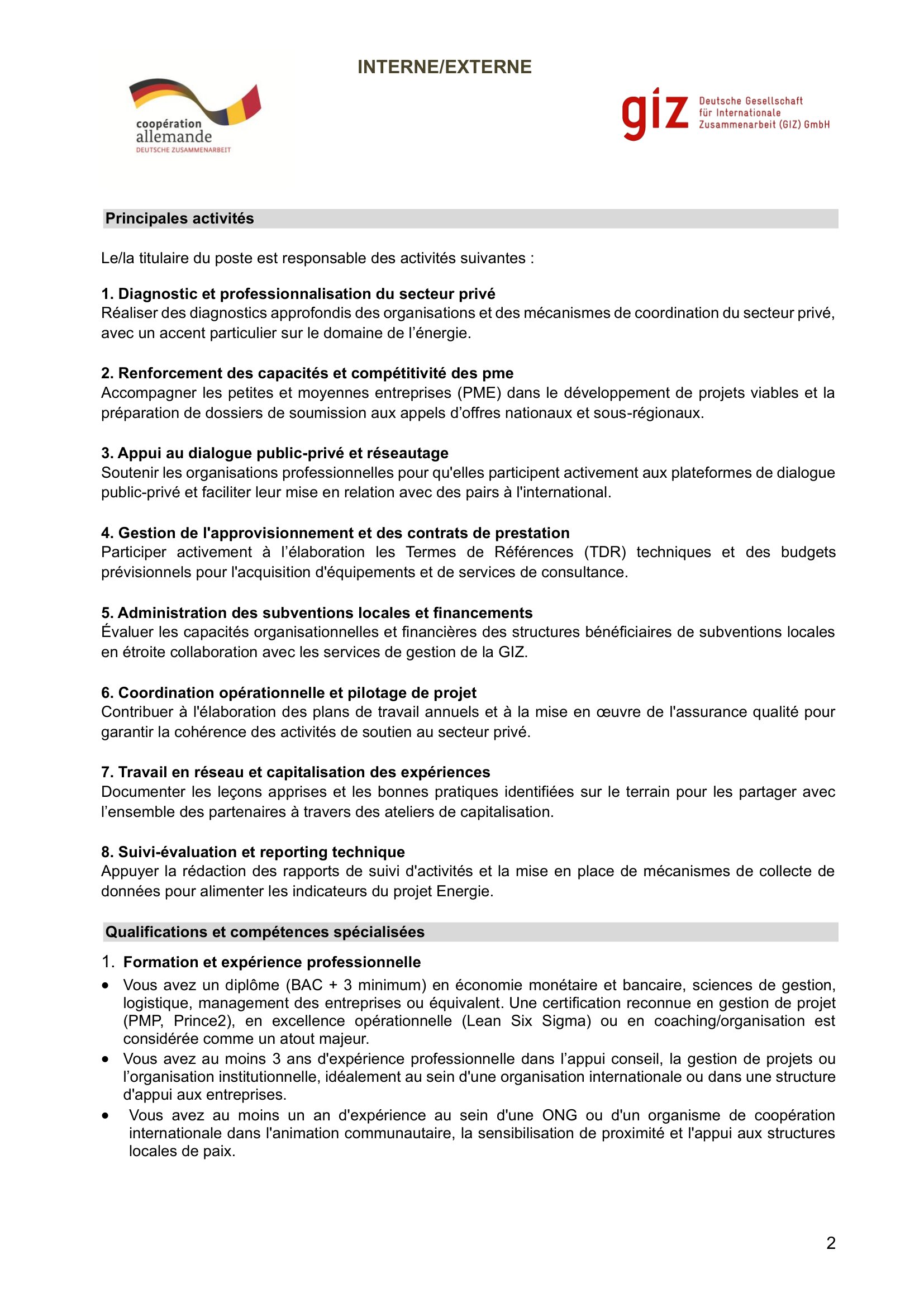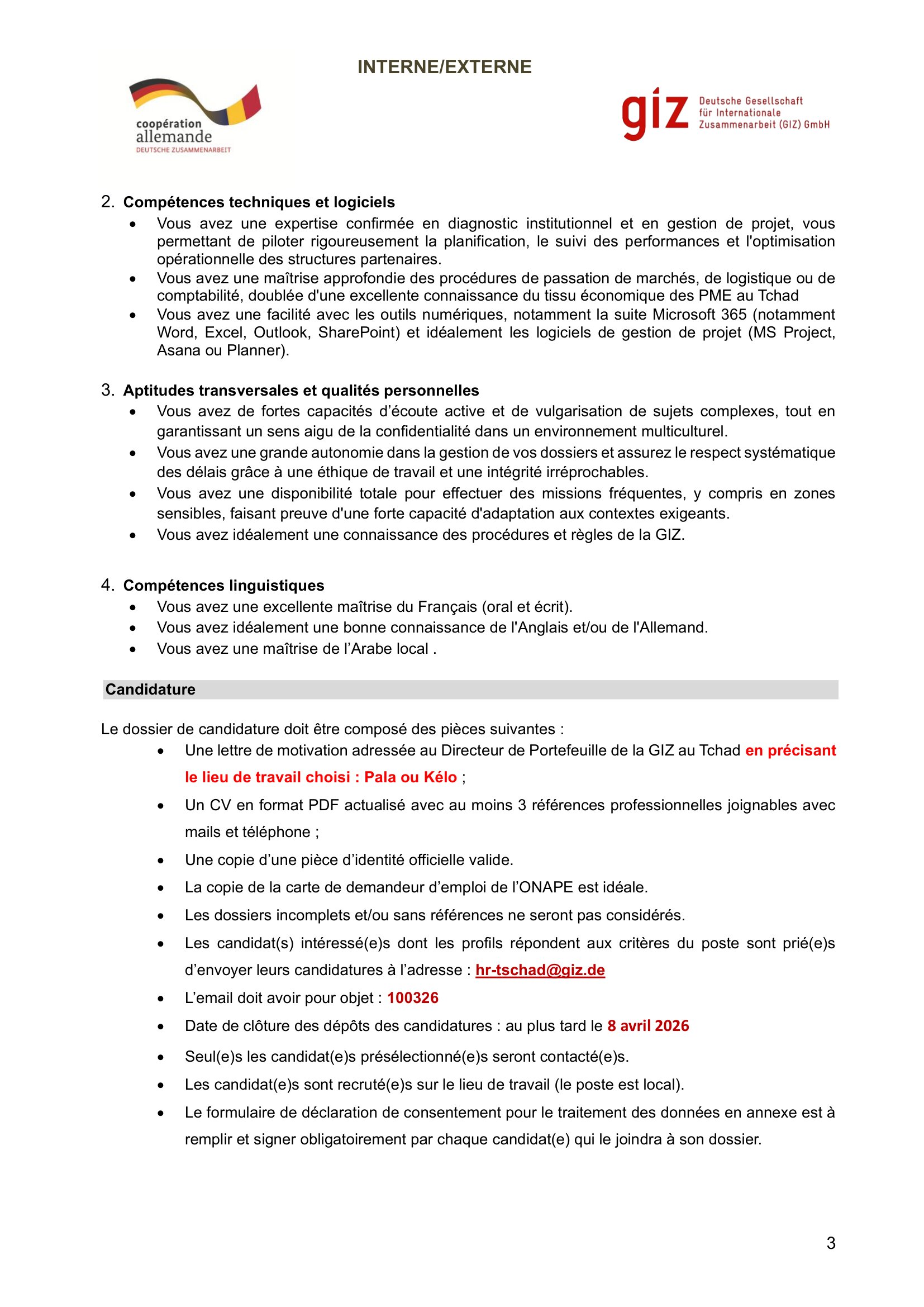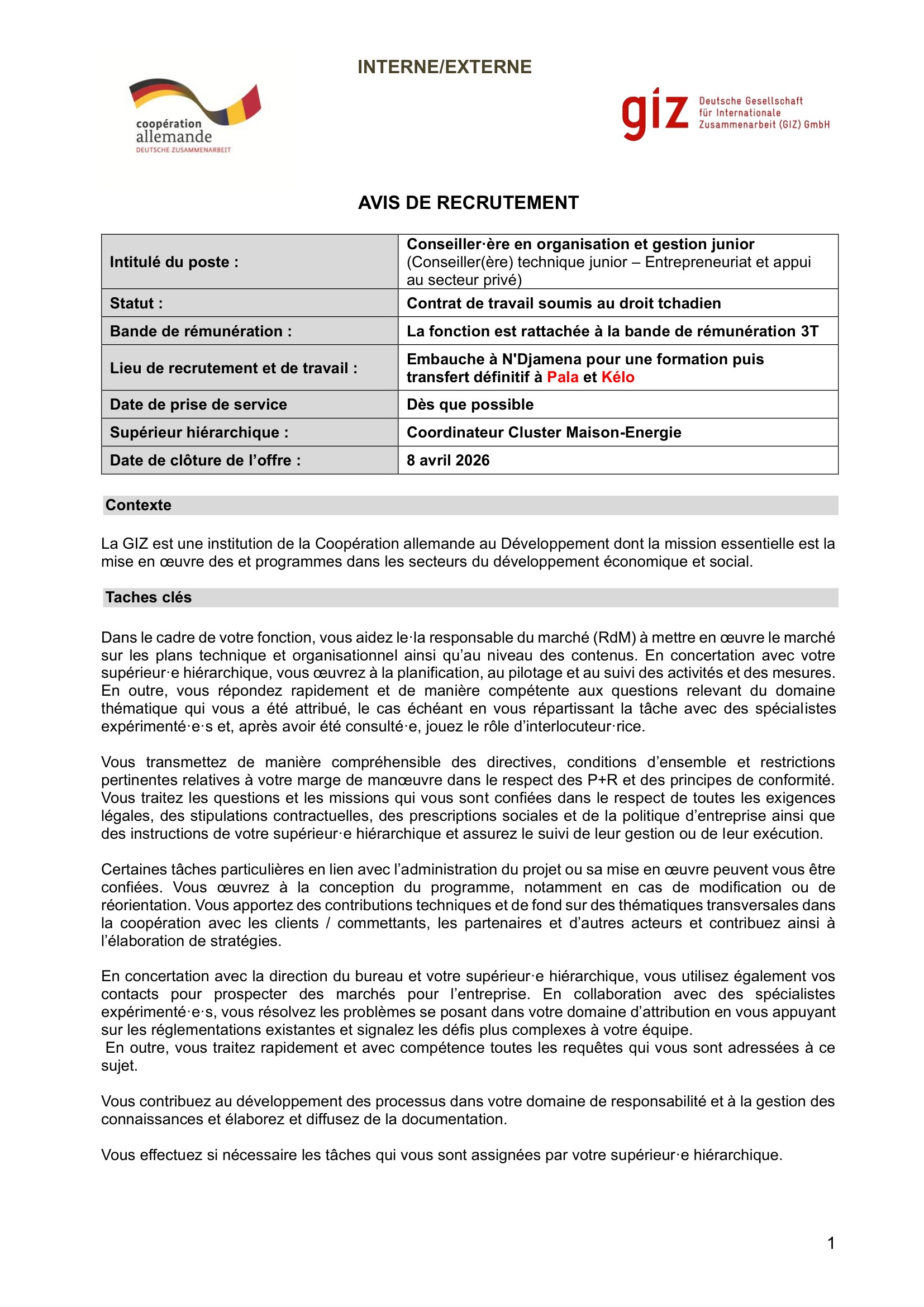 La GIZ recrute un Conseiller en organisation et gestion junior (H/F), Pala, Kélo, Tchad Avr 2, 2026 La GIZ recrute un Conseiller en organisation et gestion junior (H/F), Pala, Kélo, Tchad Share on FacebookTweetFollow usSaveInstitut mondial de la croissance verte (GGGI) recherche un(e) stagiaire en communication et partage des connaissances, Corée du SudAppel à candidature pour le programme de bourses ROK-KAU 2025 (entièrement financé), Corée du SudLe conseil norvégien pour les réfugiés recrute un(e) coordonnateur(trice) grants, N’Djamena, TchadThe Lutheran World Federation (LWF) is hiring Project Assistant, Fouli, Lac, Tchad