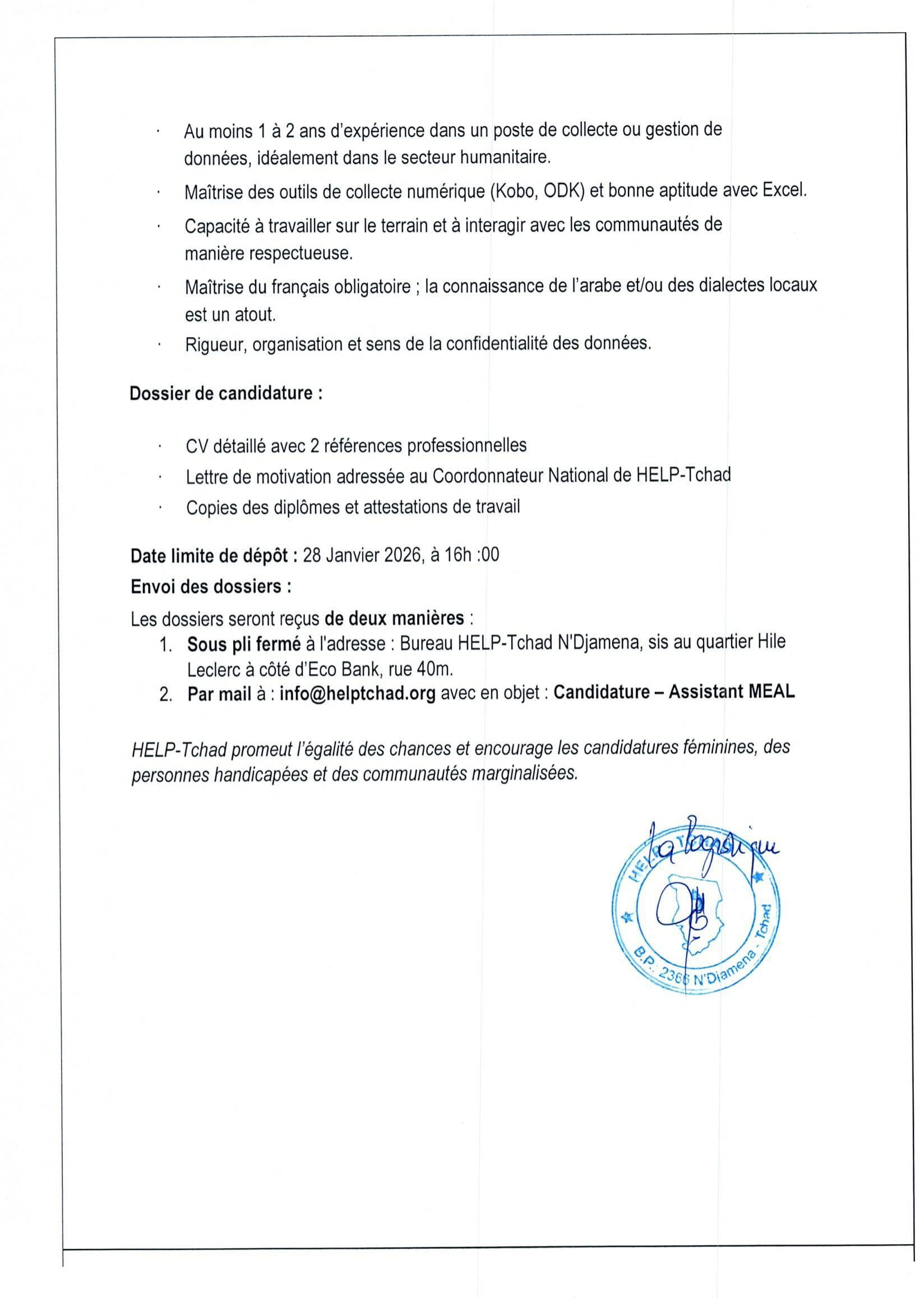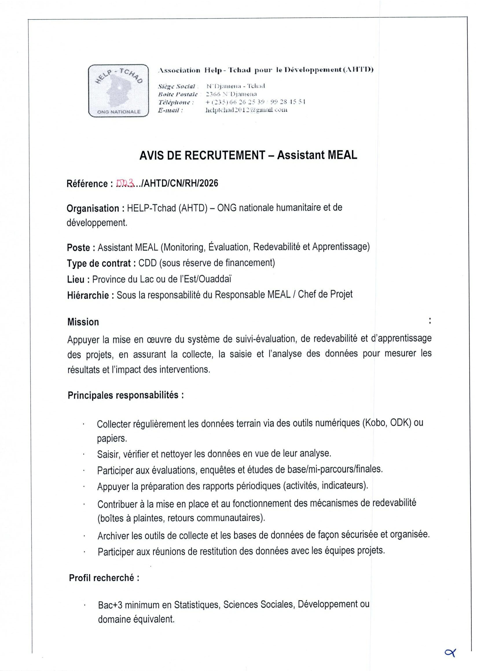 L’Association Help-Tchad pour le Développement (AHTD) recrute un Assistant MEAL (H/F), Province du Lac ou Ouaddaï, Tchad Jan 20, 2026 L’Association Help-Tchad pour le Développement (AHTD) recrute un Assistant MEAL (H/F), Province du Lac ou Ouaddaï, Tchad Share on FacebookTweetFollow usSaveCRS recrute un chargé de projet restauration des terres (H/F), Bol, TchadLe Réseau Accès aux Médicaments Essentiels (RAME) lance un appel à candidatures pour le recrutement d’un(e) stagiaire en Suivi-évaluation et gestion des données, Ouagadougou, Burkina FasoCEFOREP SARL organise une formation sur le suivi et évaluation des projets, Kobo collect et SPSS, N’Djamena, Tchad Acted recrute un stagiaire en contrôle de gestion, Paris, France